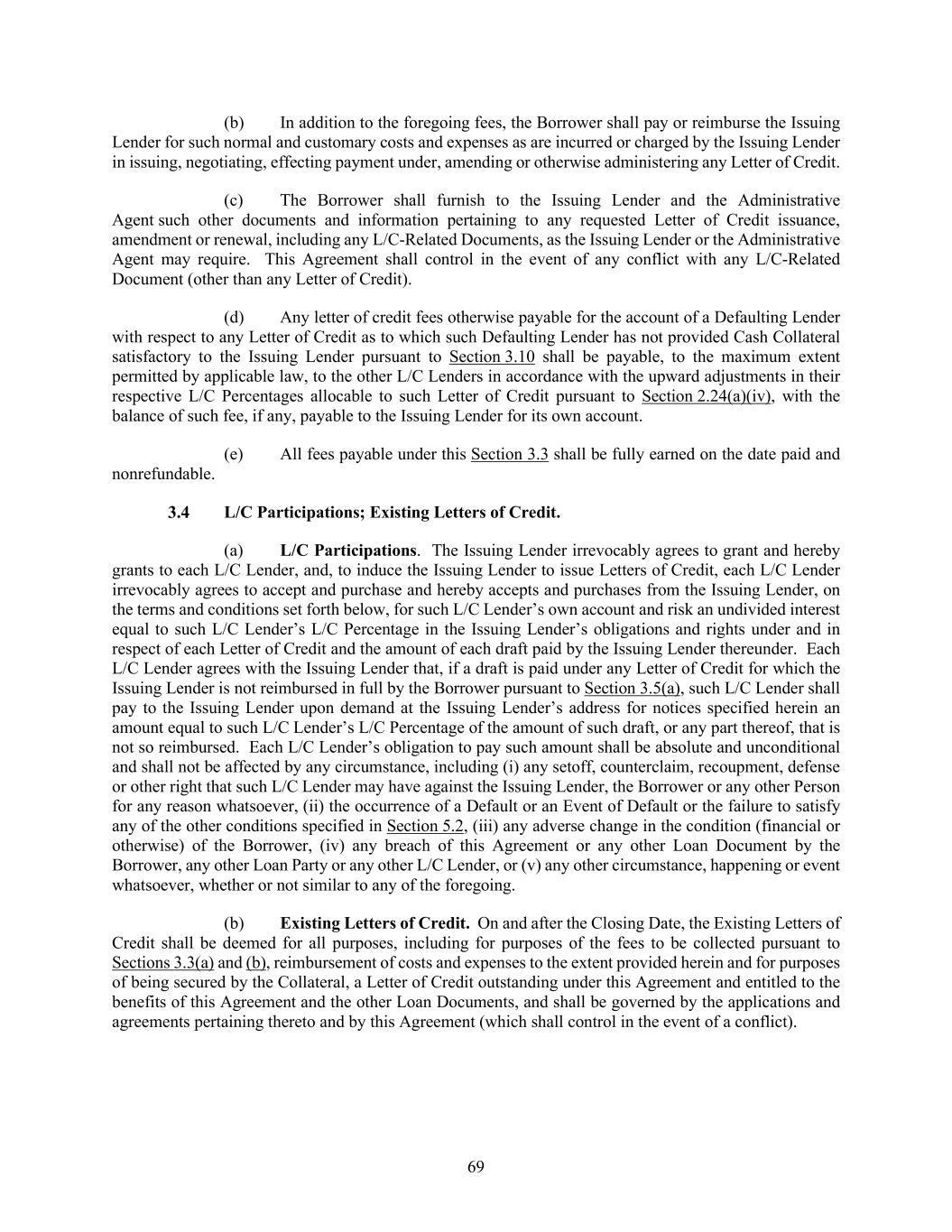 69 (b) In addition to the foregoing fees, the Borrower shall pay or reimburse the Issuing Lender for such normal and customary costs and expenses as are incurred or charged by the Issuing Lender in issuing, negotiating, effecting payment under, amending or otherwise administering any Letter of Credit. (c) The Borrower shall furnish to the Issuing Lender and the Administrative Agent such other documents and information pertaining to any requested Letter of Credit issuance, amendment or renewal, including any L/C-Related Documents, as the Issuing Lender or the Administrative Agent may require. This Agreement shall control in the event of any conflict with any L/C-Related Document (other than any Letter of Credit). (d) Any letter of credit fees otherwise payable for the account of a Defaulting Lender with respect to any Letter of Credit as to which such Defaulting Lender has not provided Cash Collateral satisfactory to the Issuing Lender pursuant to Section 3.10 shall be payable, to the maximum extent permitted by applicable law, to the other L/C Lenders in accordance with the upward adjustments in their respective L/C Percentages allocable to such Letter of Credit pursuant to Section 2.24(a)(iv), with the balance of such fee, if any, payable to the Issuing Lender for its own account. (e) All fees payable under this Section 3.3 shall be fully earned on the date paid and nonrefundable. L/C Participations; Existing Letters of Credit. (a) L/C Participations. The Issuing Lender irrevocably agrees to grant and hereby grants to each L/C Lender, and, to induce the Issuing Lender to issue Letters of Credit, each L/C Lender irrevocably agrees to accept and purchase and hereby accepts and purchases from the Issuing Lender, on the terms and conditions set forth below, for such L/C Lender’s own account and risk an undivided interest equal to such L/C Lender’s L/C Percentage in the Issuing Lender’s obligations and rights under and in respect of each Letter of Credit and the amount of each draft paid by the Issuing Lender thereunder. Each L/C Lender agrees with the Issuing Lender that, if a draft is paid under any Letter of Credit for which the Issuing Lender is not reimbursed in full by the Borrower pursuant to Section 3.5(a), such L/C Lender shall pay to the Issuing Lender upon demand at the Issuing Lender’s address for notices specified herein an amount equal to such L/C Lender’s L/C Percentage of the amount of such draft, or any part thereof, that is not so reimbursed. Each L/C Lender’s obligation to pay such amount shall be absolute and unconditional and shall not be affected by any circumstance, including (i) any setoff, counterclaim, recoupment, defense or other right that such L/C Lender may have against the Issuing Lender, the Borrower or any other Person for any reason whatsoever, (ii) the occurrence of a Default or an Event of Default or the failure to satisfy any of the other conditions specified in Section 5.2, (iii) any adverse change in the condition (financial or otherwise) of the Borrower, (iv) any breach of this Agreement or any other Loan Document by the Borrower, any other Loan Party or any other L/C Lender, or (v) any other circumstance, happening or event whatsoever, whether or not similar to any of the foregoing. (b) Existing Letters of Credit. On and after the Closing Date, the Existing Letters of Credit shall be deemed for all purposes, including for purposes of the fees to be collected pursuant to Sections 3.3(a) and (b), reimbursement of costs and expenses to the extent provided herein and for purposes of being secured by the Collateral, a Letter of Credit outstanding under this Agreement and entitled to the benefits of this Agreement and the other Loan Documents, and shall be governed by the applications and agreements pertaining thereto and by this Agreement (which shall control in the event of a conflict).