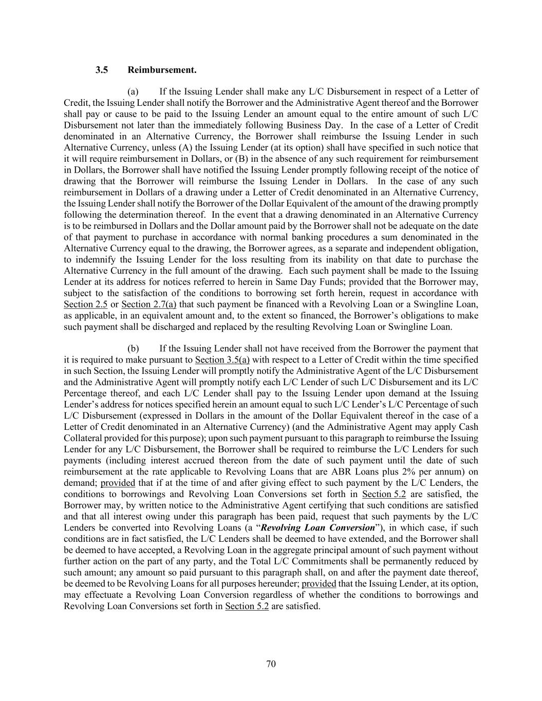 70 Reimbursement. (a) If the Issuing Lender shall make any L/C Disbursement in respect of a Letter of Credit, the Issuing Lender shall notify the Borrower and the Administrative Agent thereof and the Borrower shall pay or cause to be paid to the Issuing Lender an amount equal to the entire amount of such L/C Disbursement not later than the immediately following Business Day. In the case of a Letter of Credit denominated in an Alternative Currency, the Borrower shall reimburse the Issuing Lender in such Alternative Currency, unless (A) the Issuing Lender (at its option) shall have specified in such notice that it will require reimbursement in Dollars, or (B) in the absence of any such requirement for reimbursement in Dollars, the Borrower shall have notified the Issuing Lender promptly following receipt of the notice of drawing that the Borrower will reimburse the Issuing Lender in Dollars. In the case of any such reimbursement in Dollars of a drawing under a Letter of Credit denominated in an Alternative Currency, the Issuing Lender shall notify the Borrower of the Dollar Equivalent of the amount of the drawing promptly following the determination thereof. In the event that a drawing denominated in an Alternative Currency is to be reimbursed in Dollars and the Dollar amount paid by the Borrower shall not be adequate on the date of that payment to purchase in accordance with normal banking procedures a sum denominated in the Alternative Currency equal to the drawing, the Borrower agrees, as a separate and independent obligation, to indemnify the Issuing Lender for the loss resulting from its inability on that date to purchase the Alternative Currency in the full amount of the drawing. Each such payment shall be made to the Issuing Lender at its address for notices referred to herein in Same Day Funds; provided that the Borrower may, subject to the satisfaction of the conditions to borrowing set forth herein, request in accordance with Section 2.5 or Section 2.7(a) that such payment be financed with a Revolving Loan or a Swingline Loan, as applicable, in an equivalent amount and, to the extent so financed, the Borrower’s obligations to make such payment shall be discharged and replaced by the resulting Revolving Loan or Swingline Loan. (b) If the Issuing Lender shall not have received from the Borrower the payment that it is required to make pursuant to Section 3.5(a) with respect to a Letter of Credit within the time specified in such Section, the Issuing Lender will promptly notify the Administrative Agent of the L/C Disbursement and the Administrative Agent will promptly notify each L/C Lender of such L/C Disbursement and its L/C Percentage thereof, and each L/C Lender shall pay to the Issuing Lender upon demand at the Issuing Lender’s address for notices specified herein an amount equal to such L/C Lender’s L/C Percentage of such L/C Disbursement (expressed in Dollars in the amount of the Dollar Equivalent thereof in the case of a Letter of Credit denominated in an Alternative Currency) (and the Administrative Agent may apply Cash Collateral provided for this purpose); upon such payment pursuant to this paragraph to reimburse the Issuing Lender for any L/C Disbursement, the Borrower shall be required to reimburse the L/C Lenders for such payments (including interest accrued thereon from the date of such payment until the date of such reimbursement at the rate applicable to Revolving Loans that are ABR Loans plus 2% per annum) on demand; provided that if at the time of and after giving effect to such payment by the L/C Lenders, the conditions to borrowings and Revolving Loan Conversions set forth in Section 5.2 are satisfied, the Borrower may, by written notice to the Administrative Agent certifying that such conditions are satisfied and that all interest owing under this paragraph has been paid, request that such payments by the L/C Lenders be converted into Revolving Loans (a “Revolving Loan Conversion”), in which case, if such conditions are in fact satisfied, the L/C Lenders shall be deemed to have extended, and the Borrower shall be deemed to have accepted, a Revolving Loan in the aggregate principal amount of such payment without further action on the part of any party, and the Total L/C Commitments shall be permanently reduced by such amount; any amount so paid pursuant to this paragraph shall, on and after the payment date thereof, be deemed to be Revolving Loans for all purposes hereunder; provided that the Issuing Lender, at its option, may effectuate a Revolving Loan Conversion regardless of whether the conditions to borrowings and Revolving Loan Conversions set forth in Section 5.2 are satisfied.