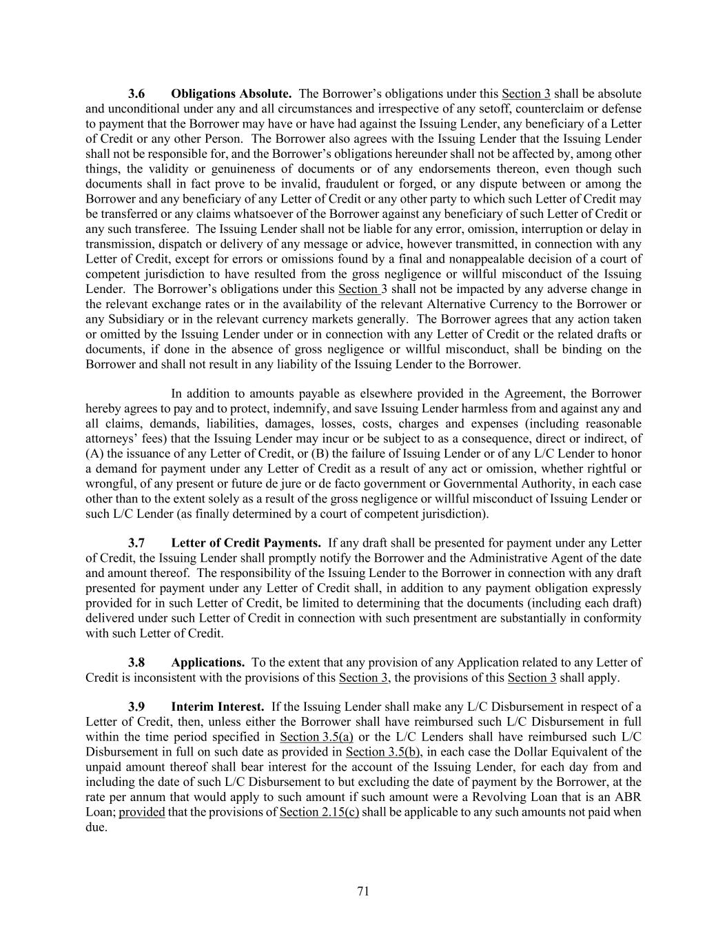 71 Obligations Absolute. The Borrower’s obligations under this Section 3 shall be absolute and unconditional under any and all circumstances and irrespective of any setoff, counterclaim or defense to payment that the Borrower may have or have had against the Issuing Lender, any beneficiary of a Letter of Credit or any other Person. The Borrower also agrees with the Issuing Lender that the Issuing Lender shall not be responsible for, and the Borrower’s obligations hereunder shall not be affected by, among other things, the validity or genuineness of documents or of any endorsements thereon, even though such documents shall in fact prove to be invalid, fraudulent or forged, or any dispute between or among the Borrower and any beneficiary of any Letter of Credit or any other party to which such Letter of Credit may be transferred or any claims whatsoever of the Borrower against any beneficiary of such Letter of Credit or any such transferee. The Issuing Lender shall not be liable for any error, omission, interruption or delay in transmission, dispatch or delivery of any message or advice, however transmitted, in connection with any Letter of Credit, except for errors or omissions found by a final and nonappealable decision of a court of competent jurisdiction to have resulted from the gross negligence or willful misconduct of the Issuing Lender. The Borrower’s obligations under this Section 3 shall not be impacted by any adverse change in the relevant exchange rates or in the availability of the relevant Alternative Currency to the Borrower or any Subsidiary or in the relevant currency markets generally. The Borrower agrees that any action taken or omitted by the Issuing Lender under or in connection with any Letter of Credit or the related drafts or documents, if done in the absence of gross negligence or willful misconduct, shall be binding on the Borrower and shall not result in any liability of the Issuing Lender to the Borrower. In addition to amounts payable as elsewhere provided in the Agreement, the Borrower hereby agrees to pay and to protect, indemnify, and save Issuing Lender harmless from and against any and all claims, demands, liabilities, damages, losses, costs, charges and expenses (including reasonable attorneys’ fees) that the Issuing Lender may incur or be subject to as a consequence, direct or indirect, of (A) the issuance of any Letter of Credit, or (B) the failure of Issuing Lender or of any L/C Lender to honor a demand for payment under any Letter of Credit as a result of any act or omission, whether rightful or wrongful, of any present or future de jure or de facto government or Governmental Authority, in each case other than to the extent solely as a result of the gross negligence or willful misconduct of Issuing Lender or such L/C Lender (as finally determined by a court of competent jurisdiction). Letter of Credit Payments. If any draft shall be presented for payment under any Letter of Credit, the Issuing Lender shall promptly notify the Borrower and the Administrative Agent of the date and amount thereof. The responsibility of the Issuing Lender to the Borrower in connection with any draft presented for payment under any Letter of Credit shall, in addition to any payment obligation expressly provided for in such Letter of Credit, be limited to determining that the documents (including each draft) delivered under such Letter of Credit in connection with such presentment are substantially in conformity with such Letter of Credit. Applications. To the extent that any provision of any Application related to any Letter of Credit is inconsistent with the provisions of this Section 3, the provisions of this Section 3 shall apply. Interim Interest. If the Issuing Lender shall make any L/C Disbursement in respect of a Letter of Credit, then, unless either the Borrower shall have reimbursed such L/C Disbursement in full within the time period specified in Section 3.5(a) or the L/C Lenders shall have reimbursed such L/C Disbursement in full on such date as provided in Section 3.5(b), in each case the Dollar Equivalent of the unpaid amount thereof shall bear interest for the account of the Issuing Lender, for each day from and including the date of such L/C Disbursement to but excluding the date of payment by the Borrower, at the rate per annum that would apply to such amount if such amount were a Revolving Loan that is an ABR Loan; provided that the provisions of Section 2.15(c) shall be applicable to any such amounts not paid when due.