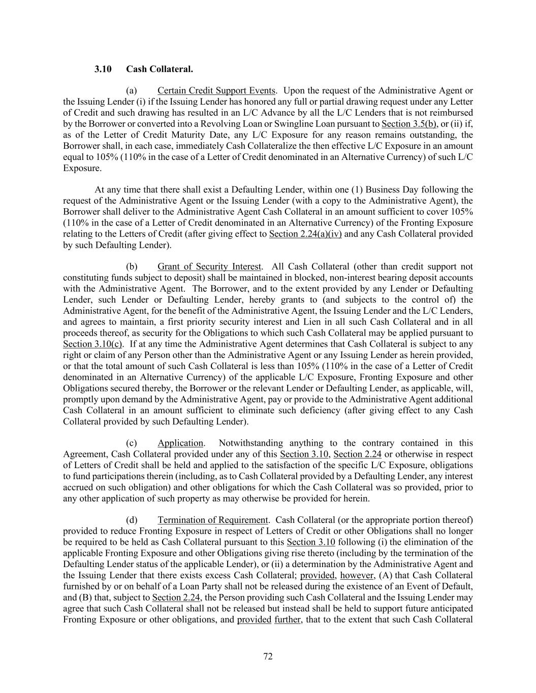 72 Cash Collateral. (a) Certain Credit Support Events. Upon the request of the Administrative Agent or the Issuing Lender (i) if the Issuing Lender has honored any full or partial drawing request under any Letter of Credit and such drawing has resulted in an L/C Advance by all the L/C Lenders that is not reimbursed by the Borrower or converted into a Revolving Loan or Swingline Loan pursuant to Section 3.5(b), or (ii) if, as of the Letter of Credit Maturity Date, any L/C Exposure for any reason remains outstanding, the Borrower shall, in each case, immediately Cash Collateralize the then effective L/C Exposure in an amount equal to 105% (110% in the case of a Letter of Credit denominated in an Alternative Currency) of such L/C Exposure. At any time that there shall exist a Defaulting Lender, within one (1) Business Day following the request of the Administrative Agent or the Issuing Lender (with a copy to the Administrative Agent), the Borrower shall deliver to the Administrative Agent Cash Collateral in an amount sufficient to cover 105% (110% in the case of a Letter of Credit denominated in an Alternative Currency) of the Fronting Exposure relating to the Letters of Credit (after giving effect to Section 2.24(a)(iv) and any Cash Collateral provided by such Defaulting Lender). (b) Grant of Security Interest. All Cash Collateral (other than credit support not constituting funds subject to deposit) shall be maintained in blocked, non-interest bearing deposit accounts with the Administrative Agent. The Borrower, and to the extent provided by any Lender or Defaulting Lender, such Lender or Defaulting Lender, hereby grants to (and subjects to the control of) the Administrative Agent, for the benefit of the Administrative Agent, the Issuing Lender and the L/C Lenders, and agrees to maintain, a first priority security interest and Lien in all such Cash Collateral and in all proceeds thereof, as security for the Obligations to which such Cash Collateral may be applied pursuant to Section 3.10(c). If at any time the Administrative Agent determines that Cash Collateral is subject to any right or claim of any Person other than the Administrative Agent or any Issuing Lender as herein provided, or that the total amount of such Cash Collateral is less than 105% (110% in the case of a Letter of Credit denominated in an Alternative Currency) of the applicable L/C Exposure, Fronting Exposure and other Obligations secured thereby, the Borrower or the relevant Lender or Defaulting Lender, as applicable, will, promptly upon demand by the Administrative Agent, pay or provide to the Administrative Agent additional Cash Collateral in an amount sufficient to eliminate such deficiency (after giving effect to any Cash Collateral provided by such Defaulting Lender). (c) Application. Notwithstanding anything to the contrary contained in this Agreement, Cash Collateral provided under any of this Section 3.10, Section 2.24 or otherwise in respect of Letters of Credit shall be held and applied to the satisfaction of the specific L/C Exposure, obligations to fund participations therein (including, as to Cash Collateral provided by a Defaulting Lender, any interest accrued on such obligation) and other obligations for which the Cash Collateral was so provided, prior to any other application of such property as may otherwise be provided for herein. (d) Termination of Requirement. Cash Collateral (or the appropriate portion thereof) provided to reduce Fronting Exposure in respect of Letters of Credit or other Obligations shall no longer be required to be held as Cash Collateral pursuant to this Section 3.10 following (i) the elimination of the applicable Fronting Exposure and other Obligations giving rise thereto (including by the termination of the Defaulting Lender status of the applicable Lender), or (ii) a determination by the Administrative Agent and the Issuing Lender that there exists excess Cash Collateral; provided, however, (A) that Cash Collateral furnished by or on behalf of a Loan Party shall not be released during the existence of an Event of Default, and (B) that, subject to Section 2.24, the Person providing such Cash Collateral and the Issuing Lender may agree that such Cash Collateral shall not be released but instead shall be held to support future anticipated Fronting Exposure or other obligations, and provided further, that to the extent that such Cash Collateral