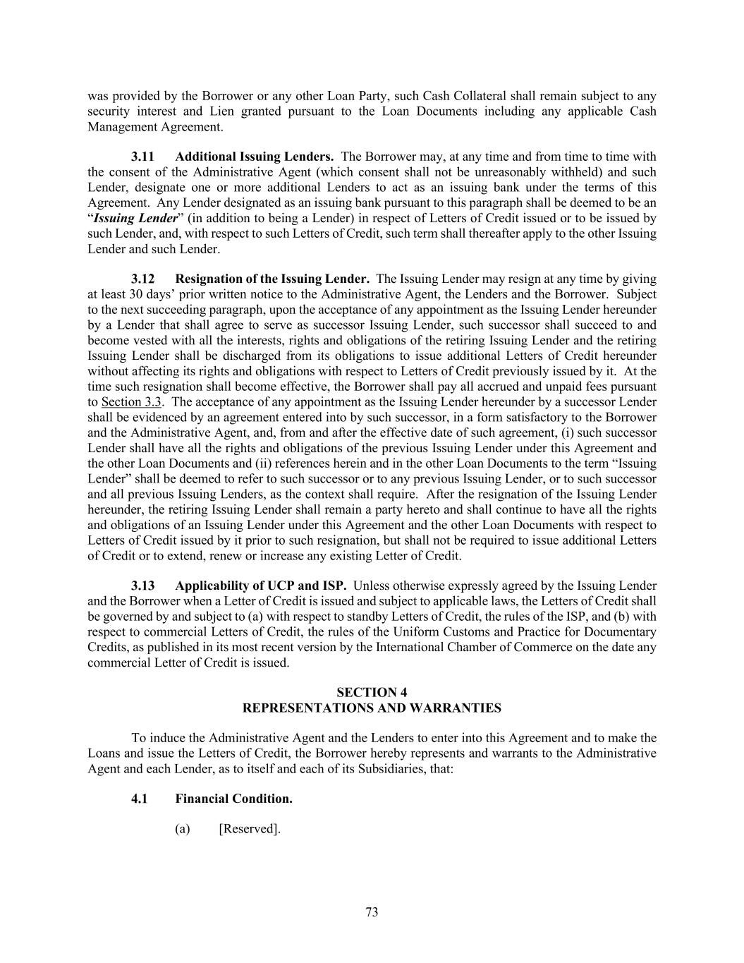 73 was provided by the Borrower or any other Loan Party, such Cash Collateral shall remain subject to any security interest and Lien granted pursuant to the Loan Documents including any applicable Cash Management Agreement. Additional Issuing Lenders. The Borrower may, at any time and from time to time with the consent of the Administrative Agent (which consent shall not be unreasonably withheld) and such Lender, designate one or more additional Lenders to act as an issuing bank under the terms of this Agreement. Any Lender designated as an issuing bank pursuant to this paragraph shall be deemed to be an “Issuing Lender” (in addition to being a Lender) in respect of Letters of Credit issued or to be issued by such Lender, and, with respect to such Letters of Credit, such term shall thereafter apply to the other Issuing Lender and such Lender. Resignation of the Issuing Lender. The Issuing Lender may resign at any time by giving at least 30 days’ prior written notice to the Administrative Agent, the Lenders and the Borrower. Subject to the next succeeding paragraph, upon the acceptance of any appointment as the Issuing Lender hereunder by a Lender that shall agree to serve as successor Issuing Lender, such successor shall succeed to and become vested with all the interests, rights and obligations of the retiring Issuing Lender and the retiring Issuing Lender shall be discharged from its obligations to issue additional Letters of Credit hereunder without affecting its rights and obligations with respect to Letters of Credit previously issued by it. At the time such resignation shall become effective, the Borrower shall pay all accrued and unpaid fees pursuant to Section 3.3. The acceptance of any appointment as the Issuing Lender hereunder by a successor Lender shall be evidenced by an agreement entered into by such successor, in a form satisfactory to the Borrower and the Administrative Agent, and, from and after the effective date of such agreement, (i) such successor Lender shall have all the rights and obligations of the previous Issuing Lender under this Agreement and the other Loan Documents and (ii) references herein and in the other Loan Documents to the term “Issuing Lender” shall be deemed to refer to such successor or to any previous Issuing Lender, or to such successor and all previous Issuing Lenders, as the context shall require. After the resignation of the Issuing Lender hereunder, the retiring Issuing Lender shall remain a party hereto and shall continue to have all the rights and obligations of an Issuing Lender under this Agreement and the other Loan Documents with respect to Letters of Credit issued by it prior to such resignation, but shall not be required to issue additional Letters of Credit or to extend, renew or increase any existing Letter of Credit. Applicability of UCP and ISP. Unless otherwise expressly agreed by the Issuing Lender and the Borrower when a Letter of Credit is issued and subject to applicable laws, the Letters of Credit shall be governed by and subject to (a) with respect to standby Letters of Credit, the rules of the ISP, and (b) with respect to commercial Letters of Credit, the rules of the Uniform Customs and Practice for Documentary Credits, as published in its most recent version by the International Chamber of Commerce on the date any commercial Letter of Credit is issued. REPRESENTATIONS AND WARRANTIES To induce the Administrative Agent and the Lenders to enter into this Agreement and to make the Loans and issue the Letters of Credit, the Borrower hereby represents and warrants to the Administrative Agent and each Lender, as to itself and each of its Subsidiaries, that: Financial Condition. (a) [Reserved].