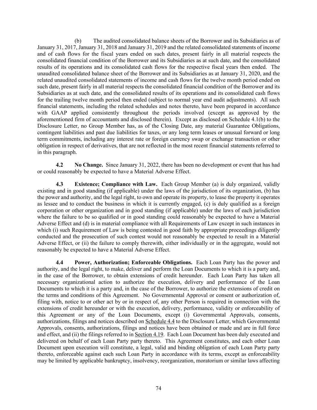 74 (b) The audited consolidated balance sheets of the Borrower and its Subsidiaries as of January 31, 2017, January 31, 2018 and January 31, 2019 and the related consolidated statements of income and of cash flows for the fiscal years ended on such dates, present fairly in all material respects the consolidated financial condition of the Borrower and its Subsidiaries as at such date, and the consolidated results of its operations and its consolidated cash flows for the respective fiscal years then ended. The unaudited consolidated balance sheet of the Borrower and its Subsidiaries as at January 31, 2020, and the related unaudited consolidated statements of income and cash flows for the twelve month period ended on such date, present fairly in all material respects the consolidated financial condition of the Borrower and its Subsidiaries as at such date, and the consolidated results of its operations and its consolidated cash flows for the trailing twelve month period then ended (subject to normal year end audit adjustments). All such financial statements, including the related schedules and notes thereto, have been prepared in accordance with GAAP applied consistently throughout the periods involved (except as approved by the aforementioned firm of accountants and disclosed therein). Except as disclosed on Schedule 4.1(b) to the Disclosure Letter, no Group Member has, as of the Closing Date, any material Guarantee Obligations, contingent liabilities and past due liabilities for taxes, or any long term leases or unusual forward or long term commitments, including any interest rate or foreign currency swap or exchange transaction or other obligation in respect of derivatives, that are not reflected in the most recent financial statements referred to in this paragraph. No Change. Since January 31, 2022, there has been no development or event that has had or could reasonably be expected to have a Material Adverse Effect. Existence; Compliance with Law. Each Group Member (a) is duly organized, validly existing and in good standing (if applicable) under the laws of the jurisdiction of its organization, (b) has the power and authority, and the legal right, to own and operate its property, to lease the property it operates as lessee and to conduct the business in which it is currently engaged, (c) is duly qualified as a foreign corporation or other organization and in good standing (if applicable) under the laws of each jurisdiction where the failure to be so qualified or in good standing could reasonably be expected to have a Material Adverse Effect and (d) is in material compliance with all Requirements of Law except in such instances in which (i) such Requirement of Law is being contested in good faith by appropriate proceedings diligently conducted and the prosecution of such contest would not reasonably be expected to result in a Material Adverse Effect, or (ii) the failure to comply therewith, either individually or in the aggregate, would not reasonably be expected to have a Material Adverse Effect. Power, Authorization; Enforceable Obligations. Each Loan Party has the power and authority, and the legal right, to make, deliver and perform the Loan Documents to which it is a party and, in the case of the Borrower, to obtain extensions of credit hereunder. Each Loan Party has taken all necessary organizational action to authorize the execution, delivery and performance of the Loan Documents to which it is a party and, in the case of the Borrower, to authorize the extensions of credit on the terms and conditions of this Agreement. No Governmental Approval or consent or authorization of, filing with, notice to or other act by or in respect of, any other Person is required in connection with the extensions of credit hereunder or with the execution, delivery, performance, validity or enforceability of this Agreement or any of the Loan Documents, except (i) Governmental Approvals, consents, authorizations, filings and notices described on Schedule 4.4 to the Disclosure Letter, which Governmental Approvals, consents, authorizations, filings and notices have been obtained or made and are in full force and effect, and (ii) the filings referred to in Section 4.19. Each Loan Document has been duly executed and delivered on behalf of each Loan Party party thereto. This Agreement constitutes, and each other Loan Document upon execution will constitute, a legal, valid and binding obligation of each Loan Party party thereto, enforceable against each such Loan Party in accordance with its terms, except as enforceability may be limited by applicable bankruptcy, insolvency, reorganization, moratorium or similar laws affecting