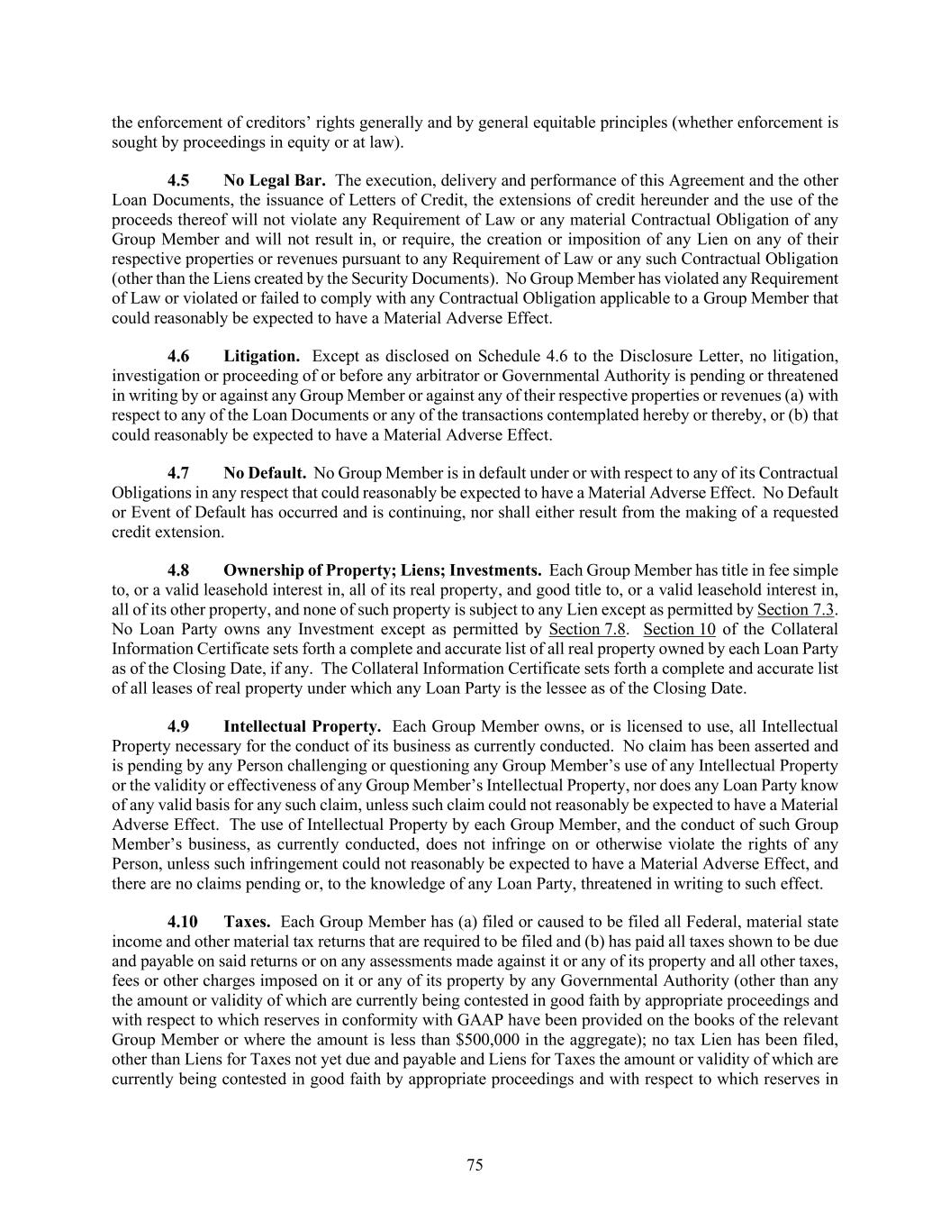 75 the enforcement of creditors’ rights generally and by general equitable principles (whether enforcement is sought by proceedings in equity or at law). No Legal Bar. The execution, delivery and performance of this Agreement and the other Loan Documents, the issuance of Letters of Credit, the extensions of credit hereunder and the use of the proceeds thereof will not violate any Requirement of Law or any material Contractual Obligation of any Group Member and will not result in, or require, the creation or imposition of any Lien on any of their respective properties or revenues pursuant to any Requirement of Law or any such Contractual Obligation (other than the Liens created by the Security Documents). No Group Member has violated any Requirement of Law or violated or failed to comply with any Contractual Obligation applicable to a Group Member that could reasonably be expected to have a Material Adverse Effect. Litigation. Except as disclosed on Schedule 4.6 to the Disclosure Letter, no litigation, investigation or proceeding of or before any arbitrator or Governmental Authority is pending or threatened in writing by or against any Group Member or against any of their respective properties or revenues (a) with respect to any of the Loan Documents or any of the transactions contemplated hereby or thereby, or (b) that could reasonably be expected to have a Material Adverse Effect. No Default. No Group Member is in default under or with respect to any of its Contractual Obligations in any respect that could reasonably be expected to have a Material Adverse Effect. No Default or Event of Default has occurred and is continuing, nor shall either result from the making of a requested credit extension. Ownership of Property; Liens; Investments. Each Group Member has title in fee simple to, or a valid leasehold interest in, all of its real property, and good title to, or a valid leasehold interest in, all of its other property, and none of such property is subject to any Lien except as permitted by Section 7.3. No Loan Party owns any Investment except as permitted by Section 7.8. Section 10 of the Collateral Information Certificate sets forth a complete and accurate list of all real property owned by each Loan Party as of the Closing Date, if any. The Collateral Information Certificate sets forth a complete and accurate list of all leases of real property under which any Loan Party is the lessee as of the Closing Date. Intellectual Property. Each Group Member owns, or is licensed to use, all Intellectual Property necessary for the conduct of its business as currently conducted. No claim has been asserted and is pending by any Person challenging or questioning any Group Member’s use of any Intellectual Property or the validity or effectiveness of any Group Member’s Intellectual Property, nor does any Loan Party know of any valid basis for any such claim, unless such claim could not reasonably be expected to have a Material Adverse Effect. The use of Intellectual Property by each Group Member, and the conduct of such Group Member’s business, as currently conducted, does not infringe on or otherwise violate the rights of any Person, unless such infringement could not reasonably be expected to have a Material Adverse Effect, and there are no claims pending or, to the knowledge of any Loan Party, threatened in writing to such effect. Taxes. Each Group Member has (a) filed or caused to be filed all Federal, material state income and other material tax returns that are required to be filed and (b) has paid all taxes shown to be due and payable on said returns or on any assessments made against it or any of its property and all other taxes, fees or other charges imposed on it or any of its property by any Governmental Authority (other than any the amount or validity of which are currently being contested in good faith by appropriate proceedings and with respect to which reserves in conformity with GAAP have been provided on the books of the relevant Group Member or where the amount is less than $500,000 in the aggregate); no tax Lien has been filed, other than Liens for Taxes not yet due and payable and Liens for Taxes the amount or validity of which are currently being contested in good faith by appropriate proceedings and with respect to which reserves in