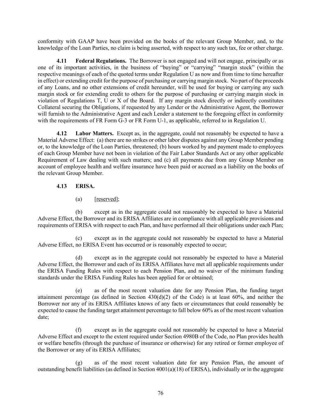 76 conformity with GAAP have been provided on the books of the relevant Group Member, and, to the knowledge of the Loan Parties, no claim is being asserted, with respect to any such tax, fee or other charge. Federal Regulations. The Borrower is not engaged and will not engage, principally or as one of its important activities, in the business of “buying” or “carrying” “margin stock” (within the respective meanings of each of the quoted terms under Regulation U as now and from time to time hereafter in effect) or extending credit for the purpose of purchasing or carrying margin stock. No part of the proceeds of any Loans, and no other extensions of credit hereunder, will be used for buying or carrying any such margin stock or for extending credit to others for the purpose of purchasing or carrying margin stock in violation of Regulations T, U or X of the Board. If any margin stock directly or indirectly constitutes Collateral securing the Obligations, if requested by any Lender or the Administrative Agent, the Borrower will furnish to the Administrative Agent and each Lender a statement to the foregoing effect in conformity with the requirements of FR Form G-3 or FR Form U-1, as applicable, referred to in Regulation U. Labor Matters. Except as, in the aggregate, could not reasonably be expected to have a Material Adverse Effect: (a) there are no strikes or other labor disputes against any Group Member pending or, to the knowledge of the Loan Parties, threatened; (b) hours worked by and payment made to employees of each Group Member have not been in violation of the Fair Labor Standards Act or any other applicable Requirement of Law dealing with such matters; and (c) all payments due from any Group Member on account of employee health and welfare insurance have been paid or accrued as a liability on the books of the relevant Group Member. ERISA. (a) [reserved]; (b) except as in the aggregate could not reasonably be expected to have a Material Adverse Effect, the Borrower and its ERISA Affiliates are in compliance with all applicable provisions and requirements of ERISA with respect to each Plan, and have performed all their obligations under each Plan; (c) except as in the aggregate could not reasonably be expected to have a Material Adverse Effect, no ERISA Event has occurred or is reasonably expected to occur; (d) except as in the aggregate could not reasonably be expected to have a Material Adverse Effect, the Borrower and each of its ERISA Affiliates have met all applicable requirements under the ERISA Funding Rules with respect to each Pension Plan, and no waiver of the minimum funding standards under the ERISA Funding Rules has been applied for or obtained; (e) as of the most recent valuation date for any Pension Plan, the funding target attainment percentage (as defined in Section 430(d)(2) of the Code) is at least 60%, and neither the Borrower nor any of its ERISA Affiliates knows of any facts or circumstances that could reasonably be expected to cause the funding target attainment percentage to fall below 60% as of the most recent valuation date; (f) except as in the aggregate could not reasonably be expected to have a Material Adverse Effect and except to the extent required under Section 4980B of the Code, no Plan provides health or welfare benefits (through the purchase of insurance or otherwise) for any retired or former employee of the Borrower or any of its ERISA Affiliates; (g) as of the most recent valuation date for any Pension Plan, the amount of outstanding benefit liabilities (as defined in Section 4001(a)(18) of ERISA), individually or in the aggregate