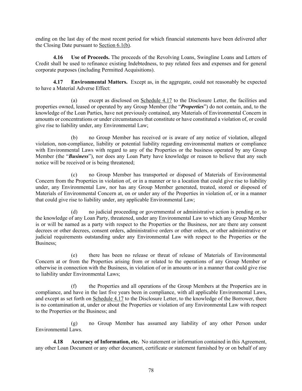 78 ending on the last day of the most recent period for which financial statements have been delivered after the Closing Date pursuant to Section 6.1(b). Use of Proceeds. The proceeds of the Revolving Loans, Swingline Loans and Letters of Credit shall be used to refinance existing Indebtedness, to pay related fees and expenses and for general corporate purposes (including Permitted Acquisitions). Environmental Matters. Except as, in the aggregate, could not reasonably be expected to have a Material Adverse Effect: (a) except as disclosed on Schedule 4.17 to the Disclosure Letter, the facilities and properties owned, leased or operated by any Group Member (the “Properties”) do not contain, and, to the knowledge of the Loan Parties, have not previously contained, any Materials of Environmental Concern in amounts or concentrations or under circumstances that constitute or have constituted a violation of, or could give rise to liability under, any Environmental Law; (b) no Group Member has received or is aware of any notice of violation, alleged violation, non-compliance, liability or potential liability regarding environmental matters or compliance with Environmental Laws with regard to any of the Properties or the business operated by any Group Member (the “Business”), nor does any Loan Party have knowledge or reason to believe that any such notice will be received or is being threatened; (c) no Group Member has transported or disposed of Materials of Environmental Concern from the Properties in violation of, or in a manner or to a location that could give rise to liability under, any Environmental Law, nor has any Group Member generated, treated, stored or disposed of Materials of Environmental Concern at, on or under any of the Properties in violation of, or in a manner that could give rise to liability under, any applicable Environmental Law; (d) no judicial proceeding or governmental or administrative action is pending or, to the knowledge of any Loan Party, threatened, under any Environmental Law to which any Group Member is or will be named as a party with respect to the Properties or the Business, nor are there any consent decrees or other decrees, consent orders, administrative orders or other orders, or other administrative or judicial requirements outstanding under any Environmental Law with respect to the Properties or the Business; (e) there has been no release or threat of release of Materials of Environmental Concern at or from the Properties arising from or related to the operations of any Group Member or otherwise in connection with the Business, in violation of or in amounts or in a manner that could give rise to liability under Environmental Laws; (f) the Properties and all operations of the Group Members at the Properties are in compliance, and have in the last five years been in compliance, with all applicable Environmental Laws, and except as set forth on Schedule 4.17 to the Disclosure Letter, to the knowledge of the Borrower, there is no contamination at, under or about the Properties or violation of any Environmental Law with respect to the Properties or the Business; and (g) no Group Member has assumed any liability of any other Person under Environmental Laws. Accuracy of Information, etc. No statement or information contained in this Agreement, any other Loan Document or any other document, certificate or statement furnished by or on behalf of any