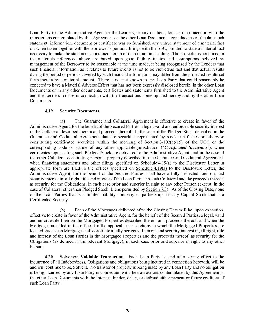 79 Loan Party to the Administrative Agent or the Lenders, or any of them, for use in connection with the transactions contemplated by this Agreement or the other Loan Documents, contained as of the date such statement, information, document or certificate was so furnished, any untrue statement of a material fact or, when taken together with the Borrower’s periodic filings with the SEC, omitted to state a material fact necessary to make the statements contained herein or therein not misleading. The projections contained in the materials referenced above are based upon good faith estimates and assumptions believed by management of the Borrower to be reasonable at the time made, it being recognized by the Lenders that such financial information as it relates to future events is not to be viewed as fact and that actual results during the period or periods covered by such financial information may differ from the projected results set forth therein by a material amount. There is no fact known to any Loan Party that could reasonably be expected to have a Material Adverse Effect that has not been expressly disclosed herein, in the other Loan Documents or in any other documents, certificates and statements furnished to the Administrative Agent and the Lenders for use in connection with the transactions contemplated hereby and by the other Loan Documents. Security Documents. (a) The Guarantee and Collateral Agreement is effective to create in favor of the Administrative Agent, for the benefit of the Secured Parties, a legal, valid and enforceable security interest in the Collateral described therein and proceeds thereof. In the case of the Pledged Stock described in the Guarantee and Collateral Agreement that are securities represented by stock certificates or otherwise constituting certificated securities within the meaning of Section 8-102(a)(15) of the UCC or the corresponding code or statute of any other applicable jurisdiction (“Certificated Securities”), when certificates representing such Pledged Stock are delivered to the Administrative Agent, and in the case of the other Collateral constituting personal property described in the Guarantee and Collateral Agreement, when financing statements and other filings specified on Schedule 4.19(a) to the Disclosure Letter in appropriate form are filed in the offices specified on Schedule 4.19(a) to the Disclosure Letter, the Administrative Agent, for the benefit of the Secured Parties, shall have a fully perfected Lien on, and security interest in, all right, title and interest of the Loan Parties in such Collateral and the proceeds thereof, as security for the Obligations, in each case prior and superior in right to any other Person (except, in the case of Collateral other than Pledged Stock, Liens permitted by Section 7.3). As of the Closing Date, none of the Loan Parties that is a limited liability company or partnership has any Capital Stock that is a Certificated Security. (b) Each of the Mortgages delivered after the Closing Date will be, upon execution, effective to create in favor of the Administrative Agent, for the benefit of the Secured Parties, a legal, valid and enforceable Lien on the Mortgaged Properties described therein and proceeds thereof, and when the Mortgages are filed in the offices for the applicable jurisdictions in which the Mortgaged Properties are located, each such Mortgage shall constitute a fully perfected Lien on, and security interest in, all right, title and interest of the Loan Parties in the Mortgaged Properties and the proceeds thereof, as security for the Obligations (as defined in the relevant Mortgage), in each case prior and superior in right to any other Person. Solvency; Voidable Transaction. Each Loan Party is, and after giving effect to the incurrence of all Indebtedness, Obligations and obligations being incurred in connection herewith, will be and will continue to be, Solvent. No transfer of property is being made by any Loan Party and no obligation is being incurred by any Loan Party in connection with the transactions contemplated by this Agreement or the other Loan Documents with the intent to hinder, delay, or defraud either present or future creditors of such Loan Party.