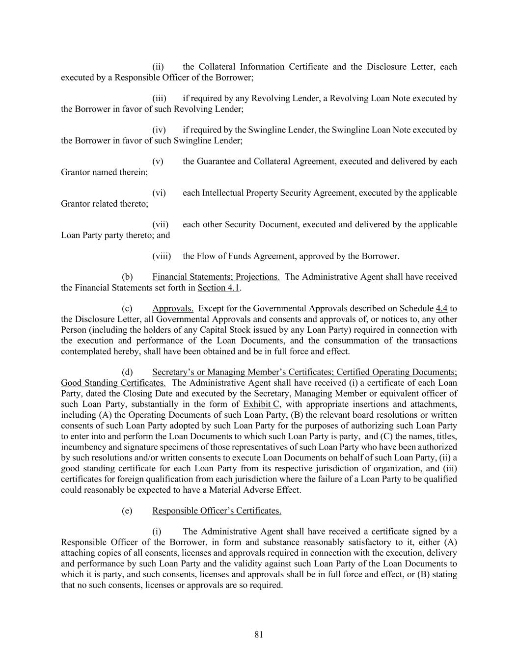 81 (ii) the Collateral Information Certificate and the Disclosure Letter, each executed by a Responsible Officer of the Borrower; (iii) if required by any Revolving Lender, a Revolving Loan Note executed by the Borrower in favor of such Revolving Lender; (iv) if required by the Swingline Lender, the Swingline Loan Note executed by the Borrower in favor of such Swingline Lender; (v) the Guarantee and Collateral Agreement, executed and delivered by each Grantor named therein; (vi) each Intellectual Property Security Agreement, executed by the applicable Grantor related thereto; (vii) each other Security Document, executed and delivered by the applicable Loan Party party thereto; and (viii) the Flow of Funds Agreement, approved by the Borrower. (b) Financial Statements; Projections. The Administrative Agent shall have received the Financial Statements set forth in Section 4.1. (c) Approvals. Except for the Governmental Approvals described on Schedule 4.4 to the Disclosure Letter, all Governmental Approvals and consents and approvals of, or notices to, any other Person (including the holders of any Capital Stock issued by any Loan Party) required in connection with the execution and performance of the Loan Documents, and the consummation of the transactions contemplated hereby, shall have been obtained and be in full force and effect. (d) Secretary’s or Managing Member’s Certificates; Certified Operating Documents; Good Standing Certificates. The Administrative Agent shall have received (i) a certificate of each Loan Party, dated the Closing Date and executed by the Secretary, Managing Member or equivalent officer of such Loan Party, substantially in the form of Exhibit C, with appropriate insertions and attachments, including (A) the Operating Documents of such Loan Party, (B) the relevant board resolutions or written consents of such Loan Party adopted by such Loan Party for the purposes of authorizing such Loan Party to enter into and perform the Loan Documents to which such Loan Party is party, and (C) the names, titles, incumbency and signature specimens of those representatives of such Loan Party who have been authorized by such resolutions and/or written consents to execute Loan Documents on behalf of such Loan Party, (ii) a good standing certificate for each Loan Party from its respective jurisdiction of organization, and (iii) certificates for foreign qualification from each jurisdiction where the failure of a Loan Party to be qualified could reasonably be expected to have a Material Adverse Effect. (e) Responsible Officer’s Certificates. (i) The Administrative Agent shall have received a certificate signed by a Responsible Officer of the Borrower, in form and substance reasonably satisfactory to it, either (A) attaching copies of all consents, licenses and approvals required in connection with the execution, delivery and performance by such Loan Party and the validity against such Loan Party of the Loan Documents to which it is party, and such consents, licenses and approvals shall be in full force and effect, or (B) stating that no such consents, licenses or approvals are so required.