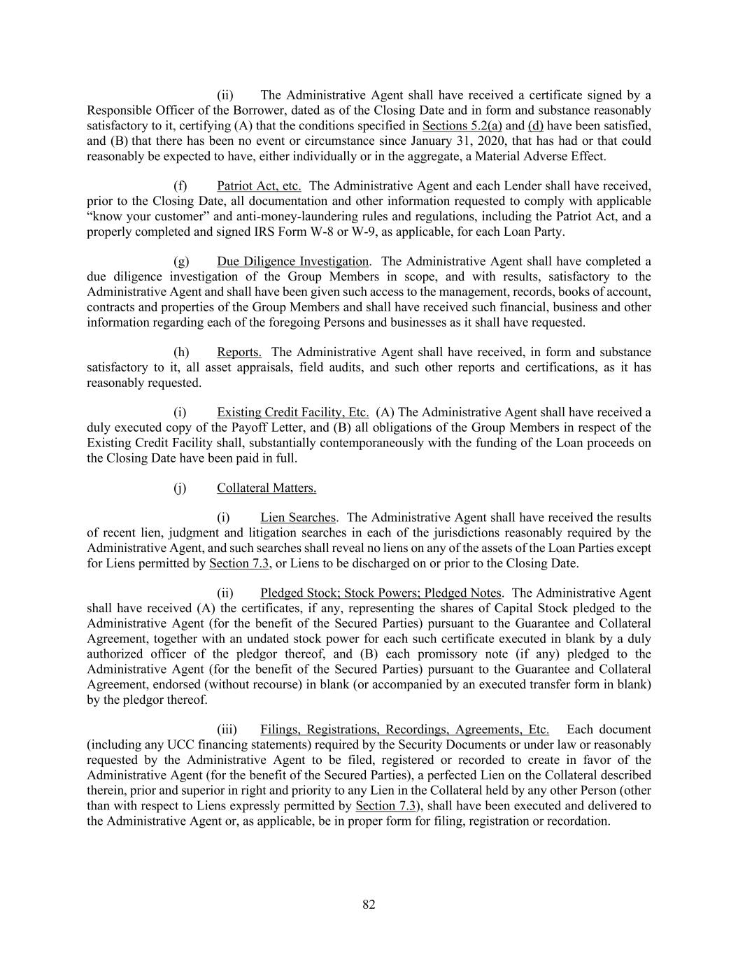 82 (ii) The Administrative Agent shall have received a certificate signed by a Responsible Officer of the Borrower, dated as of the Closing Date and in form and substance reasonably satisfactory to it, certifying (A) that the conditions specified in Sections 5.2(a) and (d) have been satisfied, and (B) that there has been no event or circumstance since January 31, 2020, that has had or that could reasonably be expected to have, either individually or in the aggregate, a Material Adverse Effect. (f) Patriot Act, etc. The Administrative Agent and each Lender shall have received, prior to the Closing Date, all documentation and other information requested to comply with applicable “know your customer” and anti-money-laundering rules and regulations, including the Patriot Act, and a properly completed and signed IRS Form W-8 or W-9, as applicable, for each Loan Party. (g) Due Diligence Investigation. The Administrative Agent shall have completed a due diligence investigation of the Group Members in scope, and with results, satisfactory to the Administrative Agent and shall have been given such access to the management, records, books of account, contracts and properties of the Group Members and shall have received such financial, business and other information regarding each of the foregoing Persons and businesses as it shall have requested. (h) Reports. The Administrative Agent shall have received, in form and substance satisfactory to it, all asset appraisals, field audits, and such other reports and certifications, as it has reasonably requested. (i) Existing Credit Facility, Etc. (A) The Administrative Agent shall have received a duly executed copy of the Payoff Letter, and (B) all obligations of the Group Members in respect of the Existing Credit Facility shall, substantially contemporaneously with the funding of the Loan proceeds on the Closing Date have been paid in full. (j) Collateral Matters. (i) Lien Searches. The Administrative Agent shall have received the results of recent lien, judgment and litigation searches in each of the jurisdictions reasonably required by the Administrative Agent, and such searches shall reveal no liens on any of the assets of the Loan Parties except for Liens permitted by Section 7.3, or Liens to be discharged on or prior to the Closing Date. (ii) Pledged Stock; Stock Powers; Pledged Notes. The Administrative Agent shall have received (A) the certificates, if any, representing the shares of Capital Stock pledged to the Administrative Agent (for the benefit of the Secured Parties) pursuant to the Guarantee and Collateral Agreement, together with an undated stock power for each such certificate executed in blank by a duly authorized officer of the pledgor thereof, and (B) each promissory note (if any) pledged to the Administrative Agent (for the benefit of the Secured Parties) pursuant to the Guarantee and Collateral Agreement, endorsed (without recourse) in blank (or accompanied by an executed transfer form in blank) by the pledgor thereof. (iii) Filings, Registrations, Recordings, Agreements, Etc. Each document (including any UCC financing statements) required by the Security Documents or under law or reasonably requested by the Administrative Agent to be filed, registered or recorded to create in favor of the Administrative Agent (for the benefit of the Secured Parties), a perfected Lien on the Collateral described therein, prior and superior in right and priority to any Lien in the Collateral held by any other Person (other than with respect to Liens expressly permitted by Section 7.3), shall have been executed and delivered to the Administrative Agent or, as applicable, be in proper form for filing, registration or recordation.