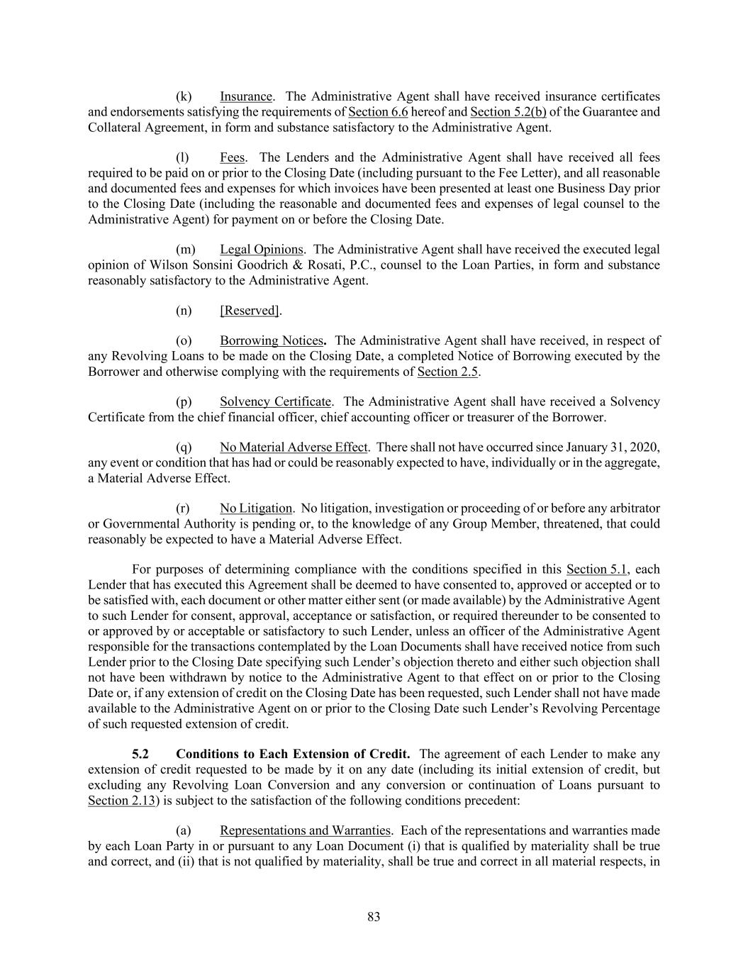 83 (k) Insurance. The Administrative Agent shall have received insurance certificates and endorsements satisfying the requirements of Section 6.6 hereof and Section 5.2(b) of the Guarantee and Collateral Agreement, in form and substance satisfactory to the Administrative Agent. (l) Fees. The Lenders and the Administrative Agent shall have received all fees required to be paid on or prior to the Closing Date (including pursuant to the Fee Letter), and all reasonable and documented fees and expenses for which invoices have been presented at least one Business Day prior to the Closing Date (including the reasonable and documented fees and expenses of legal counsel to the Administrative Agent) for payment on or before the Closing Date. (m) Legal Opinions. The Administrative Agent shall have received the executed legal opinion of Wilson Sonsini Goodrich & Rosati, P.C., counsel to the Loan Parties, in form and substance reasonably satisfactory to the Administrative Agent. (n) [Reserved]. (o) Borrowing Notices. The Administrative Agent shall have received, in respect of any Revolving Loans to be made on the Closing Date, a completed Notice of Borrowing executed by the Borrower and otherwise complying with the requirements of Section 2.5. (p) Solvency Certificate. The Administrative Agent shall have received a Solvency Certificate from the chief financial officer, chief accounting officer or treasurer of the Borrower. (q) No Material Adverse Effect. There shall not have occurred since January 31, 2020, any event or condition that has had or could be reasonably expected to have, individually or in the aggregate, a Material Adverse Effect. (r) No Litigation. No litigation, investigation or proceeding of or before any arbitrator or Governmental Authority is pending or, to the knowledge of any Group Member, threatened, that could reasonably be expected to have a Material Adverse Effect. For purposes of determining compliance with the conditions specified in this Section 5.1, each Lender that has executed this Agreement shall be deemed to have consented to, approved or accepted or to be satisfied with, each document or other matter either sent (or made available) by the Administrative Agent to such Lender for consent, approval, acceptance or satisfaction, or required thereunder to be consented to or approved by or acceptable or satisfactory to such Lender, unless an officer of the Administrative Agent responsible for the transactions contemplated by the Loan Documents shall have received notice from such Lender prior to the Closing Date specifying such Lender’s objection thereto and either such objection shall not have been withdrawn by notice to the Administrative Agent to that effect on or prior to the Closing Date or, if any extension of credit on the Closing Date has been requested, such Lender shall not have made available to the Administrative Agent on or prior to the Closing Date such Lender’s Revolving Percentage of such requested extension of credit. Conditions to Each Extension of Credit. The agreement of each Lender to make any extension of credit requested to be made by it on any date (including its initial extension of credit, but excluding any Revolving Loan Conversion and any conversion or continuation of Loans pursuant to Section 2.13) is subject to the satisfaction of the following conditions precedent: (a) Representations and Warranties. Each of the representations and warranties made by each Loan Party in or pursuant to any Loan Document (i) that is qualified by materiality shall be true and correct, and (ii) that is not qualified by materiality, shall be true and correct in all material respects, in