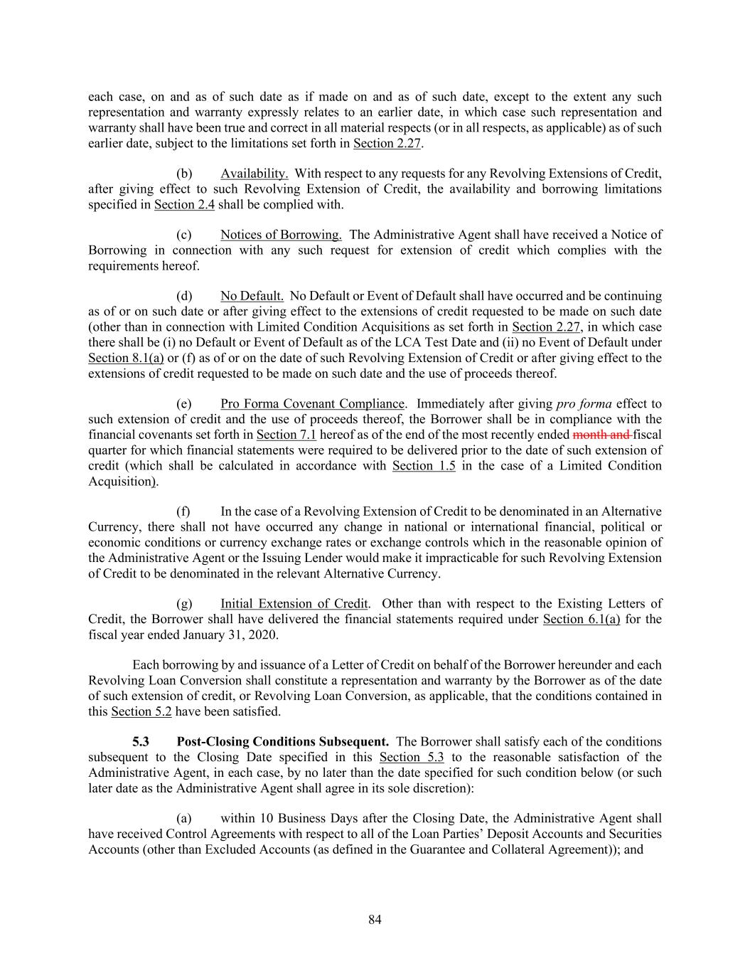 84 each case, on and as of such date as if made on and as of such date, except to the extent any such representation and warranty expressly relates to an earlier date, in which case such representation and warranty shall have been true and correct in all material respects (or in all respects, as applicable) as of such earlier date, subject to the limitations set forth in Section 2.27. (b) Availability. With respect to any requests for any Revolving Extensions of Credit, after giving effect to such Revolving Extension of Credit, the availability and borrowing limitations specified in Section 2.4 shall be complied with. (c) Notices of Borrowing. The Administrative Agent shall have received a Notice of Borrowing in connection with any such request for extension of credit which complies with the requirements hereof. (d) No Default. No Default or Event of Default shall have occurred and be continuing as of or on such date or after giving effect to the extensions of credit requested to be made on such date (other than in connection with Limited Condition Acquisitions as set forth in Section 2.27, in which case there shall be (i) no Default or Event of Default as of the LCA Test Date and (ii) no Event of Default under Section 8.1(a) or (f) as of or on the date of such Revolving Extension of Credit or after giving effect to the extensions of credit requested to be made on such date and the use of proceeds thereof. (e) Pro Forma Covenant Compliance. Immediately after giving pro forma effect to such extension of credit and the use of proceeds thereof, the Borrower shall be in compliance with the financial covenants set forth in Section 7.1 hereof as of the end of the most recently ended month and fiscal quarter for which financial statements were required to be delivered prior to the date of such extension of credit (which shall be calculated in accordance with Section 1.5 in the case of a Limited Condition Acquisition). (f) In the case of a Revolving Extension of Credit to be denominated in an Alternative Currency, there shall not have occurred any change in national or international financial, political or economic conditions or currency exchange rates or exchange controls which in the reasonable opinion of the Administrative Agent or the Issuing Lender would make it impracticable for such Revolving Extension of Credit to be denominated in the relevant Alternative Currency. (g) Initial Extension of Credit. Other than with respect to the Existing Letters of Credit, the Borrower shall have delivered the financial statements required under Section 6.1(a) for the fiscal year ended January 31, 2020. Each borrowing by and issuance of a Letter of Credit on behalf of the Borrower hereunder and each Revolving Loan Conversion shall constitute a representation and warranty by the Borrower as of the date of such extension of credit, or Revolving Loan Conversion, as applicable, that the conditions contained in this Section 5.2 have been satisfied. Post-Closing Conditions Subsequent. The Borrower shall satisfy each of the conditions subsequent to the Closing Date specified in this Section 5.3 to the reasonable satisfaction of the Administrative Agent, in each case, by no later than the date specified for such condition below (or such later date as the Administrative Agent shall agree in its sole discretion): (a) within 10 Business Days after the Closing Date, the Administrative Agent shall have received Control Agreements with respect to all of the Loan Parties’ Deposit Accounts and Securities Accounts (other than Excluded Accounts (as defined in the Guarantee and Collateral Agreement)); and
