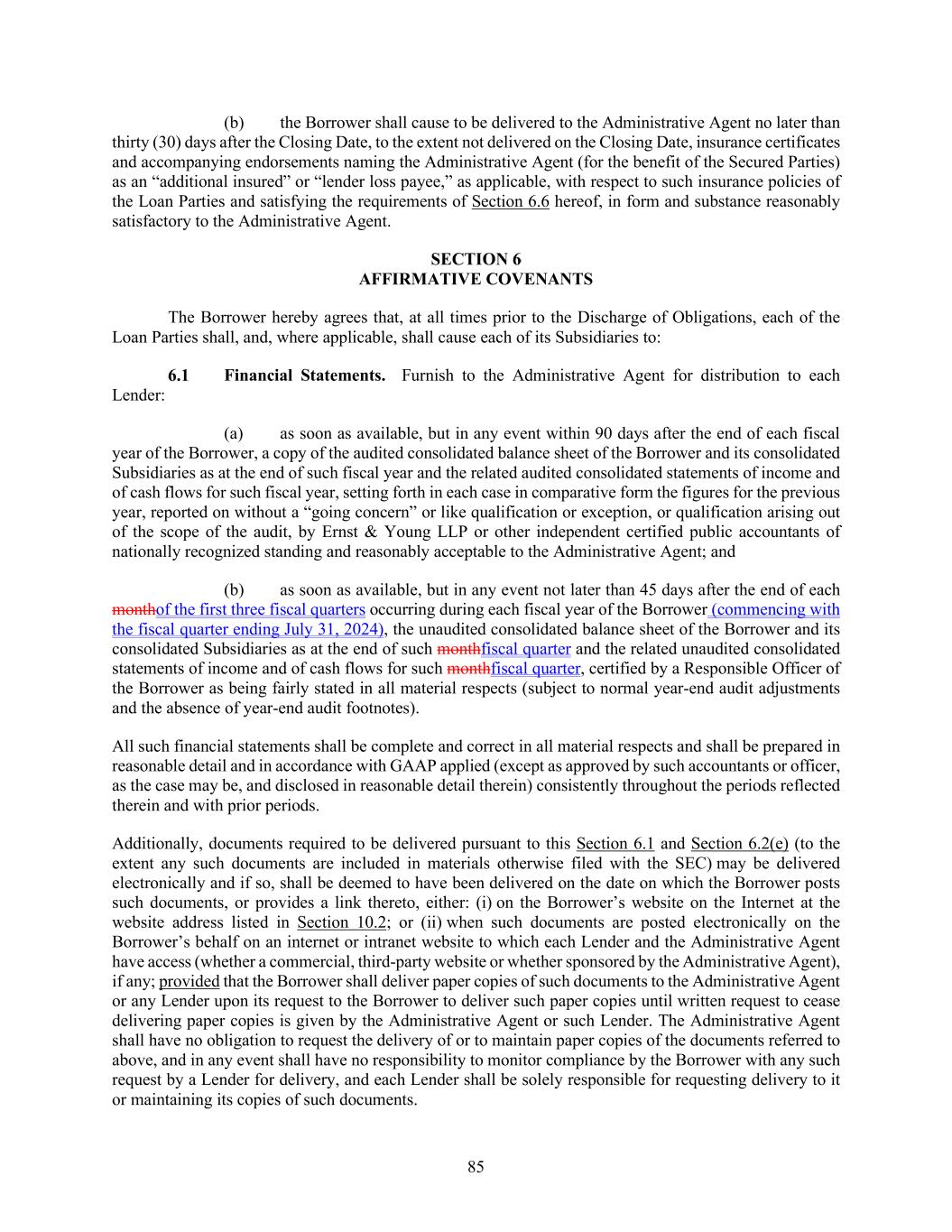 85 (b) the Borrower shall cause to be delivered to the Administrative Agent no later than thirty (30) days after the Closing Date, to the extent not delivered on the Closing Date, insurance certificates and accompanying endorsements naming the Administrative Agent (for the benefit of the Secured Parties) as an “additional insured” or “lender loss payee,” as applicable, with respect to such insurance policies of the Loan Parties and satisfying the requirements of Section 6.6 hereof, in form and substance reasonably satisfactory to the Administrative Agent. AFFIRMATIVE COVENANTS The Borrower hereby agrees that, at all times prior to the Discharge of Obligations, each of the Loan Parties shall, and, where applicable, shall cause each of its Subsidiaries to: Financial Statements. Furnish to the Administrative Agent for distribution to each Lender: (a) as soon as available, but in any event within 90 days after the end of each fiscal year of the Borrower, a copy of the audited consolidated balance sheet of the Borrower and its consolidated Subsidiaries as at the end of such fiscal year and the related audited consolidated statements of income and of cash flows for such fiscal year, setting forth in each case in comparative form the figures for the previous year, reported on without a “going concern” or like qualification or exception, or qualification arising out of the scope of the audit, by Ernst & Young LLP or other independent certified public accountants of nationally recognized standing and reasonably acceptable to the Administrative Agent; and (b) as soon as available, but in any event not later than 45 days after the end of each monthof the first three fiscal quarters occurring during each fiscal year of the Borrower (commencing with the fiscal quarter ending July 31, 2024), the unaudited consolidated balance sheet of the Borrower and its consolidated Subsidiaries as at the end of such monthfiscal quarter and the related unaudited consolidated statements of income and of cash flows for such monthfiscal quarter, certified by a Responsible Officer of the Borrower as being fairly stated in all material respects (subject to normal year-end audit adjustments and the absence of year-end audit footnotes). All such financial statements shall be complete and correct in all material respects and shall be prepared in reasonable detail and in accordance with GAAP applied (except as approved by such accountants or officer, as the case may be, and disclosed in reasonable detail therein) consistently throughout the periods reflected therein and with prior periods. Additionally, documents required to be delivered pursuant to this Section 6.1 and Section 6.2(e) (to the extent any such documents are included in materials otherwise filed with the SEC) may be delivered electronically and if so, shall be deemed to have been delivered on the date on which the Borrower posts such documents, or provides a link thereto, either: (i) on the Borrower’s website on the Internet at the website address listed in Section 10.2; or (ii) when such documents are posted electronically on the Borrower’s behalf on an internet or intranet website to which each Lender and the Administrative Agent have access (whether a commercial, third-party website or whether sponsored by the Administrative Agent), if any; provided that the Borrower shall deliver paper copies of such documents to the Administrative Agent or any Lender upon its request to the Borrower to deliver such paper copies until written request to cease delivering paper copies is given by the Administrative Agent or such Lender. The Administrative Agent shall have no obligation to request the delivery of or to maintain paper copies of the documents referred to above, and in any event shall have no responsibility to monitor compliance by the Borrower with any such request by a Lender for delivery, and each Lender shall be solely responsible for requesting delivery to it or maintaining its copies of such documents.