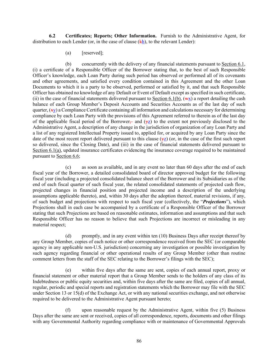 86 Certificates; Reports; Other Information. Furnish to the Administrative Agent, for distribution to each Lender (or, in the case of clause (kh), to the relevant Lender): (a) [reserved]; (b) concurrently with the delivery of any financial statements pursuant to Section 6.1, (i) a certificate of a Responsible Officer of the Borrower stating that, to the best of such Responsible Officer’s knowledge, each Loan Party during such period has observed or performed all of its covenants and other agreements, and satisfied every condition contained in this Agreement and the other Loan Documents to which it is a party to be observed, performed or satisfied by it, and that such Responsible Officer has obtained no knowledge of any Default or Event of Default except as specified in such certificate, (ii) in the case of financial statements delivered pursuant to Section 6.1(b), (wx) a report detailing the cash balance of each Group Member’s Deposit Accounts and Securities Accounts as of the last day of such quarter, (xy) a Compliance Certificate containing all information and calculations necessary for determining compliance by each Loan Party with the provisions of this Agreement referred to therein as of the last day of the applicable fiscal period of the Borrower, and (yz) to the extent not previously disclosed to the Administrative Agent, a description of any change in the jurisdiction of organization of any Loan Party and a list of any registered Intellectual Property issued to, applied for, or acquired by any Loan Party since the date of the most recent report delivered pursuant to this clause (yz) (or, in the case of the first such report so delivered, since the Closing Date), and (iii) in the case of financial statements delivered pursuant to Section 6.1(a), updated insurance certificates evidencing the insurance coverage required to be maintained pursuant to Section 6.6; (c) as soon as available, and in any event no later than 60 days after the end of each fiscal year of the Borrower, a detailed consolidated board of director approved budget for the following fiscal year (including a projected consolidated balance sheet of the Borrower and its Subsidiaries as of the end of each fiscal quarter of such fiscal year, the related consolidated statements of projected cash flow, projected changes in financial position and projected income and a description of the underlying assumptions applicable thereto), and, within 30 days after the adoption thereof, material revisions, if any, of such budget and projections with respect to such fiscal year (collectively, the “Projections”), which Projections shall in each case be accompanied by a certificate of a Responsible Officer of the Borrower stating that such Projections are based on reasonable estimates, information and assumptions and that such Responsible Officer has no reason to believe that such Projections are incorrect or misleading in any material respect; (d) promptly, and in any event within ten (10) Business Days after receipt thereof by any Group Member, copies of each notice or other correspondence received from the SEC (or comparable agency in any applicable non-U.S. jurisdiction) concerning any investigation or possible investigation by such agency regarding financial or other operational results of any Group Member (other than routine comment letters from the staff of the SEC relating to the Borrower’s filings with the SEC); (e) within five days after the same are sent, copies of each annual report, proxy or financial statement or other material report that a Group Member sends to the holders of any class of its Indebtedness or public equity securities and, within five days after the same are filed, copies of all annual, regular, periodic and special reports and registration statements which the Borrower may file with the SEC under Section 13 or 15(d) of the Exchange Act, or with any national securities exchange, and not otherwise required to be delivered to the Administrative Agent pursuant hereto; (f) upon reasonable request by the Administrative Agent, within five (5) Business Days after the same are sent or received, copies of all correspondence, reports, documents and other filings with any Governmental Authority regarding compliance with or maintenance of Governmental Approvals