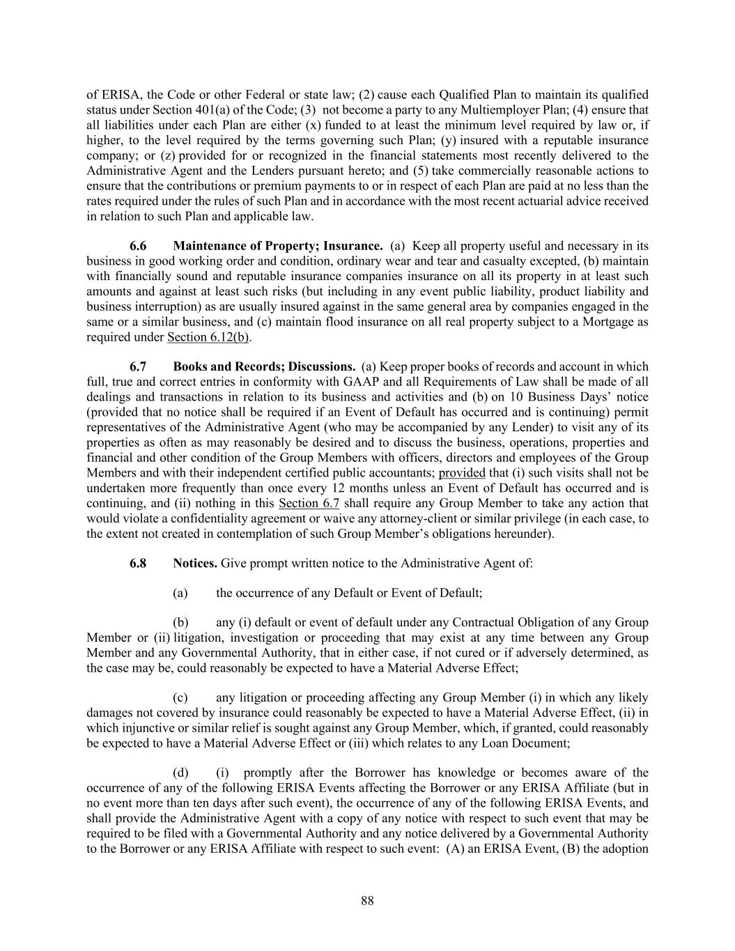 88 of ERISA, the Code or other Federal or state law; (2) cause each Qualified Plan to maintain its qualified status under Section 401(a) of the Code; (3) not become a party to any Multiemployer Plan; (4) ensure that all liabilities under each Plan are either (x) funded to at least the minimum level required by law or, if higher, to the level required by the terms governing such Plan; (y) insured with a reputable insurance company; or (z) provided for or recognized in the financial statements most recently delivered to the Administrative Agent and the Lenders pursuant hereto; and (5) take commercially reasonable actions to ensure that the contributions or premium payments to or in respect of each Plan are paid at no less than the rates required under the rules of such Plan and in accordance with the most recent actuarial advice received in relation to such Plan and applicable law. Maintenance of Property; Insurance. (a) Keep all property useful and necessary in its business in good working order and condition, ordinary wear and tear and casualty excepted, (b) maintain with financially sound and reputable insurance companies insurance on all its property in at least such amounts and against at least such risks (but including in any event public liability, product liability and business interruption) as are usually insured against in the same general area by companies engaged in the same or a similar business, and (c) maintain flood insurance on all real property subject to a Mortgage as required under Section 6.12(b). Books and Records; Discussions. (a) Keep proper books of records and account in which full, true and correct entries in conformity with GAAP and all Requirements of Law shall be made of all dealings and transactions in relation to its business and activities and (b) on 10 Business Days’ notice (provided that no notice shall be required if an Event of Default has occurred and is continuing) permit representatives of the Administrative Agent (who may be accompanied by any Lender) to visit any of its properties as often as may reasonably be desired and to discuss the business, operations, properties and financial and other condition of the Group Members with officers, directors and employees of the Group Members and with their independent certified public accountants; provided that (i) such visits shall not be undertaken more frequently than once every 12 months unless an Event of Default has occurred and is continuing, and (ii) nothing in this Section 6.7 shall require any Group Member to take any action that would violate a confidentiality agreement or waive any attorney-client or similar privilege (in each case, to the extent not created in contemplation of such Group Member’s obligations hereunder). Notices. Give prompt written notice to the Administrative Agent of: (a) the occurrence of any Default or Event of Default; (b) any (i) default or event of default under any Contractual Obligation of any Group Member or (ii) litigation, investigation or proceeding that may exist at any time between any Group Member and any Governmental Authority, that in either case, if not cured or if adversely determined, as the case may be, could reasonably be expected to have a Material Adverse Effect; (c) any litigation or proceeding affecting any Group Member (i) in which any likely damages not covered by insurance could reasonably be expected to have a Material Adverse Effect, (ii) in which injunctive or similar relief is sought against any Group Member, which, if granted, could reasonably be expected to have a Material Adverse Effect or (iii) which relates to any Loan Document; (d) (i) promptly after the Borrower has knowledge or becomes aware of the occurrence of any of the following ERISA Events affecting the Borrower or any ERISA Affiliate (but in no event more than ten days after such event), the occurrence of any of the following ERISA Events, and shall provide the Administrative Agent with a copy of any notice with respect to such event that may be required to be filed with a Governmental Authority and any notice delivered by a Governmental Authority to the Borrower or any ERISA Affiliate with respect to such event: (A) an ERISA Event, (B) the adoption