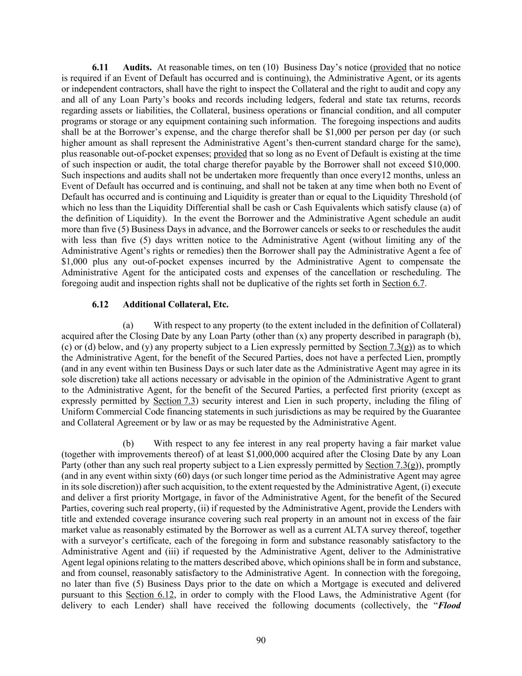 90 Audits. At reasonable times, on ten (10) Business Day’s notice (provided that no notice is required if an Event of Default has occurred and is continuing), the Administrative Agent, or its agents or independent contractors, shall have the right to inspect the Collateral and the right to audit and copy any and all of any Loan Party’s books and records including ledgers, federal and state tax returns, records regarding assets or liabilities, the Collateral, business operations or financial condition, and all computer programs or storage or any equipment containing such information. The foregoing inspections and audits shall be at the Borrower’s expense, and the charge therefor shall be $1,000 per person per day (or such higher amount as shall represent the Administrative Agent’s then-current standard charge for the same), plus reasonable out-of-pocket expenses; provided that so long as no Event of Default is existing at the time of such inspection or audit, the total charge therefor payable by the Borrower shall not exceed $10,000. Such inspections and audits shall not be undertaken more frequently than once every12 months, unless an Event of Default has occurred and is continuing, and shall not be taken at any time when both no Event of Default has occurred and is continuing and Liquidity is greater than or equal to the Liquidity Threshold (of which no less than the Liquidity Differential shall be cash or Cash Equivalents which satisfy clause (a) of the definition of Liquidity). In the event the Borrower and the Administrative Agent schedule an audit more than five (5) Business Days in advance, and the Borrower cancels or seeks to or reschedules the audit with less than five (5) days written notice to the Administrative Agent (without limiting any of the Administrative Agent’s rights or remedies) then the Borrower shall pay the Administrative Agent a fee of $1,000 plus any out-of-pocket expenses incurred by the Administrative Agent to compensate the Administrative Agent for the anticipated costs and expenses of the cancellation or rescheduling. The foregoing audit and inspection rights shall not be duplicative of the rights set forth in Section 6.7. Additional Collateral, Etc. (a) With respect to any property (to the extent included in the definition of Collateral) acquired after the Closing Date by any Loan Party (other than (x) any property described in paragraph (b), (c) or (d) below, and (y) any property subject to a Lien expressly permitted by Section 7.3(g)) as to which the Administrative Agent, for the benefit of the Secured Parties, does not have a perfected Lien, promptly (and in any event within ten Business Days or such later date as the Administrative Agent may agree in its sole discretion) take all actions necessary or advisable in the opinion of the Administrative Agent to grant to the Administrative Agent, for the benefit of the Secured Parties, a perfected first priority (except as expressly permitted by Section 7.3) security interest and Lien in such property, including the filing of Uniform Commercial Code financing statements in such jurisdictions as may be required by the Guarantee and Collateral Agreement or by law or as may be requested by the Administrative Agent. (b) With respect to any fee interest in any real property having a fair market value (together with improvements thereof) of at least $1,000,000 acquired after the Closing Date by any Loan Party (other than any such real property subject to a Lien expressly permitted by Section 7.3(g)), promptly (and in any event within sixty (60) days (or such longer time period as the Administrative Agent may agree in its sole discretion)) after such acquisition, to the extent requested by the Administrative Agent, (i) execute and deliver a first priority Mortgage, in favor of the Administrative Agent, for the benefit of the Secured Parties, covering such real property, (ii) if requested by the Administrative Agent, provide the Lenders with title and extended coverage insurance covering such real property in an amount not in excess of the fair market value as reasonably estimated by the Borrower as well as a current ALTA survey thereof, together with a surveyor’s certificate, each of the foregoing in form and substance reasonably satisfactory to the Administrative Agent and (iii) if requested by the Administrative Agent, deliver to the Administrative Agent legal opinions relating to the matters described above, which opinions shall be in form and substance, and from counsel, reasonably satisfactory to the Administrative Agent. In connection with the foregoing, no later than five (5) Business Days prior to the date on which a Mortgage is executed and delivered pursuant to this Section 6.12, in order to comply with the Flood Laws, the Administrative Agent (for delivery to each Lender) shall have received the following documents (collectively, the “Flood