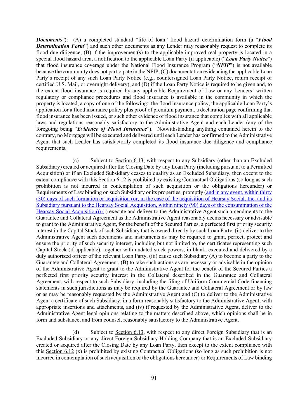 91 Documents”): (A) a completed standard “life of loan” flood hazard determination form (a “Flood Determination Form”) and such other documents as any Lender may reasonably request to complete its flood due diligence, (B) if the improvement(s) to the applicable improved real property is located in a special flood hazard area, a notification to the applicable Loan Party (if applicable) (“Loan Party Notice”) that flood insurance coverage under the National Flood Insurance Program (“NFIP”) is not available because the community does not participate in the NFIP, (C) documentation evidencing the applicable Loan Party’s receipt of any such Loan Party Notice (e.g., countersigned Loan Party Notice, return receipt of certified U.S. Mail, or overnight delivery), and (D) if the Loan Party Notice is required to be given and, to the extent flood insurance is required by any applicable Requirement of Law or any Lenders’ written regulatory or compliance procedures and flood insurance is available in the community in which the property is located, a copy of one of the following: the flood insurance policy, the applicable Loan Party’s application for a flood insurance policy plus proof of premium payment, a declaration page confirming that flood insurance has been issued, or such other evidence of flood insurance that complies with all applicable laws and regulations reasonably satisfactory to the Administrative Agent and each Lender (any of the foregoing being “Evidence of Flood Insurance”). Notwithstanding anything contained herein to the contrary, no Mortgage will be executed and delivered until each Lender has confirmed to the Administrative Agent that such Lender has satisfactorily completed its flood insurance due diligence and compliance requirements. (c) Subject to Section 6.13, with respect to any Subsidiary (other than an Excluded Subsidiary) created or acquired after the Closing Date by any Loan Party (including pursuant to a Permitted Acquisition) or if an Excluded Subsidiary ceases to qualify as an Excluded Subsidiary, then except to the extent compliance with this Section 6.12 is prohibited by existing Contractual Obligations (so long as such prohibition is not incurred in contemplation of such acquisition or the obligations hereunder) or Requirements of Law binding on such Subsidiary or its properties, promptly (and in any event, within thirty (30) days of such formation or acquisition (or, in the case of the acquisition of Hearsay Social, Inc. and its Subsidiary pursuant to the Hearsay Social Acquisition, within ninety (90) days of the consummation of the Hearsay Social Acquisition)) (i) execute and deliver to the Administrative Agent such amendments to the Guarantee and Collateral Agreement as the Administrative Agent reasonably deems necessary or advisable to grant to the Administrative Agent, for the benefit of the Secured Parties, a perfected first priority security interest in the Capital Stock of such Subsidiary that is owned directly by such Loan Party, (ii) deliver to the Administrative Agent such documents and instruments as may be required to grant, perfect, protect and ensure the priority of such security interest, including but not limited to, the certificates representing such Capital Stock (if applicable), together with undated stock powers, in blank, executed and delivered by a duly authorized officer of the relevant Loan Party, (iii) cause such Subsidiary (A) to become a party to the Guarantee and Collateral Agreement, (B) to take such actions as are necessary or advisable in the opinion of the Administrative Agent to grant to the Administrative Agent for the benefit of the Secured Parties a perfected first priority security interest in the Collateral described in the Guarantee and Collateral Agreement, with respect to such Subsidiary, including the filing of Uniform Commercial Code financing statements in such jurisdictions as may be required by the Guarantee and Collateral Agreement or by law or as may be reasonably requested by the Administrative Agent and (C) to deliver to the Administrative Agent a certificate of such Subsidiary, in a form reasonably satisfactory to the Administrative Agent, with appropriate insertions and attachments, and (iv) if requested by the Administrative Agent, deliver to the Administrative Agent legal opinions relating to the matters described above, which opinions shall be in form and substance, and from counsel, reasonably satisfactory to the Administrative Agent. (d) Subject to Section 6.13, with respect to any direct Foreign Subsidiary that is an Excluded Subsidiary or any direct Foreign Subsidiary Holding Company that is an Excluded Subsidiary created or acquired after the Closing Date by any Loan Party, then except to the extent compliance with this Section 6.12 (x) is prohibited by existing Contractual Obligations (so long as such prohibition is not incurred in contemplation of such acquisition or the obligations hereunder) or Requirements of Law binding
