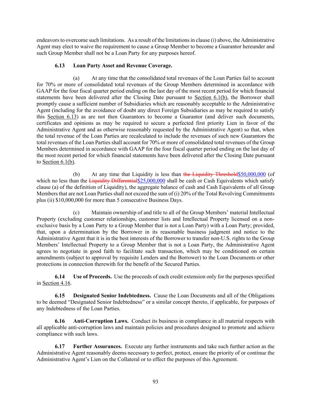 93 endeavors to overcome such limitations. As a result of the limitations in clause (i) above, the Administrative Agent may elect to waive the requirement to cause a Group Member to become a Guarantor hereunder and such Group Member shall not be a Loan Party for any purposes hereof. Loan Party Asset and Revenue Coverage. (a) At any time that the consolidated total revenues of the Loan Parties fail to account for 70% or more of consolidated total revenues of the Group Members determined in accordance with GAAP for the four fiscal quarter period ending on the last day of the most recent period for which financial statements have been delivered after the Closing Date pursuant to Section 6.1(b), the Borrower shall promptly cause a sufficient number of Subsidiaries which are reasonably acceptable to the Administrative Agent (including for the avoidance of doubt any direct Foreign Subsidiaries as may be required to satisfy this Section 6.13) as are not then Guarantors to become a Guarantor (and deliver such documents, certificates and opinions as may be required to secure a perfected first priority Lien in favor of the Administrative Agent and as otherwise reasonably requested by the Administrative Agent) so that, when the total revenue of the Loan Parties are recalculated to include the revenues of such new Guarantors the total revenues of the Loan Parties shall account for 70% or more of consolidated total revenues of the Group Members determined in accordance with GAAP for the four fiscal quarter period ending on the last day of the most recent period for which financial statements have been delivered after the Closing Date pursuant to Section 6.1(b). (b) At any time that Liquidity is less than the Liquidity Threshold$50,000,000 (of which no less than the Liquidity Differential$25,000,000 shall be cash or Cash Equivalents which satisfy clause (a) of the definition of Liquidity), the aggregate balance of cash and Cash Equivalents of all Group Members that are not Loan Parties shall not exceed the sum of (i) 20% of the Total Revolving Commitments plus (ii) $10,000,000 for more than 5 consecutive Business Days. (c) Maintain ownership of and title to all of the Group Members’ material Intellectual Property (excluding customer relationships, customer lists and Intellectual Property licensed on a non- exclusive basis by a Loan Party to a Group Member that is not a Loan Party) with a Loan Party; provided, that, upon a determination by the Borrower in its reasonable business judgment and notice to the Administrative Agent that it is in the best interests of the Borrower to transfer non-U.S. rights to the Group Members’ Intellectual Property to a Group Member that is not a Loan Party, the Administrative Agent agrees to negotiate in good faith to facilitate such transaction, which may be conditioned on certain amendments (subject to approval by requisite Lenders and the Borrower) to the Loan Documents or other protections in connection therewith for the benefit of the Secured Parties. Use of Proceeds. Use the proceeds of each credit extension only for the purposes specified in Section 4.16. Designated Senior Indebtedness. Cause the Loan Documents and all of the Obligations to be deemed “Designated Senior Indebtedness” or a similar concept thereto, if applicable, for purposes of any Indebtedness of the Loan Parties. Anti-Corruption Laws. Conduct its business in compliance in all material respects with all applicable anti-corruption laws and maintain policies and procedures designed to promote and achieve compliance with such laws. Further Assurances. Execute any further instruments and take such further action as the Administrative Agent reasonably deems necessary to perfect, protect, ensure the priority of or continue the Administrative Agent’s Lien on the Collateral or to effect the purposes of this Agreement.
