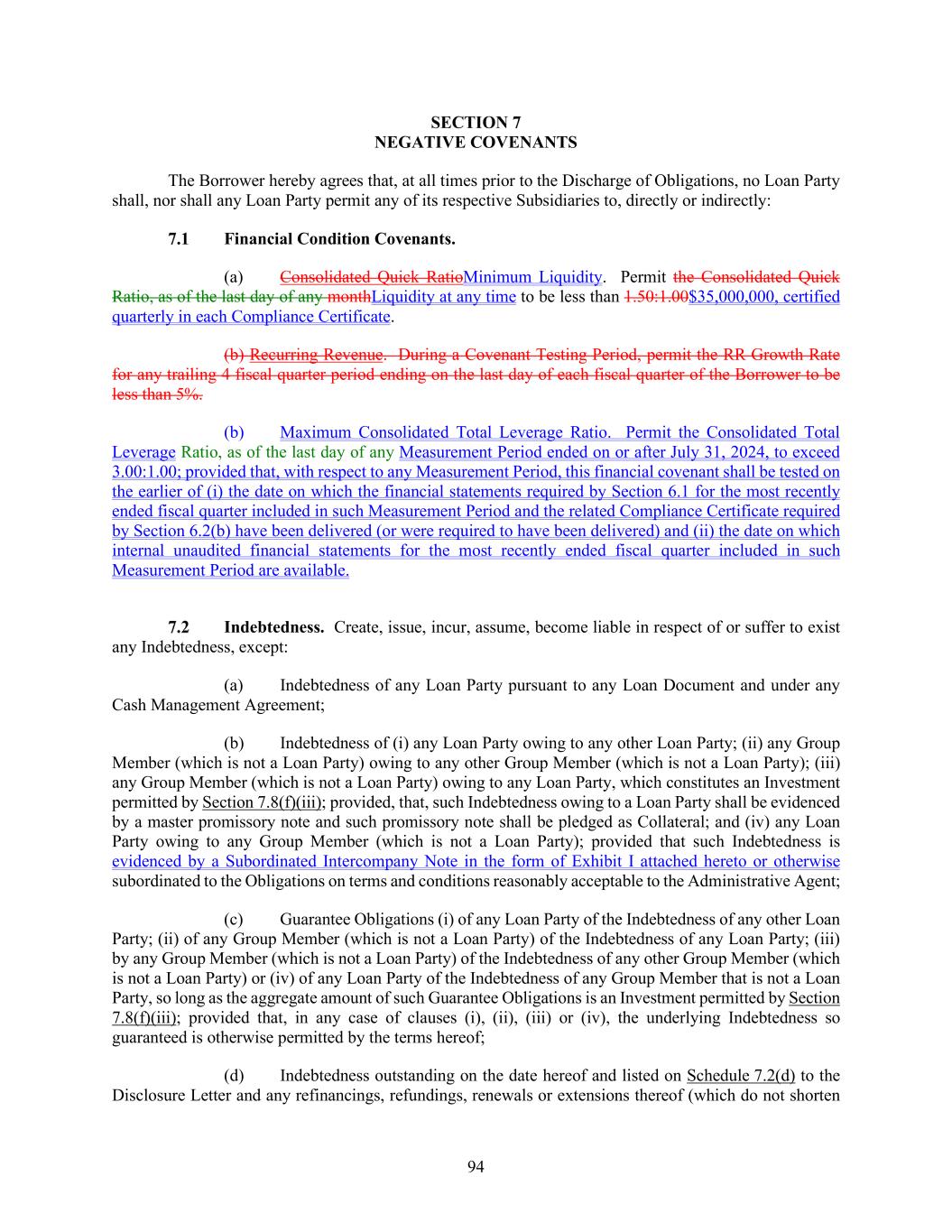 94 NEGATIVE COVENANTS The Borrower hereby agrees that, at all times prior to the Discharge of Obligations, no Loan Party shall, nor shall any Loan Party permit any of its respective Subsidiaries to, directly or indirectly: Financial Condition Covenants. (a) Consolidated Quick RatioMinimum Liquidity. Permit the Consolidated Quick Ratio, as of the last day of any monthLiquidity at any time to be less than 1.50:1.00$35,000,000, certified quarterly in each Compliance Certificate. (b) Recurring Revenue. During a Covenant Testing Period, permit the RR Growth Rate for any trailing 4 fiscal quarter period ending on the last day of each fiscal quarter of the Borrower to be less than 5%. (b) Maximum Consolidated Total Leverage Ratio. Permit the Consolidated Total Leverage Ratio, as of the last day of any Measurement Period ended on or after July 31, 2024, to exceed 3.00:1.00; provided that, with respect to any Measurement Period, this financial covenant shall be tested on the earlier of (i) the date on which the financial statements required by Section 6.1 for the most recently ended fiscal quarter included in such Measurement Period and the related Compliance Certificate required by Section 6.2(b) have been delivered (or were required to have been delivered) and (ii) the date on which internal unaudited financial statements for the most recently ended fiscal quarter included in such Measurement Period are available. Indebtedness. Create, issue, incur, assume, become liable in respect of or suffer to exist any Indebtedness, except: (a) Indebtedness of any Loan Party pursuant to any Loan Document and under any Cash Management Agreement; (b) Indebtedness of (i) any Loan Party owing to any other Loan Party; (ii) any Group Member (which is not a Loan Party) owing to any other Group Member (which is not a Loan Party); (iii) any Group Member (which is not a Loan Party) owing to any Loan Party, which constitutes an Investment permitted by Section 7.8(f)(iii); provided, that, such Indebtedness owing to a Loan Party shall be evidenced by a master promissory note and such promissory note shall be pledged as Collateral; and (iv) any Loan Party owing to any Group Member (which is not a Loan Party); provided that such Indebtedness is evidenced by a Subordinated Intercompany Note in the form of Exhibit I attached hereto or otherwise subordinated to the Obligations on terms and conditions reasonably acceptable to the Administrative Agent; (c) Guarantee Obligations (i) of any Loan Party of the Indebtedness of any other Loan Party; (ii) of any Group Member (which is not a Loan Party) of the Indebtedness of any Loan Party; (iii) by any Group Member (which is not a Loan Party) of the Indebtedness of any other Group Member (which is not a Loan Party) or (iv) of any Loan Party of the Indebtedness of any Group Member that is not a Loan Party, so long as the aggregate amount of such Guarantee Obligations is an Investment permitted by Section 7.8(f)(iii); provided that, in any case of clauses (i), (ii), (iii) or (iv), the underlying Indebtedness so guaranteed is otherwise permitted by the terms hereof; (d) Indebtedness outstanding on the date hereof and listed on Schedule 7.2(d) to the Disclosure Letter and any refinancings, refundings, renewals or extensions thereof (which do not shorten