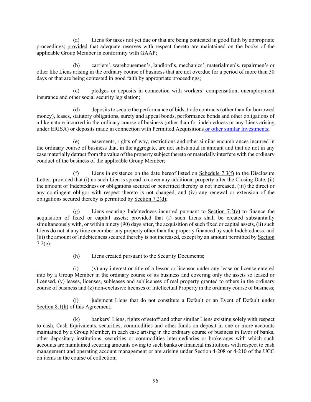 96 (a) Liens for taxes not yet due or that are being contested in good faith by appropriate proceedings; provided that adequate reserves with respect thereto are maintained on the books of the applicable Group Member in conformity with GAAP; (b) carriers’, warehousemen’s, landlord’s, mechanics’, materialmen’s, repairmen’s or other like Liens arising in the ordinary course of business that are not overdue for a period of more than 30 days or that are being contested in good faith by appropriate proceedings; (c) pledges or deposits in connection with workers’ compensation, unemployment insurance and other social security legislation; (d) deposits to secure the performance of bids, trade contracts (other than for borrowed money), leases, statutory obligations, surety and appeal bonds, performance bonds and other obligations of a like nature incurred in the ordinary course of business (other than for indebtedness or any Liens arising under ERISA) or deposits made in connection with Permitted Acquisitions or other similar Investments; (e) easements, rights-of-way, restrictions and other similar encumbrances incurred in the ordinary course of business that, in the aggregate, are not substantial in amount and that do not in any case materially detract from the value of the property subject thereto or materially interfere with the ordinary conduct of the business of the applicable Group Member; (f) Liens in existence on the date hereof listed on Schedule 7.3(f) to the Disclosure Letter; provided that (i) no such Lien is spread to cover any additional property after the Closing Date, (ii) the amount of Indebtedness or obligations secured or benefitted thereby is not increased, (iii) the direct or any contingent obligor with respect thereto is not changed, and (iv) any renewal or extension of the obligations secured thereby is permitted by Section 7.2(d); (g) Liens securing Indebtedness incurred pursuant to Section 7.2(e) to finance the acquisition of fixed or capital assets; provided that (i) such Liens shall be created substantially simultaneously with, or within ninety (90) days after, the acquisition of such fixed or capital assets, (ii) such Liens do not at any time encumber any property other than the property financed by such Indebtedness, and (iii) the amount of Indebtedness secured thereby is not increased, except by an amount permitted by Section 7.2(e); (h) Liens created pursuant to the Security Documents; (i) (x) any interest or title of a lessor or licensor under any lease or license entered into by a Group Member in the ordinary course of its business and covering only the assets so leased or licensed, (y) leases, licenses, subleases and sublicenses of real property granted to others in the ordinary course of business and (z) non-exclusive licenses of Intellectual Property in the ordinary course of business; (j) judgment Liens that do not constitute a Default or an Event of Default under Section 8.1(h) of this Agreement; (k) bankers’ Liens, rights of setoff and other similar Liens existing solely with respect to cash, Cash Equivalents, securities, commodities and other funds on deposit in one or more accounts maintained by a Group Member, in each case arising in the ordinary course of business in favor of banks, other depositary institutions, securities or commodities intermediaries or brokerages with which such accounts are maintained securing amounts owing to such banks or financial institutions with respect to cash management and operating account management or are arising under Section 4-208 or 4-210 of the UCC on items in the course of collection;