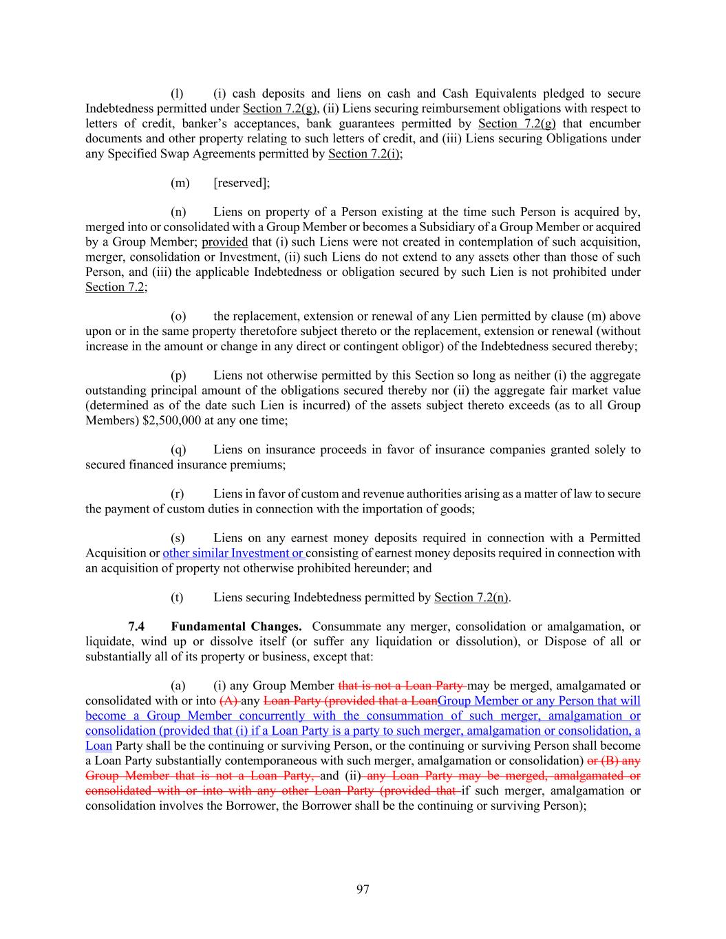 97 (l) (i) cash deposits and liens on cash and Cash Equivalents pledged to secure Indebtedness permitted under Section 7.2(g), (ii) Liens securing reimbursement obligations with respect to letters of credit, banker’s acceptances, bank guarantees permitted by Section 7.2(g) that encumber documents and other property relating to such letters of credit, and (iii) Liens securing Obligations under any Specified Swap Agreements permitted by Section 7.2(i); (m) [reserved]; (n) Liens on property of a Person existing at the time such Person is acquired by, merged into or consolidated with a Group Member or becomes a Subsidiary of a Group Member or acquired by a Group Member; provided that (i) such Liens were not created in contemplation of such acquisition, merger, consolidation or Investment, (ii) such Liens do not extend to any assets other than those of such Person, and (iii) the applicable Indebtedness or obligation secured by such Lien is not prohibited under Section 7.2; (o) the replacement, extension or renewal of any Lien permitted by clause (m) above upon or in the same property theretofore subject thereto or the replacement, extension or renewal (without increase in the amount or change in any direct or contingent obligor) of the Indebtedness secured thereby; (p) Liens not otherwise permitted by this Section so long as neither (i) the aggregate outstanding principal amount of the obligations secured thereby nor (ii) the aggregate fair market value (determined as of the date such Lien is incurred) of the assets subject thereto exceeds (as to all Group Members) $2,500,000 at any one time; (q) Liens on insurance proceeds in favor of insurance companies granted solely to secured financed insurance premiums; (r) Liens in favor of custom and revenue authorities arising as a matter of law to secure the payment of custom duties in connection with the importation of goods; (s) Liens on any earnest money deposits required in connection with a Permitted Acquisition or other similar Investment or consisting of earnest money deposits required in connection with an acquisition of property not otherwise prohibited hereunder; and (t) Liens securing Indebtedness permitted by Section 7.2(n). Fundamental Changes. Consummate any merger, consolidation or amalgamation, or liquidate, wind up or dissolve itself (or suffer any liquidation or dissolution), or Dispose of all or substantially all of its property or business, except that: (a) (i) any Group Member that is not a Loan Party may be merged, amalgamated or consolidated with or into (A) any Loan Party (provided that a LoanGroup Member or any Person that will become a Group Member concurrently with the consummation of such merger, amalgamation or consolidation (provided that (i) if a Loan Party is a party to such merger, amalgamation or consolidation, a Loan Party shall be the continuing or surviving Person, or the continuing or surviving Person shall become a Loan Party substantially contemporaneous with such merger, amalgamation or consolidation) or (B) any Group Member that is not a Loan Party, and (ii) any Loan Party may be merged, amalgamated or consolidated with or into with any other Loan Party (provided that if such merger, amalgamation or consolidation involves the Borrower, the Borrower shall be the continuing or surviving Person);