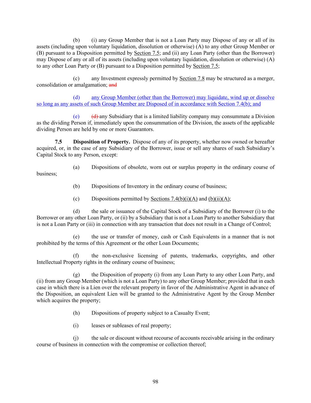98 (b) (i) any Group Member that is not a Loan Party may Dispose of any or all of its assets (including upon voluntary liquidation, dissolution or otherwise) (A) to any other Group Member or (B) pursuant to a Disposition permitted by Section 7.5; and (ii) any Loan Party (other than the Borrower) may Dispose of any or all of its assets (including upon voluntary liquidation, dissolution or otherwise) (A) to any other Loan Party or (B) pursuant to a Disposition permitted by Section 7.5; (c) any Investment expressly permitted by Section 7.8 may be structured as a merger, consolidation or amalgamation; and (d) any Group Member (other than the Borrower) may liquidate, wind up or dissolve so long as any assets of such Group Member are Disposed of in accordance with Section 7.4(b); and (e) (d) any Subsidiary that is a limited liability company may consummate a Division as the dividing Person if, immediately upon the consummation of the Division, the assets of the applicable dividing Person are held by one or more Guarantors. Disposition of Property. Dispose of any of its property, whether now owned or hereafter acquired, or, in the case of any Subsidiary of the Borrower, issue or sell any shares of such Subsidiary’s Capital Stock to any Person, except: (a) Dispositions of obsolete, worn out or surplus property in the ordinary course of business; (b) Dispositions of Inventory in the ordinary course of business; (c) Dispositions permitted by Sections 7.4(b)(i)(A) and (b)(ii)(A); (d) the sale or issuance of the Capital Stock of a Subsidiary of the Borrower (i) to the Borrower or any other Loan Party, or (ii) by a Subsidiary that is not a Loan Party to another Subsidiary that is not a Loan Party or (iii) in connection with any transaction that does not result in a Change of Control; (e) the use or transfer of money, cash or Cash Equivalents in a manner that is not prohibited by the terms of this Agreement or the other Loan Documents; (f) the non-exclusive licensing of patents, trademarks, copyrights, and other Intellectual Property rights in the ordinary course of business; (g) the Disposition of property (i) from any Loan Party to any other Loan Party, and (ii) from any Group Member (which is not a Loan Party) to any other Group Member; provided that in each case in which there is a Lien over the relevant property in favor of the Administrative Agent in advance of the Disposition, an equivalent Lien will be granted to the Administrative Agent by the Group Member which acquires the property; (h) Dispositions of property subject to a Casualty Event; (i) leases or subleases of real property; (j) the sale or discount without recourse of accounts receivable arising in the ordinary course of business in connection with the compromise or collection thereof;