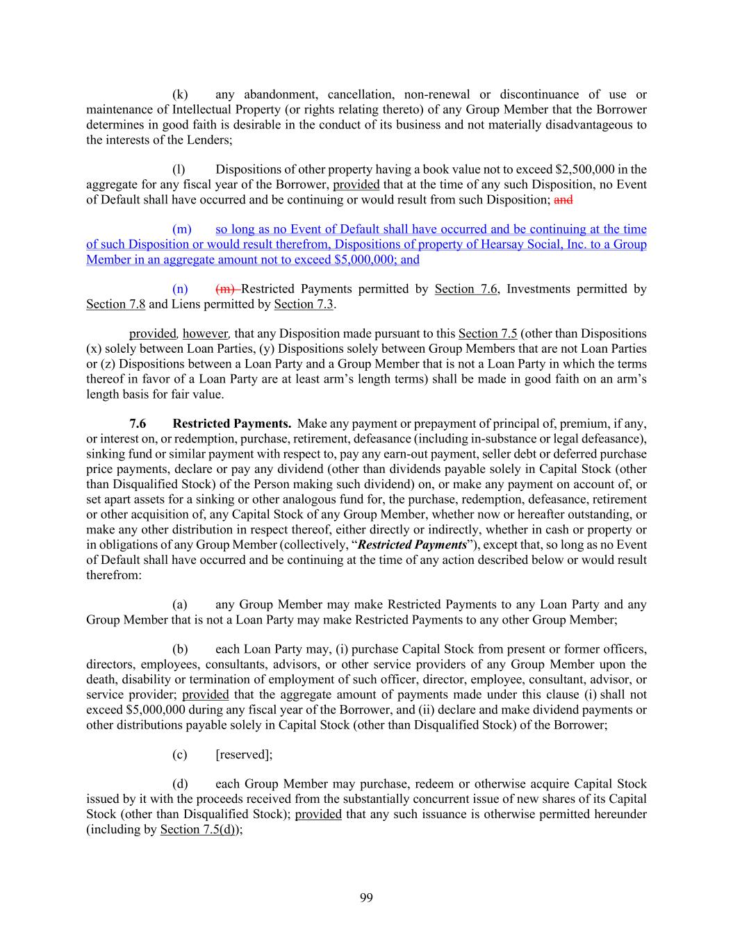 99 (k) any abandonment, cancellation, non-renewal or discontinuance of use or maintenance of Intellectual Property (or rights relating thereto) of any Group Member that the Borrower determines in good faith is desirable in the conduct of its business and not materially disadvantageous to the interests of the Lenders; (l) Dispositions of other property having a book value not to exceed $2,500,000 in the aggregate for any fiscal year of the Borrower, provided that at the time of any such Disposition, no Event of Default shall have occurred and be continuing or would result from such Disposition; and (m) so long as no Event of Default shall have occurred and be continuing at the time of such Disposition or would result therefrom, Dispositions of property of Hearsay Social, Inc. to a Group Member in an aggregate amount not to exceed $5,000,000; and (n) (m) Restricted Payments permitted by Section 7.6, Investments permitted by Section 7.8 and Liens permitted by Section 7.3. provided, however, that any Disposition made pursuant to this Section 7.5 (other than Dispositions (x) solely between Loan Parties, (y) Dispositions solely between Group Members that are not Loan Parties or (z) Dispositions between a Loan Party and a Group Member that is not a Loan Party in which the terms thereof in favor of a Loan Party are at least arm’s length terms) shall be made in good faith on an arm’s length basis for fair value. Restricted Payments. Make any payment or prepayment of principal of, premium, if any, or interest on, or redemption, purchase, retirement, defeasance (including in-substance or legal defeasance), sinking fund or similar payment with respect to, pay any earn-out payment, seller debt or deferred purchase price payments, declare or pay any dividend (other than dividends payable solely in Capital Stock (other than Disqualified Stock) of the Person making such dividend) on, or make any payment on account of, or set apart assets for a sinking or other analogous fund for, the purchase, redemption, defeasance, retirement or other acquisition of, any Capital Stock of any Group Member, whether now or hereafter outstanding, or make any other distribution in respect thereof, either directly or indirectly, whether in cash or property or in obligations of any Group Member (collectively, “Restricted Payments”), except that, so long as no Event of Default shall have occurred and be continuing at the time of any action described below or would result therefrom: (a) any Group Member may make Restricted Payments to any Loan Party and any Group Member that is not a Loan Party may make Restricted Payments to any other Group Member; (b) each Loan Party may, (i) purchase Capital Stock from present or former officers, directors, employees, consultants, advisors, or other service providers of any Group Member upon the death, disability or termination of employment of such officer, director, employee, consultant, advisor, or service provider; provided that the aggregate amount of payments made under this clause (i) shall not exceed $5,000,000 during any fiscal year of the Borrower, and (ii) declare and make dividend payments or other distributions payable solely in Capital Stock (other than Disqualified Stock) of the Borrower; (c) [reserved]; (d) each Group Member may purchase, redeem or otherwise acquire Capital Stock issued by it with the proceeds received from the substantially concurrent issue of new shares of its Capital Stock (other than Disqualified Stock); provided that any such issuance is otherwise permitted hereunder (including by Section 7.5(d));