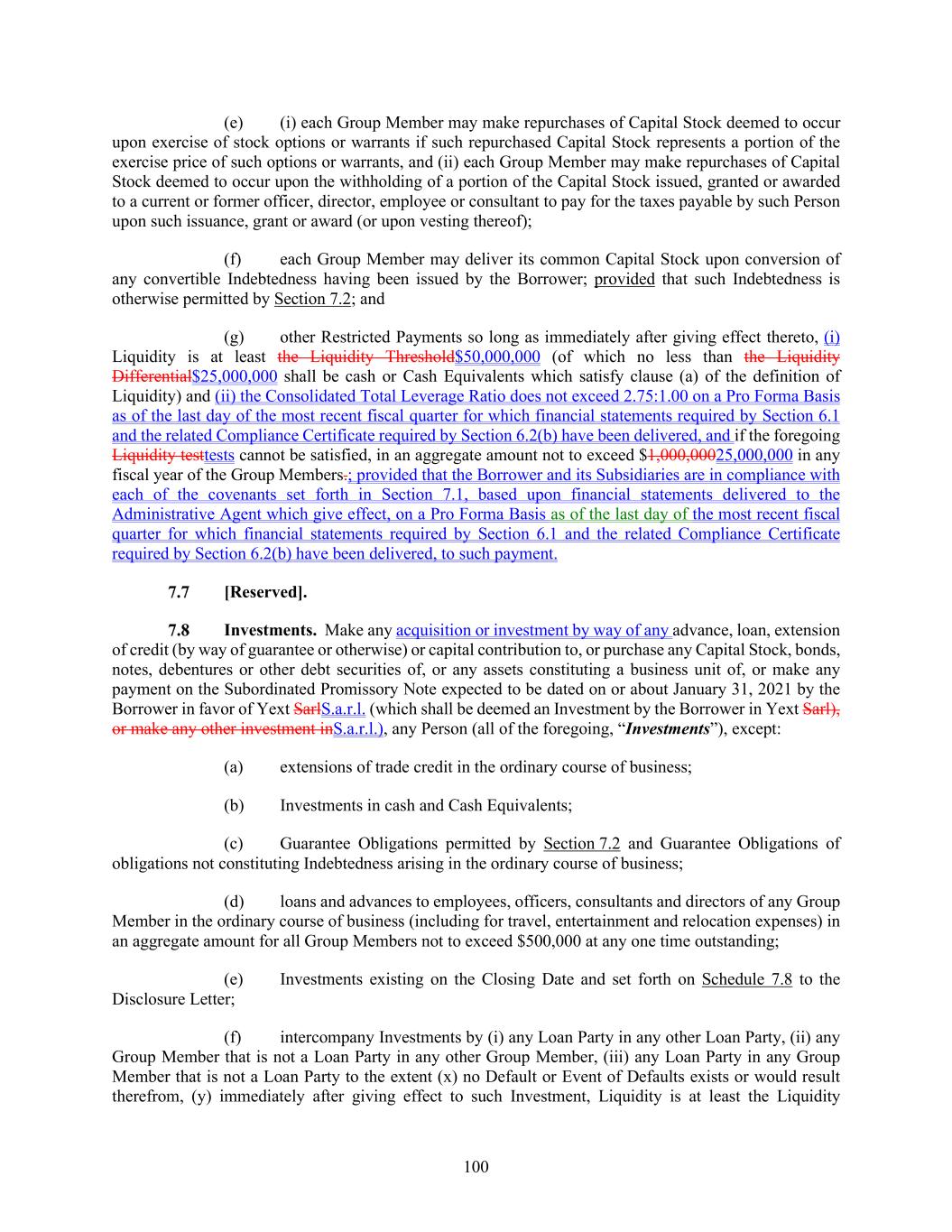100 (e) (i) each Group Member may make repurchases of Capital Stock deemed to occur upon exercise of stock options or warrants if such repurchased Capital Stock represents a portion of the exercise price of such options or warrants, and (ii) each Group Member may make repurchases of Capital Stock deemed to occur upon the withholding of a portion of the Capital Stock issued, granted or awarded to a current or former officer, director, employee or consultant to pay for the taxes payable by such Person upon such issuance, grant or award (or upon vesting thereof); (f) each Group Member may deliver its common Capital Stock upon conversion of any convertible Indebtedness having been issued by the Borrower; provided that such Indebtedness is otherwise permitted by Section 7.2; and (g) other Restricted Payments so long as immediately after giving effect thereto, (i) Liquidity is at least the Liquidity Threshold$50,000,000 (of which no less than the Liquidity Differential$25,000,000 shall be cash or Cash Equivalents which satisfy clause (a) of the definition of Liquidity) and (ii) the Consolidated Total Leverage Ratio does not exceed 2.75:1.00 on a Pro Forma Basis as of the last day of the most recent fiscal quarter for which financial statements required by Section 6.1 and the related Compliance Certificate required by Section 6.2(b) have been delivered, and if the foregoing Liquidity testtests cannot be satisfied, in an aggregate amount not to exceed $1,000,00025,000,000 in any fiscal year of the Group Members.; provided that the Borrower and its Subsidiaries are in compliance with each of the covenants set forth in Section 7.1, based upon financial statements delivered to the Administrative Agent which give effect, on a Pro Forma Basis as of the last day of the most recent fiscal quarter for which financial statements required by Section 6.1 and the related Compliance Certificate required by Section 6.2(b) have been delivered, to such payment. [Reserved]. Investments. Make any acquisition or investment by way of any advance, loan, extension of credit (by way of guarantee or otherwise) or capital contribution to, or purchase any Capital Stock, bonds, notes, debentures or other debt securities of, or any assets constituting a business unit of, or make any payment on the Subordinated Promissory Note expected to be dated on or about January 31, 2021 by the Borrower in favor of Yext SarlS.a.r.l. (which shall be deemed an Investment by the Borrower in Yext Sarl), or make any other investment inS.a.r.l.), any Person (all of the foregoing, “Investments”), except: (a) extensions of trade credit in the ordinary course of business; (b) Investments in cash and Cash Equivalents; (c) Guarantee Obligations permitted by Section 7.2 and Guarantee Obligations of obligations not constituting Indebtedness arising in the ordinary course of business; (d) loans and advances to employees, officers, consultants and directors of any Group Member in the ordinary course of business (including for travel, entertainment and relocation expenses) in an aggregate amount for all Group Members not to exceed $500,000 at any one time outstanding; (e) Investments existing on the Closing Date and set forth on Schedule 7.8 to the Disclosure Letter; (f) intercompany Investments by (i) any Loan Party in any other Loan Party, (ii) any Group Member that is not a Loan Party in any other Group Member, (iii) any Loan Party in any Group Member that is not a Loan Party to the extent (x) no Default or Event of Defaults exists or would result therefrom, (y) immediately after giving effect to such Investment, Liquidity is at least the Liquidity