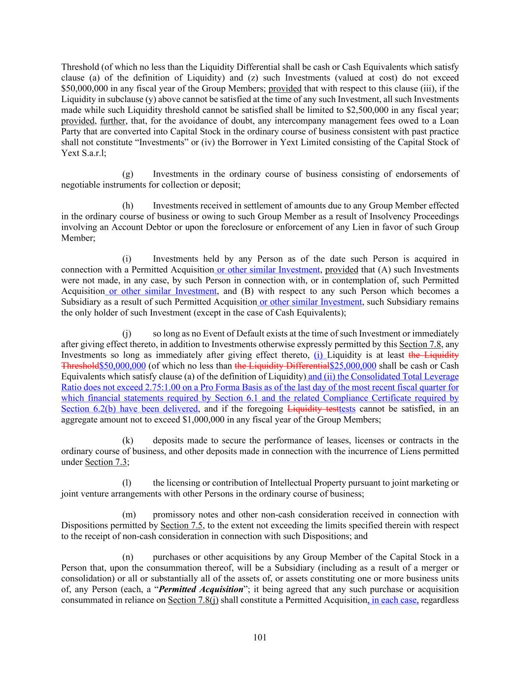 101 Threshold (of which no less than the Liquidity Differential shall be cash or Cash Equivalents which satisfy clause (a) of the definition of Liquidity) and (z) such Investments (valued at cost) do not exceed $50,000,000 in any fiscal year of the Group Members; provided that with respect to this clause (iii), if the Liquidity in subclause (y) above cannot be satisfied at the time of any such Investment, all such Investments made while such Liquidity threshold cannot be satisfied shall be limited to $2,500,000 in any fiscal year; provided, further, that, for the avoidance of doubt, any intercompany management fees owed to a Loan Party that are converted into Capital Stock in the ordinary course of business consistent with past practice shall not constitute “Investments” or (iv) the Borrower in Yext Limited consisting of the Capital Stock of Yext S.a.r.l; (g) Investments in the ordinary course of business consisting of endorsements of negotiable instruments for collection or deposit; (h) Investments received in settlement of amounts due to any Group Member effected in the ordinary course of business or owing to such Group Member as a result of Insolvency Proceedings involving an Account Debtor or upon the foreclosure or enforcement of any Lien in favor of such Group Member; (i) Investments held by any Person as of the date such Person is acquired in connection with a Permitted Acquisition or other similar Investment, provided that (A) such Investments were not made, in any case, by such Person in connection with, or in contemplation of, such Permitted Acquisition or other similar Investment, and (B) with respect to any such Person which becomes a Subsidiary as a result of such Permitted Acquisition or other similar Investment, such Subsidiary remains the only holder of such Investment (except in the case of Cash Equivalents); (j) so long as no Event of Default exists at the time of such Investment or immediately after giving effect thereto, in addition to Investments otherwise expressly permitted by this Section 7.8, any Investments so long as immediately after giving effect thereto, (i) Liquidity is at least the Liquidity Threshold$50,000,000 (of which no less than the Liquidity Differential$25,000,000 shall be cash or Cash Equivalents which satisfy clause (a) of the definition of Liquidity) and (ii) the Consolidated Total Leverage Ratio does not exceed 2.75:1.00 on a Pro Forma Basis as of the last day of the most recent fiscal quarter for which financial statements required by Section 6.1 and the related Compliance Certificate required by Section 6.2(b) have been delivered, and if the foregoing Liquidity testtests cannot be satisfied, in an aggregate amount not to exceed $1,000,000 in any fiscal year of the Group Members; (k) deposits made to secure the performance of leases, licenses or contracts in the ordinary course of business, and other deposits made in connection with the incurrence of Liens permitted under Section 7.3; (l) the licensing or contribution of Intellectual Property pursuant to joint marketing or joint venture arrangements with other Persons in the ordinary course of business; (m) promissory notes and other non-cash consideration received in connection with Dispositions permitted by Section 7.5, to the extent not exceeding the limits specified therein with respect to the receipt of non-cash consideration in connection with such Dispositions; and (n) purchases or other acquisitions by any Group Member of the Capital Stock in a Person that, upon the consummation thereof, will be a Subsidiary (including as a result of a merger or consolidation) or all or substantially all of the assets of, or assets constituting one or more business units of, any Person (each, a “Permitted Acquisition”; it being agreed that any such purchase or acquisition consummated in reliance on Section 7.8(j) shall constitute a Permitted Acquisition, in each case, regardless