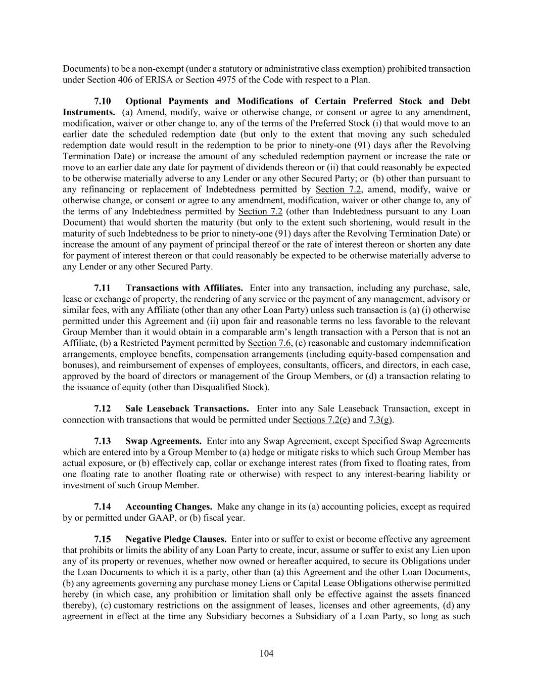 104 Documents) to be a non-exempt (under a statutory or administrative class exemption) prohibited transaction under Section 406 of ERISA or Section 4975 of the Code with respect to a Plan. Optional Payments and Modifications of Certain Preferred Stock and Debt Instruments. (a) Amend, modify, waive or otherwise change, or consent or agree to any amendment, modification, waiver or other change to, any of the terms of the Preferred Stock (i) that would move to an earlier date the scheduled redemption date (but only to the extent that moving any such scheduled redemption date would result in the redemption to be prior to ninety-one (91) days after the Revolving Termination Date) or increase the amount of any scheduled redemption payment or increase the rate or move to an earlier date any date for payment of dividends thereon or (ii) that could reasonably be expected to be otherwise materially adverse to any Lender or any other Secured Party; or (b) other than pursuant to any refinancing or replacement of Indebtedness permitted by Section 7.2, amend, modify, waive or otherwise change, or consent or agree to any amendment, modification, waiver or other change to, any of the terms of any Indebtedness permitted by Section 7.2 (other than Indebtedness pursuant to any Loan Document) that would shorten the maturity (but only to the extent such shortening, would result in the maturity of such Indebtedness to be prior to ninety-one (91) days after the Revolving Termination Date) or increase the amount of any payment of principal thereof or the rate of interest thereon or shorten any date for payment of interest thereon or that could reasonably be expected to be otherwise materially adverse to any Lender or any other Secured Party. Transactions with Affiliates. Enter into any transaction, including any purchase, sale, lease or exchange of property, the rendering of any service or the payment of any management, advisory or similar fees, with any Affiliate (other than any other Loan Party) unless such transaction is (a) (i) otherwise permitted under this Agreement and (ii) upon fair and reasonable terms no less favorable to the relevant Group Member than it would obtain in a comparable arm’s length transaction with a Person that is not an Affiliate, (b) a Restricted Payment permitted by Section 7.6, (c) reasonable and customary indemnification arrangements, employee benefits, compensation arrangements (including equity-based compensation and bonuses), and reimbursement of expenses of employees, consultants, officers, and directors, in each case, approved by the board of directors or management of the Group Members, or (d) a transaction relating to the issuance of equity (other than Disqualified Stock). Sale Leaseback Transactions. Enter into any Sale Leaseback Transaction, except in connection with transactions that would be permitted under Sections 7.2(e) and 7.3(g). Swap Agreements. Enter into any Swap Agreement, except Specified Swap Agreements which are entered into by a Group Member to (a) hedge or mitigate risks to which such Group Member has actual exposure, or (b) effectively cap, collar or exchange interest rates (from fixed to floating rates, from one floating rate to another floating rate or otherwise) with respect to any interest-bearing liability or investment of such Group Member. Accounting Changes. Make any change in its (a) accounting policies, except as required by or permitted under GAAP, or (b) fiscal year. Negative Pledge Clauses. Enter into or suffer to exist or become effective any agreement that prohibits or limits the ability of any Loan Party to create, incur, assume or suffer to exist any Lien upon any of its property or revenues, whether now owned or hereafter acquired, to secure its Obligations under the Loan Documents to which it is a party, other than (a) this Agreement and the other Loan Documents, (b) any agreements governing any purchase money Liens or Capital Lease Obligations otherwise permitted hereby (in which case, any prohibition or limitation shall only be effective against the assets financed thereby), (c) customary restrictions on the assignment of leases, licenses and other agreements, (d) any agreement in effect at the time any Subsidiary becomes a Subsidiary of a Loan Party, so long as such