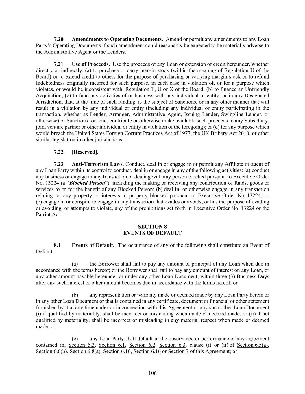 106 Amendments to Operating Documents. Amend or permit any amendments to any Loan Party’s Operating Documents if such amendment could reasonably be expected to be materially adverse to the Administrative Agent or the Lenders. Use of Proceeds. Use the proceeds of any Loan or extension of credit hereunder, whether directly or indirectly, (a) to purchase or carry margin stock (within the meaning of Regulation U of the Board) or to extend credit to others for the purpose of purchasing or carrying margin stock or to refund Indebtedness originally incurred for such purpose, in each case in violation of, or for a purpose which violates, or would be inconsistent with, Regulation T, U or X of the Board; (b) to finance an Unfriendly Acquisition; (c) to fund any activities of or business with any individual or entity, or in any Designated Jurisdiction, that, at the time of such funding, is the subject of Sanctions, or in any other manner that will result in a violation by any individual or entity (including any individual or entity participating in the transaction, whether as Lender, Arranger, Administrative Agent, Issuing Lender, Swingline Lender, or otherwise) of Sanctions (or lend, contribute or otherwise make available such proceeds to any Subsidiary, joint venture partner or other individual or entity in violation of the foregoing); or (d) for any purpose which would breach the United States Foreign Corrupt Practices Act of 1977, the UK Bribery Act 2010, or other similar legislation in other jurisdictions. [Reserved]. Anti-Terrorism Laws. Conduct, deal in or engage in or permit any Affiliate or agent of any Loan Party within its control to conduct, deal in or engage in any of the following activities: (a) conduct any business or engage in any transaction or dealing with any person blocked pursuant to Executive Order No. 13224 (a “Blocked Person”), including the making or receiving any contribution of funds, goods or services to or for the benefit of any Blocked Person; (b) deal in, or otherwise engage in any transaction relating to, any property or interests in property blocked pursuant to Executive Order No. 13224; or (c) engage in or conspire to engage in any transaction that evades or avoids, or has the purpose of evading or avoiding, or attempts to violate, any of the prohibitions set forth in Executive Order No. 13224 or the Patriot Act. EVENTS OF DEFAULT Events of Default. The occurrence of any of the following shall constitute an Event of Default: (a) the Borrower shall fail to pay any amount of principal of any Loan when due in accordance with the terms hereof; or the Borrower shall fail to pay any amount of interest on any Loan, or any other amount payable hereunder or under any other Loan Document, within three (3) Business Days after any such interest or other amount becomes due in accordance with the terms hereof; or (b) any representation or warranty made or deemed made by any Loan Party herein or in any other Loan Document or that is contained in any certificate, document or financial or other statement furnished by it at any time under or in connection with this Agreement or any such other Loan Document (i) if qualified by materiality, shall be incorrect or misleading when made or deemed made, or (ii) if not qualified by materiality, shall be incorrect or misleading in any material respect when made or deemed made; or (c) any Loan Party shall default in the observance or performance of any agreement contained in, Section 5.3, Section 6.1, Section 6.2, Section 6.3, clause (i) or (ii) of Section 6.5(a), Section 6.6(b), Section 6.8(a), Section 6.10, Section 6.16 or Section 7 of this Agreement; or