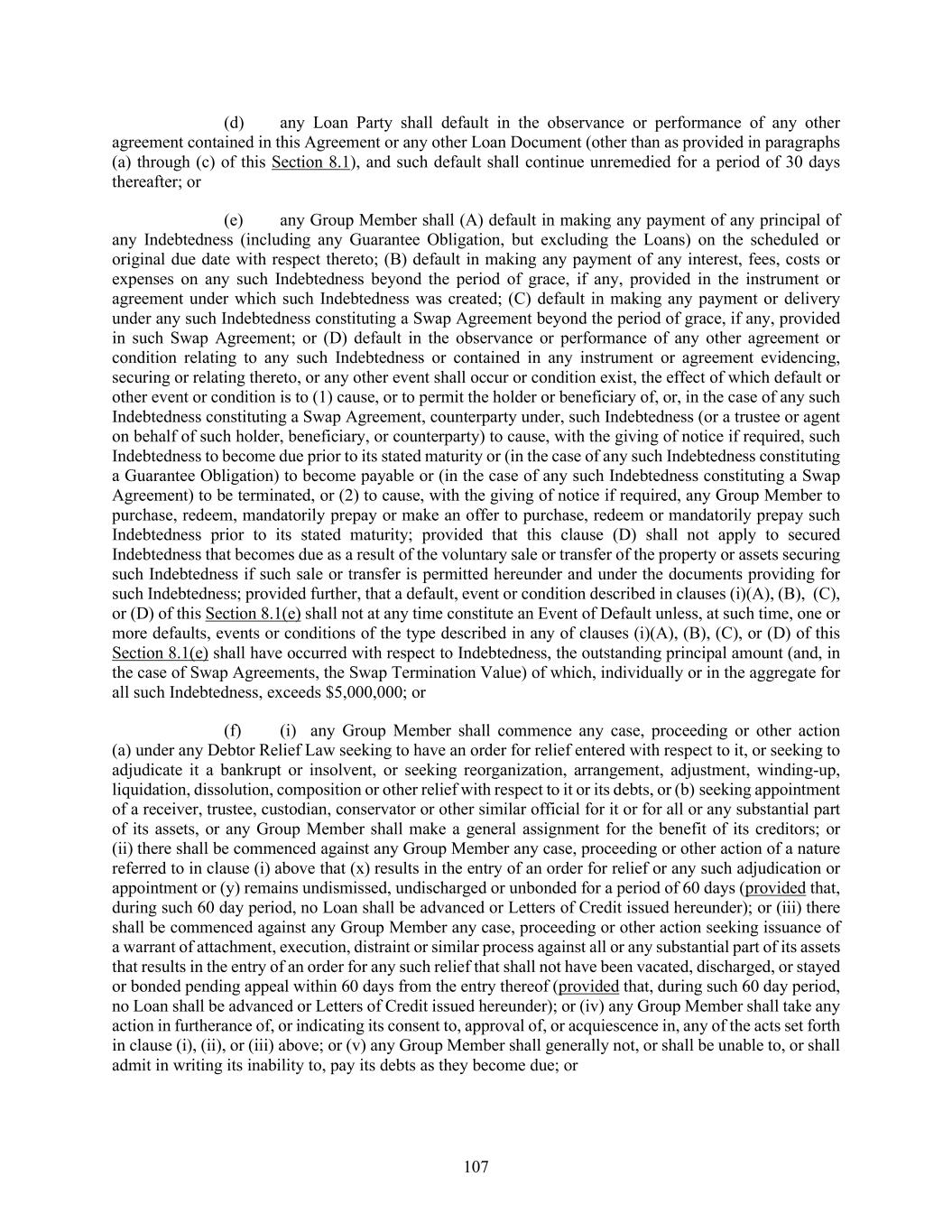 107 (d) any Loan Party shall default in the observance or performance of any other agreement contained in this Agreement or any other Loan Document (other than as provided in paragraphs (a) through (c) of this Section 8.1), and such default shall continue unremedied for a period of 30 days thereafter; or (e) any Group Member shall (A) default in making any payment of any principal of any Indebtedness (including any Guarantee Obligation, but excluding the Loans) on the scheduled or original due date with respect thereto; (B) default in making any payment of any interest, fees, costs or expenses on any such Indebtedness beyond the period of grace, if any, provided in the instrument or agreement under which such Indebtedness was created; (C) default in making any payment or delivery under any such Indebtedness constituting a Swap Agreement beyond the period of grace, if any, provided in such Swap Agreement; or (D) default in the observance or performance of any other agreement or condition relating to any such Indebtedness or contained in any instrument or agreement evidencing, securing or relating thereto, or any other event shall occur or condition exist, the effect of which default or other event or condition is to (1) cause, or to permit the holder or beneficiary of, or, in the case of any such Indebtedness constituting a Swap Agreement, counterparty under, such Indebtedness (or a trustee or agent on behalf of such holder, beneficiary, or counterparty) to cause, with the giving of notice if required, such Indebtedness to become due prior to its stated maturity or (in the case of any such Indebtedness constituting a Guarantee Obligation) to become payable or (in the case of any such Indebtedness constituting a Swap Agreement) to be terminated, or (2) to cause, with the giving of notice if required, any Group Member to purchase, redeem, mandatorily prepay or make an offer to purchase, redeem or mandatorily prepay such Indebtedness prior to its stated maturity; provided that this clause (D) shall not apply to secured Indebtedness that becomes due as a result of the voluntary sale or transfer of the property or assets securing such Indebtedness if such sale or transfer is permitted hereunder and under the documents providing for such Indebtedness; provided further, that a default, event or condition described in clauses (i)(A), (B), (C), or (D) of this Section 8.1(e) shall not at any time constitute an Event of Default unless, at such time, one or more defaults, events or conditions of the type described in any of clauses (i)(A), (B), (C), or (D) of this Section 8.1(e) shall have occurred with respect to Indebtedness, the outstanding principal amount (and, in the case of Swap Agreements, the Swap Termination Value) of which, individually or in the aggregate for all such Indebtedness, exceeds $5,000,000; or (f) (i) any Group Member shall commence any case, proceeding or other action (a) under any Debtor Relief Law seeking to have an order for relief entered with respect to it, or seeking to adjudicate it a bankrupt or insolvent, or seeking reorganization, arrangement, adjustment, winding-up, liquidation, dissolution, composition or other relief with respect to it or its debts, or (b) seeking appointment of a receiver, trustee, custodian, conservator or other similar official for it or for all or any substantial part of its assets, or any Group Member shall make a general assignment for the benefit of its creditors; or (ii) there shall be commenced against any Group Member any case, proceeding or other action of a nature referred to in clause (i) above that (x) results in the entry of an order for relief or any such adjudication or appointment or (y) remains undismissed, undischarged or unbonded for a period of 60 days (provided that, during such 60 day period, no Loan shall be advanced or Letters of Credit issued hereunder); or (iii) there shall be commenced against any Group Member any case, proceeding or other action seeking issuance of a warrant of attachment, execution, distraint or similar process against all or any substantial part of its assets that results in the entry of an order for any such relief that shall not have been vacated, discharged, or stayed or bonded pending appeal within 60 days from the entry thereof (provided that, during such 60 day period, no Loan shall be advanced or Letters of Credit issued hereunder); or (iv) any Group Member shall take any action in furtherance of, or indicating its consent to, approval of, or acquiescence in, any of the acts set forth in clause (i), (ii), or (iii) above; or (v) any Group Member shall generally not, or shall be unable to, or shall admit in writing its inability to, pay its debts as they become due; or