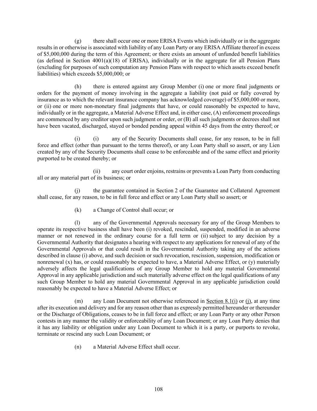 108 (g) there shall occur one or more ERISA Events which individually or in the aggregate results in or otherwise is associated with liability of any Loan Party or any ERISA Affiliate thereof in excess of $5,000,000 during the term of this Agreement; or there exists an amount of unfunded benefit liabilities (as defined in Section 4001(a)(18) of ERISA), individually or in the aggregate for all Pension Plans (excluding for purposes of such computation any Pension Plans with respect to which assets exceed benefit liabilities) which exceeds $5,000,000; or (h) there is entered against any Group Member (i) one or more final judgments or orders for the payment of money involving in the aggregate a liability (not paid or fully covered by insurance as to which the relevant insurance company has acknowledged coverage) of $5,000,000 or more, or (ii) one or more non-monetary final judgments that have, or could reasonably be expected to have, individually or in the aggregate, a Material Adverse Effect and, in either case, (A) enforcement proceedings are commenced by any creditor upon such judgment or order, or (B) all such judgments or decrees shall not have been vacated, discharged, stayed or bonded pending appeal within 45 days from the entry thereof; or (i) (i) any of the Security Documents shall cease, for any reason, to be in full force and effect (other than pursuant to the terms thereof), or any Loan Party shall so assert, or any Lien created by any of the Security Documents shall cease to be enforceable and of the same effect and priority purported to be created thereby; or (ii) any court order enjoins, restrains or prevents a Loan Party from conducting all or any material part of its business; or (j) the guarantee contained in Section 2 of the Guarantee and Collateral Agreement shall cease, for any reason, to be in full force and effect or any Loan Party shall so assert; or (k) a Change of Control shall occur; or (l) any of the Governmental Approvals necessary for any of the Group Members to operate its respective business shall have been (i) revoked, rescinded, suspended, modified in an adverse manner or not renewed in the ordinary course for a full term or (ii) subject to any decision by a Governmental Authority that designates a hearing with respect to any applications for renewal of any of the Governmental Approvals or that could result in the Governmental Authority taking any of the actions described in clause (i) above, and such decision or such revocation, rescission, suspension, modification or nonrenewal (x) has, or could reasonably be expected to have, a Material Adverse Effect, or (y) materially adversely affects the legal qualifications of any Group Member to hold any material Governmental Approval in any applicable jurisdiction and such materially adverse effect on the legal qualifications of any such Group Member to hold any material Governmental Approval in any applicable jurisdiction could reasonably be expected to have a Material Adverse Effect; or (m) any Loan Document not otherwise referenced in Section 8.1(i) or (j), at any time after its execution and delivery and for any reason other than as expressly permitted hereunder or thereunder or the Discharge of Obligations, ceases to be in full force and effect; or any Loan Party or any other Person contests in any manner the validity or enforceability of any Loan Document; or any Loan Party denies that it has any liability or obligation under any Loan Document to which it is a party, or purports to revoke, terminate or rescind any such Loan Document; or (n) a Material Adverse Effect shall occur.