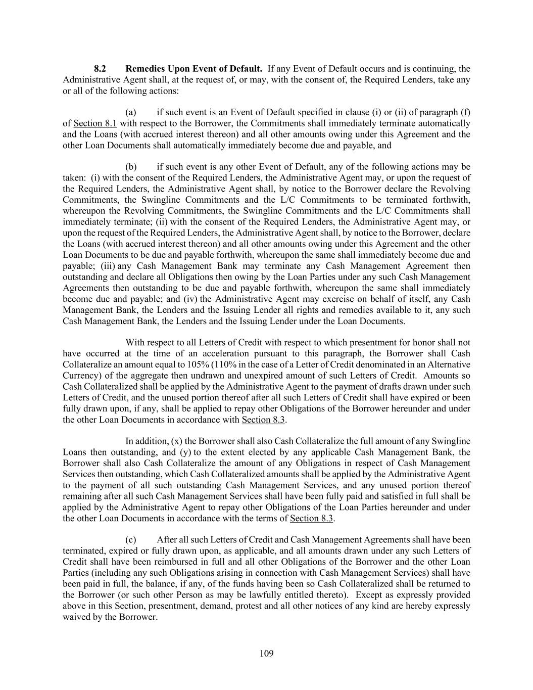 109 Remedies Upon Event of Default. If any Event of Default occurs and is continuing, the Administrative Agent shall, at the request of, or may, with the consent of, the Required Lenders, take any or all of the following actions: (a) if such event is an Event of Default specified in clause (i) or (ii) of paragraph (f) of Section 8.1 with respect to the Borrower, the Commitments shall immediately terminate automatically and the Loans (with accrued interest thereon) and all other amounts owing under this Agreement and the other Loan Documents shall automatically immediately become due and payable, and (b) if such event is any other Event of Default, any of the following actions may be taken: (i) with the consent of the Required Lenders, the Administrative Agent may, or upon the request of the Required Lenders, the Administrative Agent shall, by notice to the Borrower declare the Revolving Commitments, the Swingline Commitments and the L/C Commitments to be terminated forthwith, whereupon the Revolving Commitments, the Swingline Commitments and the L/C Commitments shall immediately terminate; (ii) with the consent of the Required Lenders, the Administrative Agent may, or upon the request of the Required Lenders, the Administrative Agent shall, by notice to the Borrower, declare the Loans (with accrued interest thereon) and all other amounts owing under this Agreement and the other Loan Documents to be due and payable forthwith, whereupon the same shall immediately become due and payable; (iii) any Cash Management Bank may terminate any Cash Management Agreement then outstanding and declare all Obligations then owing by the Loan Parties under any such Cash Management Agreements then outstanding to be due and payable forthwith, whereupon the same shall immediately become due and payable; and (iv) the Administrative Agent may exercise on behalf of itself, any Cash Management Bank, the Lenders and the Issuing Lender all rights and remedies available to it, any such Cash Management Bank, the Lenders and the Issuing Lender under the Loan Documents. With respect to all Letters of Credit with respect to which presentment for honor shall not have occurred at the time of an acceleration pursuant to this paragraph, the Borrower shall Cash Collateralize an amount equal to 105% (110% in the case of a Letter of Credit denominated in an Alternative Currency) of the aggregate then undrawn and unexpired amount of such Letters of Credit. Amounts so Cash Collateralized shall be applied by the Administrative Agent to the payment of drafts drawn under such Letters of Credit, and the unused portion thereof after all such Letters of Credit shall have expired or been fully drawn upon, if any, shall be applied to repay other Obligations of the Borrower hereunder and under the other Loan Documents in accordance with Section 8.3. In addition, (x) the Borrower shall also Cash Collateralize the full amount of any Swingline Loans then outstanding, and (y) to the extent elected by any applicable Cash Management Bank, the Borrower shall also Cash Collateralize the amount of any Obligations in respect of Cash Management Services then outstanding, which Cash Collateralized amounts shall be applied by the Administrative Agent to the payment of all such outstanding Cash Management Services, and any unused portion thereof remaining after all such Cash Management Services shall have been fully paid and satisfied in full shall be applied by the Administrative Agent to repay other Obligations of the Loan Parties hereunder and under the other Loan Documents in accordance with the terms of Section 8.3. (c) After all such Letters of Credit and Cash Management Agreements shall have been terminated, expired or fully drawn upon, as applicable, and all amounts drawn under any such Letters of Credit shall have been reimbursed in full and all other Obligations of the Borrower and the other Loan Parties (including any such Obligations arising in connection with Cash Management Services) shall have been paid in full, the balance, if any, of the funds having been so Cash Collateralized shall be returned to the Borrower (or such other Person as may be lawfully entitled thereto). Except as expressly provided above in this Section, presentment, demand, protest and all other notices of any kind are hereby expressly waived by the Borrower.
