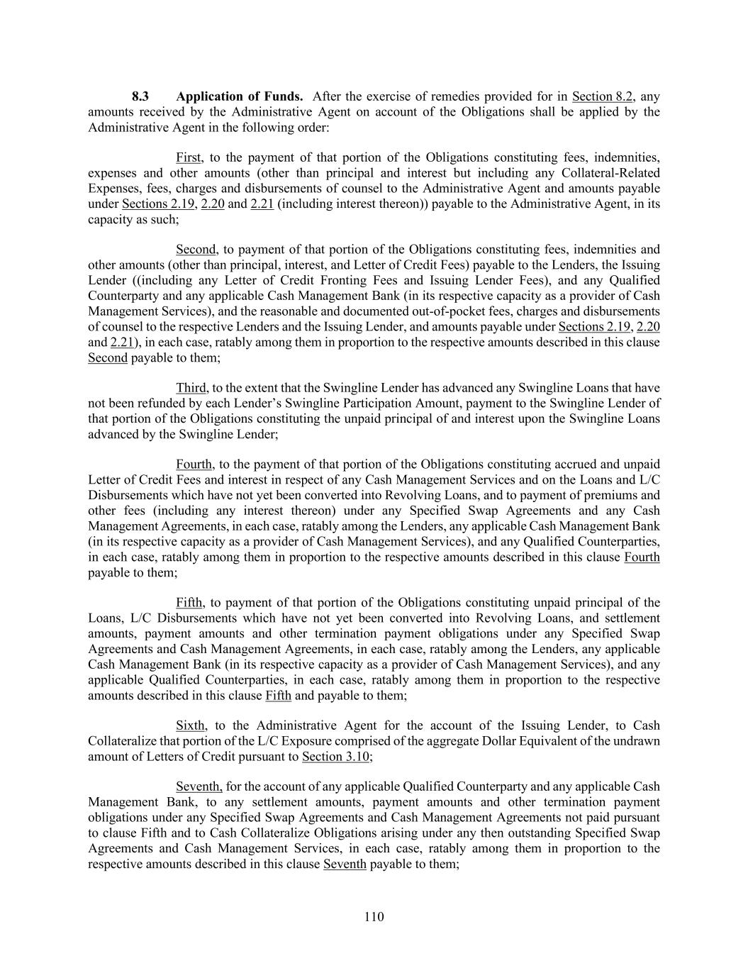 110 Application of Funds. After the exercise of remedies provided for in Section 8.2, any amounts received by the Administrative Agent on account of the Obligations shall be applied by the Administrative Agent in the following order: First, to the payment of that portion of the Obligations constituting fees, indemnities, expenses and other amounts (other than principal and interest but including any Collateral-Related Expenses, fees, charges and disbursements of counsel to the Administrative Agent and amounts payable under Sections 2.19, 2.20 and 2.21 (including interest thereon)) payable to the Administrative Agent, in its capacity as such; Second, to payment of that portion of the Obligations constituting fees, indemnities and other amounts (other than principal, interest, and Letter of Credit Fees) payable to the Lenders, the Issuing Lender ((including any Letter of Credit Fronting Fees and Issuing Lender Fees), and any Qualified Counterparty and any applicable Cash Management Bank (in its respective capacity as a provider of Cash Management Services), and the reasonable and documented out-of-pocket fees, charges and disbursements of counsel to the respective Lenders and the Issuing Lender, and amounts payable under Sections 2.19, 2.20 and 2.21), in each case, ratably among them in proportion to the respective amounts described in this clause Second payable to them; Third, to the extent that the Swingline Lender has advanced any Swingline Loans that have not been refunded by each Lender’s Swingline Participation Amount, payment to the Swingline Lender of that portion of the Obligations constituting the unpaid principal of and interest upon the Swingline Loans advanced by the Swingline Lender; Fourth, to the payment of that portion of the Obligations constituting accrued and unpaid Letter of Credit Fees and interest in respect of any Cash Management Services and on the Loans and L/C Disbursements which have not yet been converted into Revolving Loans, and to payment of premiums and other fees (including any interest thereon) under any Specified Swap Agreements and any Cash Management Agreements, in each case, ratably among the Lenders, any applicable Cash Management Bank (in its respective capacity as a provider of Cash Management Services), and any Qualified Counterparties, in each case, ratably among them in proportion to the respective amounts described in this clause Fourth payable to them; Fifth, to payment of that portion of the Obligations constituting unpaid principal of the Loans, L/C Disbursements which have not yet been converted into Revolving Loans, and settlement amounts, payment amounts and other termination payment obligations under any Specified Swap Agreements and Cash Management Agreements, in each case, ratably among the Lenders, any applicable Cash Management Bank (in its respective capacity as a provider of Cash Management Services), and any applicable Qualified Counterparties, in each case, ratably among them in proportion to the respective amounts described in this clause Fifth and payable to them; Sixth, to the Administrative Agent for the account of the Issuing Lender, to Cash Collateralize that portion of the L/C Exposure comprised of the aggregate Dollar Equivalent of the undrawn amount of Letters of Credit pursuant to Section 3.10; Seventh, for the account of any applicable Qualified Counterparty and any applicable Cash Management Bank, to any settlement amounts, payment amounts and other termination payment obligations under any Specified Swap Agreements and Cash Management Agreements not paid pursuant to clause Fifth and to Cash Collateralize Obligations arising under any then outstanding Specified Swap Agreements and Cash Management Services, in each case, ratably among them in proportion to the respective amounts described in this clause Seventh payable to them;