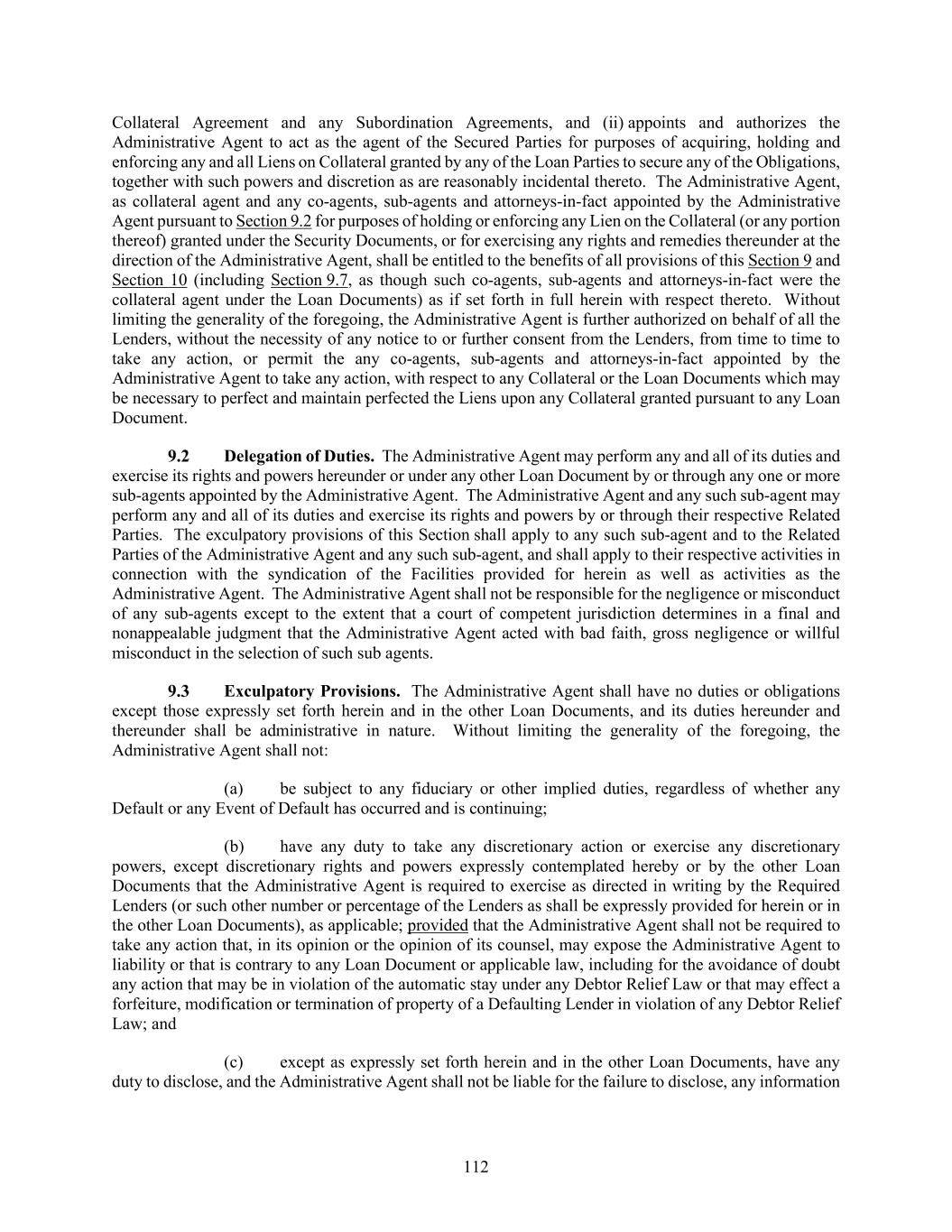 112 Collateral Agreement and any Subordination Agreements, and (ii) appoints and authorizes the Administrative Agent to act as the agent of the Secured Parties for purposes of acquiring, holding and enforcing any and all Liens on Collateral granted by any of the Loan Parties to secure any of the Obligations, together with such powers and discretion as are reasonably incidental thereto. The Administrative Agent, as collateral agent and any co-agents, sub-agents and attorneys-in-fact appointed by the Administrative Agent pursuant to Section 9.2 for purposes of holding or enforcing any Lien on the Collateral (or any portion thereof) granted under the Security Documents, or for exercising any rights and remedies thereunder at the direction of the Administrative Agent, shall be entitled to the benefits of all provisions of this Section 9 and Section 10 (including Section 9.7, as though such co-agents, sub-agents and attorneys-in-fact were the collateral agent under the Loan Documents) as if set forth in full herein with respect thereto. Without limiting the generality of the foregoing, the Administrative Agent is further authorized on behalf of all the Lenders, without the necessity of any notice to or further consent from the Lenders, from time to time to take any action, or permit the any co-agents, sub-agents and attorneys-in-fact appointed by the Administrative Agent to take any action, with respect to any Collateral or the Loan Documents which may be necessary to perfect and maintain perfected the Liens upon any Collateral granted pursuant to any Loan Document. Delegation of Duties. The Administrative Agent may perform any and all of its duties and exercise its rights and powers hereunder or under any other Loan Document by or through any one or more sub-agents appointed by the Administrative Agent. The Administrative Agent and any such sub-agent may perform any and all of its duties and exercise its rights and powers by or through their respective Related Parties. The exculpatory provisions of this Section shall apply to any such sub-agent and to the Related Parties of the Administrative Agent and any such sub-agent, and shall apply to their respective activities in connection with the syndication of the Facilities provided for herein as well as activities as the Administrative Agent. The Administrative Agent shall not be responsible for the negligence or misconduct of any sub-agents except to the extent that a court of competent jurisdiction determines in a final and nonappealable judgment that the Administrative Agent acted with bad faith, gross negligence or willful misconduct in the selection of such sub agents. Exculpatory Provisions. The Administrative Agent shall have no duties or obligations except those expressly set forth herein and in the other Loan Documents, and its duties hereunder and thereunder shall be administrative in nature. Without limiting the generality of the foregoing, the Administrative Agent shall not: (a) be subject to any fiduciary or other implied duties, regardless of whether any Default or any Event of Default has occurred and is continuing; (b) have any duty to take any discretionary action or exercise any discretionary powers, except discretionary rights and powers expressly contemplated hereby or by the other Loan Documents that the Administrative Agent is required to exercise as directed in writing by the Required Lenders (or such other number or percentage of the Lenders as shall be expressly provided for herein or in the other Loan Documents), as applicable; provided that the Administrative Agent shall not be required to take any action that, in its opinion or the opinion of its counsel, may expose the Administrative Agent to liability or that is contrary to any Loan Document or applicable law, including for the avoidance of doubt any action that may be in violation of the automatic stay under any Debtor Relief Law or that may effect a forfeiture, modification or termination of property of a Defaulting Lender in violation of any Debtor Relief Law; and (c) except as expressly set forth herein and in the other Loan Documents, have any duty to disclose, and the Administrative Agent shall not be liable for the failure to disclose, any information