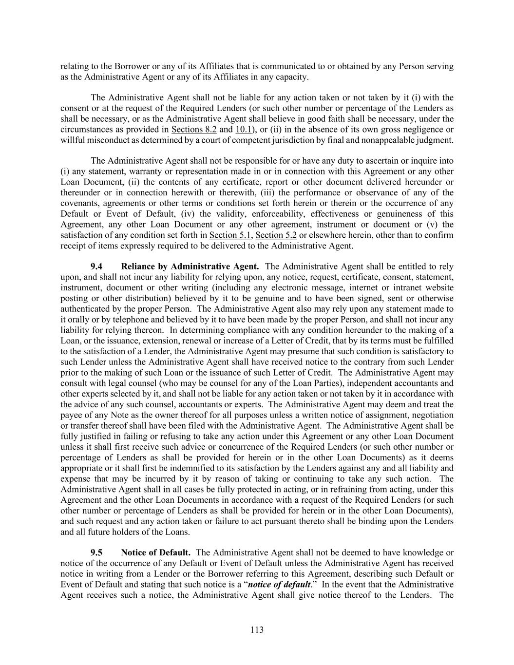 113 relating to the Borrower or any of its Affiliates that is communicated to or obtained by any Person serving as the Administrative Agent or any of its Affiliates in any capacity. The Administrative Agent shall not be liable for any action taken or not taken by it (i) with the consent or at the request of the Required Lenders (or such other number or percentage of the Lenders as shall be necessary, or as the Administrative Agent shall believe in good faith shall be necessary, under the circumstances as provided in Sections 8.2 and 10.1), or (ii) in the absence of its own gross negligence or willful misconduct as determined by a court of competent jurisdiction by final and nonappealable judgment. The Administrative Agent shall not be responsible for or have any duty to ascertain or inquire into (i) any statement, warranty or representation made in or in connection with this Agreement or any other Loan Document, (ii) the contents of any certificate, report or other document delivered hereunder or thereunder or in connection herewith or therewith, (iii) the performance or observance of any of the covenants, agreements or other terms or conditions set forth herein or therein or the occurrence of any Default or Event of Default, (iv) the validity, enforceability, effectiveness or genuineness of this Agreement, any other Loan Document or any other agreement, instrument or document or (v) the satisfaction of any condition set forth in Section 5.1, Section 5.2 or elsewhere herein, other than to confirm receipt of items expressly required to be delivered to the Administrative Agent. Reliance by Administrative Agent. The Administrative Agent shall be entitled to rely upon, and shall not incur any liability for relying upon, any notice, request, certificate, consent, statement, instrument, document or other writing (including any electronic message, internet or intranet website posting or other distribution) believed by it to be genuine and to have been signed, sent or otherwise authenticated by the proper Person. The Administrative Agent also may rely upon any statement made to it orally or by telephone and believed by it to have been made by the proper Person, and shall not incur any liability for relying thereon. In determining compliance with any condition hereunder to the making of a Loan, or the issuance, extension, renewal or increase of a Letter of Credit, that by its terms must be fulfilled to the satisfaction of a Lender, the Administrative Agent may presume that such condition is satisfactory to such Lender unless the Administrative Agent shall have received notice to the contrary from such Lender prior to the making of such Loan or the issuance of such Letter of Credit. The Administrative Agent may consult with legal counsel (who may be counsel for any of the Loan Parties), independent accountants and other experts selected by it, and shall not be liable for any action taken or not taken by it in accordance with the advice of any such counsel, accountants or experts. The Administrative Agent may deem and treat the payee of any Note as the owner thereof for all purposes unless a written notice of assignment, negotiation or transfer thereof shall have been filed with the Administrative Agent. The Administrative Agent shall be fully justified in failing or refusing to take any action under this Agreement or any other Loan Document unless it shall first receive such advice or concurrence of the Required Lenders (or such other number or percentage of Lenders as shall be provided for herein or in the other Loan Documents) as it deems appropriate or it shall first be indemnified to its satisfaction by the Lenders against any and all liability and expense that may be incurred by it by reason of taking or continuing to take any such action. The Administrative Agent shall in all cases be fully protected in acting, or in refraining from acting, under this Agreement and the other Loan Documents in accordance with a request of the Required Lenders (or such other number or percentage of Lenders as shall be provided for herein or in the other Loan Documents), and such request and any action taken or failure to act pursuant thereto shall be binding upon the Lenders and all future holders of the Loans. Notice of Default. The Administrative Agent shall not be deemed to have knowledge or notice of the occurrence of any Default or Event of Default unless the Administrative Agent has received notice in writing from a Lender or the Borrower referring to this Agreement, describing such Default or Event of Default and stating that such notice is a “notice of default.” In the event that the Administrative Agent receives such a notice, the Administrative Agent shall give notice thereof to the Lenders. The