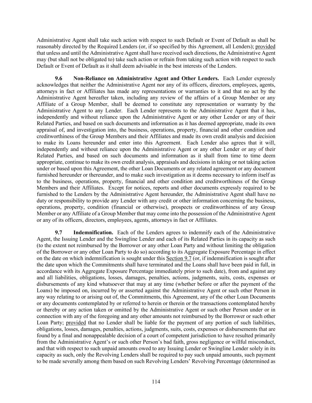 114 Administrative Agent shall take such action with respect to such Default or Event of Default as shall be reasonably directed by the Required Lenders (or, if so specified by this Agreement, all Lenders); provided that unless and until the Administrative Agent shall have received such directions, the Administrative Agent may (but shall not be obligated to) take such action or refrain from taking such action with respect to such Default or Event of Default as it shall deem advisable in the best interests of the Lenders. Non-Reliance on Administrative Agent and Other Lenders. Each Lender expressly acknowledges that neither the Administrative Agent nor any of its officers, directors, employees, agents, attorneys in fact or Affiliates has made any representations or warranties to it and that no act by the Administrative Agent hereafter taken, including any review of the affairs of a Group Member or any Affiliate of a Group Member, shall be deemed to constitute any representation or warranty by the Administrative Agent to any Lender. Each Lender represents to the Administrative Agent that it has, independently and without reliance upon the Administrative Agent or any other Lender or any of their Related Parties, and based on such documents and information as it has deemed appropriate, made its own appraisal of, and investigation into, the business, operations, property, financial and other condition and creditworthiness of the Group Members and their Affiliates and made its own credit analysis and decision to make its Loans hereunder and enter into this Agreement. Each Lender also agrees that it will, independently and without reliance upon the Administrative Agent or any other Lender or any of their Related Parties, and based on such documents and information as it shall from time to time deem appropriate, continue to make its own credit analysis, appraisals and decisions in taking or not taking action under or based upon this Agreement, the other Loan Documents or any related agreement or any document furnished hereunder or thereunder, and to make such investigation as it deems necessary to inform itself as to the business, operations, property, financial and other condition and creditworthiness of the Group Members and their Affiliates. Except for notices, reports and other documents expressly required to be furnished to the Lenders by the Administrative Agent hereunder, the Administrative Agent shall have no duty or responsibility to provide any Lender with any credit or other information concerning the business, operations, property, condition (financial or otherwise), prospects or creditworthiness of any Group Member or any Affiliate of a Group Member that may come into the possession of the Administrative Agent or any of its officers, directors, employees, agents, attorneys in fact or Affiliates. Indemnification. Each of the Lenders agrees to indemnify each of the Administrative Agent, the Issuing Lender and the Swingline Lender and each of its Related Parties in its capacity as such (to the extent not reimbursed by the Borrower or any other Loan Party and without limiting the obligation of the Borrower or any other Loan Party to do so) according to its Aggregate Exposure Percentage in effect on the date on which indemnification is sought under this Section 9.7 (or, if indemnification is sought after the date upon which the Commitments shall have terminated and the Loans shall have been paid in full, in accordance with its Aggregate Exposure Percentage immediately prior to such date), from and against any and all liabilities, obligations, losses, damages, penalties, actions, judgments, suits, costs, expenses or disbursements of any kind whatsoever that may at any time (whether before or after the payment of the Loans) be imposed on, incurred by or asserted against the Administrative Agent or such other Person in any way relating to or arising out of, the Commitments, this Agreement, any of the other Loan Documents or any documents contemplated by or referred to herein or therein or the transactions contemplated hereby or thereby or any action taken or omitted by the Administrative Agent or such other Person under or in connection with any of the foregoing and any other amounts not reimbursed by the Borrower or such other Loan Party; provided that no Lender shall be liable for the payment of any portion of such liabilities, obligations, losses, damages, penalties, actions, judgments, suits, costs, expenses or disbursements that are found by a final and nonappealable decision of a court of competent jurisdiction to have resulted primarily from the Administrative Agent’s or such other Person’s bad faith, gross negligence or willful misconduct, and that with respect to such unpaid amounts owed to any Issuing Lender or Swingline Lender solely in its capacity as such, only the Revolving Lenders shall be required to pay such unpaid amounts, such payment to be made severally among them based on such Revolving Lenders’ Revolving Percentage (determined as