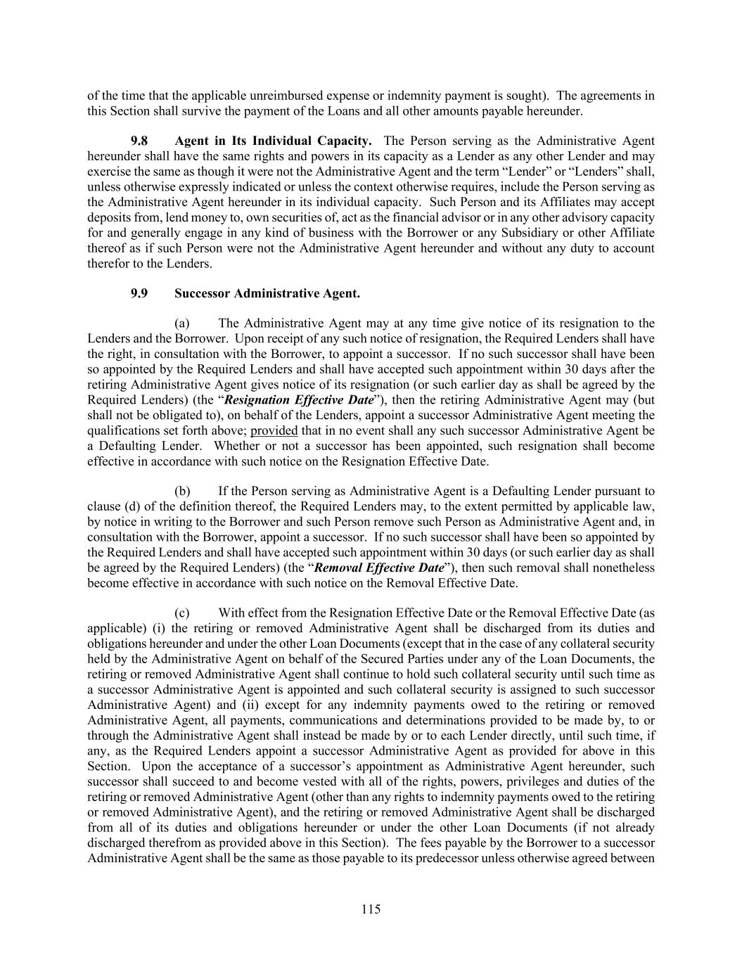 115 of the time that the applicable unreimbursed expense or indemnity payment is sought). The agreements in this Section shall survive the payment of the Loans and all other amounts payable hereunder. Agent in Its Individual Capacity. The Person serving as the Administrative Agent hereunder shall have the same rights and powers in its capacity as a Lender as any other Lender and may exercise the same as though it were not the Administrative Agent and the term “Lender” or “Lenders” shall, unless otherwise expressly indicated or unless the context otherwise requires, include the Person serving as the Administrative Agent hereunder in its individual capacity. Such Person and its Affiliates may accept deposits from, lend money to, own securities of, act as the financial advisor or in any other advisory capacity for and generally engage in any kind of business with the Borrower or any Subsidiary or other Affiliate thereof as if such Person were not the Administrative Agent hereunder and without any duty to account therefor to the Lenders. Successor Administrative Agent. (a) The Administrative Agent may at any time give notice of its resignation to the Lenders and the Borrower. Upon receipt of any such notice of resignation, the Required Lenders shall have the right, in consultation with the Borrower, to appoint a successor. If no such successor shall have been so appointed by the Required Lenders and shall have accepted such appointment within 30 days after the retiring Administrative Agent gives notice of its resignation (or such earlier day as shall be agreed by the Required Lenders) (the “Resignation Effective Date”), then the retiring Administrative Agent may (but shall not be obligated to), on behalf of the Lenders, appoint a successor Administrative Agent meeting the qualifications set forth above; provided that in no event shall any such successor Administrative Agent be a Defaulting Lender. Whether or not a successor has been appointed, such resignation shall become effective in accordance with such notice on the Resignation Effective Date. (b) If the Person serving as Administrative Agent is a Defaulting Lender pursuant to clause (d) of the definition thereof, the Required Lenders may, to the extent permitted by applicable law, by notice in writing to the Borrower and such Person remove such Person as Administrative Agent and, in consultation with the Borrower, appoint a successor. If no such successor shall have been so appointed by the Required Lenders and shall have accepted such appointment within 30 days (or such earlier day as shall be agreed by the Required Lenders) (the “Removal Effective Date”), then such removal shall nonetheless become effective in accordance with such notice on the Removal Effective Date. (c) With effect from the Resignation Effective Date or the Removal Effective Date (as applicable) (i) the retiring or removed Administrative Agent shall be discharged from its duties and obligations hereunder and under the other Loan Documents (except that in the case of any collateral security held by the Administrative Agent on behalf of the Secured Parties under any of the Loan Documents, the retiring or removed Administrative Agent shall continue to hold such collateral security until such time as a successor Administrative Agent is appointed and such collateral security is assigned to such successor Administrative Agent) and (ii) except for any indemnity payments owed to the retiring or removed Administrative Agent, all payments, communications and determinations provided to be made by, to or through the Administrative Agent shall instead be made by or to each Lender directly, until such time, if any, as the Required Lenders appoint a successor Administrative Agent as provided for above in this Section. Upon the acceptance of a successor’s appointment as Administrative Agent hereunder, such successor shall succeed to and become vested with all of the rights, powers, privileges and duties of the retiring or removed Administrative Agent (other than any rights to indemnity payments owed to the retiring or removed Administrative Agent), and the retiring or removed Administrative Agent shall be discharged from all of its duties and obligations hereunder or under the other Loan Documents (if not already discharged therefrom as provided above in this Section). The fees payable by the Borrower to a successor Administrative Agent shall be the same as those payable to its predecessor unless otherwise agreed between