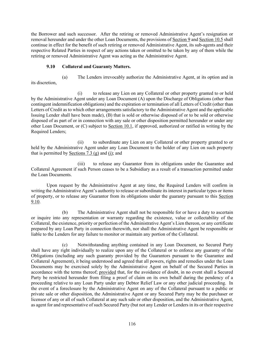 116 the Borrower and such successor. After the retiring or removed Administrative Agent’s resignation or removal hereunder and under the other Loan Documents, the provisions of Section 9 and Section 10.5 shall continue in effect for the benefit of such retiring or removed Administrative Agent, its sub-agents and their respective Related Parties in respect of any actions taken or omitted to be taken by any of them while the retiring or removed Administrative Agent was acting as the Administrative Agent. Collateral and Guaranty Matters. (a) The Lenders irrevocably authorize the Administrative Agent, at its option and in its discretion, (i) to release any Lien on any Collateral or other property granted to or held by the Administrative Agent under any Loan Document (A) upon the Discharge of Obligations (other than contingent indemnification obligations) and the expiration or termination of all Letters of Credit (other than Letters of Credit as to which other arrangements satisfactory to the Administrative Agent and the applicable Issuing Lender shall have been made), (B) that is sold or otherwise disposed of or to be sold or otherwise disposed of as part of or in connection with any sale or other disposition permitted hereunder or under any other Loan Document, or (C) subject to Section 10.1, if approved, authorized or ratified in writing by the Required Lenders; (ii) to subordinate any Lien on any Collateral or other property granted to or held by the Administrative Agent under any Loan Document to the holder of any Lien on such property that is permitted by Sections 7.3 (g) and (i); and (iii) to release any Guarantor from its obligations under the Guarantee and Collateral Agreement if such Person ceases to be a Subsidiary as a result of a transaction permitted under the Loan Documents. Upon request by the Administrative Agent at any time, the Required Lenders will confirm in writing the Administrative Agent’s authority to release or subordinate its interest in particular types or items of property, or to release any Guarantor from its obligations under the guaranty pursuant to this Section 9.10. (b) The Administrative Agent shall not be responsible for or have a duty to ascertain or inquire into any representation or warranty regarding the existence, value or collectability of the Collateral, the existence, priority or perfection of the Administrative Agent’s Lien thereon, or any certificate prepared by any Loan Party in connection therewith, nor shall the Administrative Agent be responsible or liable to the Lenders for any failure to monitor or maintain any portion of the Collateral. (c) Notwithstanding anything contained in any Loan Document, no Secured Party shall have any right individually to realize upon any of the Collateral or to enforce any guaranty of the Obligations (including any such guaranty provided by the Guarantors pursuant to the Guarantee and Collateral Agreement), it being understood and agreed that all powers, rights and remedies under the Loan Documents may be exercised solely by the Administrative Agent on behalf of the Secured Parties in accordance with the terms thereof; provided that, for the avoidance of doubt, in no event shall a Secured Party be restricted hereunder from filing a proof of claim on its own behalf during the pendency of a proceeding relative to any Loan Party under any Debtor Relief Law or any other judicial proceeding. In the event of a foreclosure by the Administrative Agent on any of the Collateral pursuant to a public or private sale or other disposition, the Administrative Agent or any Secured Party may be the purchaser or licensor of any or all of such Collateral at any such sale or other disposition, and the Administrative Agent, as agent for and representative of such Secured Party (but not any Lender or Lenders in its or their respective