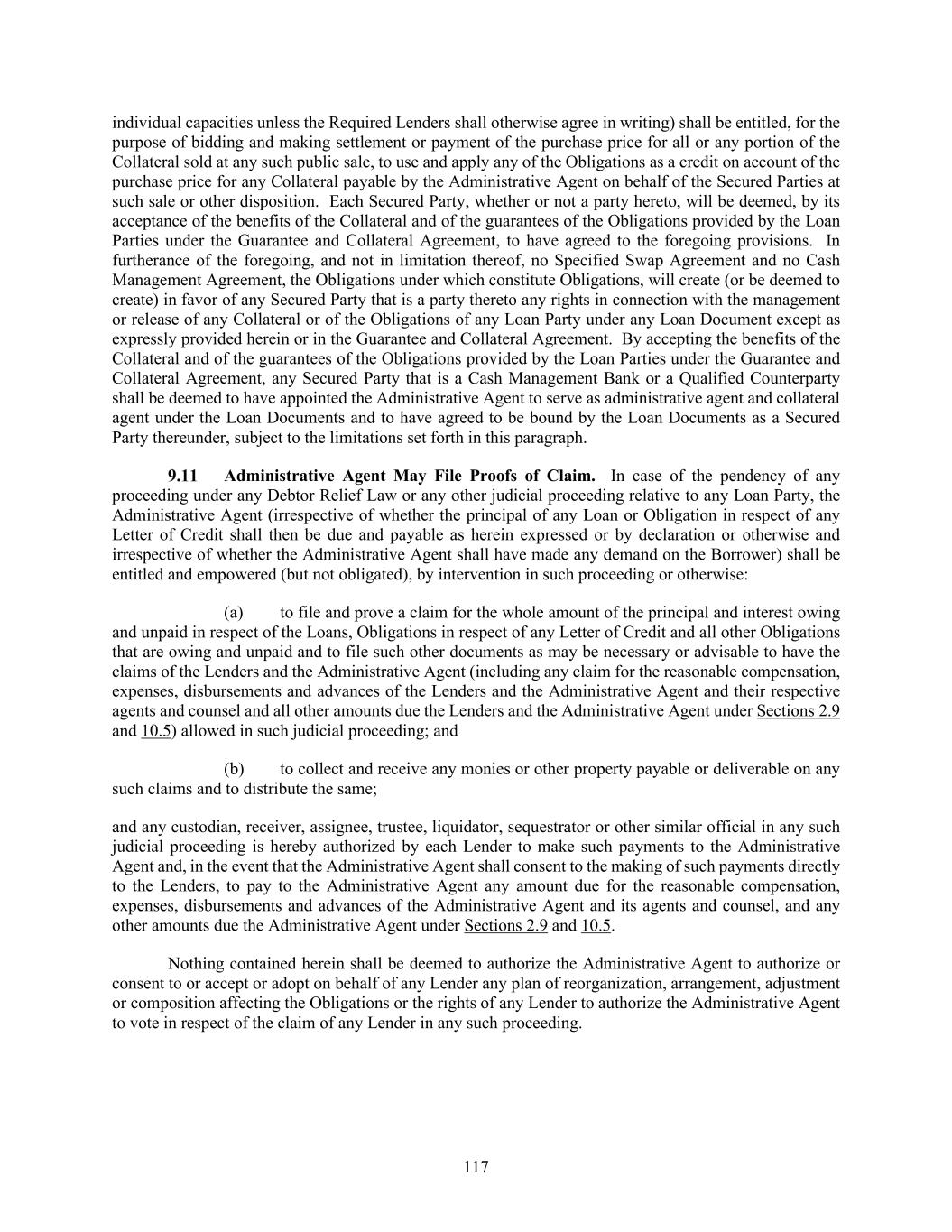 117 individual capacities unless the Required Lenders shall otherwise agree in writing) shall be entitled, for the purpose of bidding and making settlement or payment of the purchase price for all or any portion of the Collateral sold at any such public sale, to use and apply any of the Obligations as a credit on account of the purchase price for any Collateral payable by the Administrative Agent on behalf of the Secured Parties at such sale or other disposition. Each Secured Party, whether or not a party hereto, will be deemed, by its acceptance of the benefits of the Collateral and of the guarantees of the Obligations provided by the Loan Parties under the Guarantee and Collateral Agreement, to have agreed to the foregoing provisions. In furtherance of the foregoing, and not in limitation thereof, no Specified Swap Agreement and no Cash Management Agreement, the Obligations under which constitute Obligations, will create (or be deemed to create) in favor of any Secured Party that is a party thereto any rights in connection with the management or release of any Collateral or of the Obligations of any Loan Party under any Loan Document except as expressly provided herein or in the Guarantee and Collateral Agreement. By accepting the benefits of the Collateral and of the guarantees of the Obligations provided by the Loan Parties under the Guarantee and Collateral Agreement, any Secured Party that is a Cash Management Bank or a Qualified Counterparty shall be deemed to have appointed the Administrative Agent to serve as administrative agent and collateral agent under the Loan Documents and to have agreed to be bound by the Loan Documents as a Secured Party thereunder, subject to the limitations set forth in this paragraph. Administrative Agent May File Proofs of Claim. In case of the pendency of any proceeding under any Debtor Relief Law or any other judicial proceeding relative to any Loan Party, the Administrative Agent (irrespective of whether the principal of any Loan or Obligation in respect of any Letter of Credit shall then be due and payable as herein expressed or by declaration or otherwise and irrespective of whether the Administrative Agent shall have made any demand on the Borrower) shall be entitled and empowered (but not obligated), by intervention in such proceeding or otherwise: (a) to file and prove a claim for the whole amount of the principal and interest owing and unpaid in respect of the Loans, Obligations in respect of any Letter of Credit and all other Obligations that are owing and unpaid and to file such other documents as may be necessary or advisable to have the claims of the Lenders and the Administrative Agent (including any claim for the reasonable compensation, expenses, disbursements and advances of the Lenders and the Administrative Agent and their respective agents and counsel and all other amounts due the Lenders and the Administrative Agent under Sections 2.9 and 10.5) allowed in such judicial proceeding; and (b) to collect and receive any monies or other property payable or deliverable on any such claims and to distribute the same; and any custodian, receiver, assignee, trustee, liquidator, sequestrator or other similar official in any such judicial proceeding is hereby authorized by each Lender to make such payments to the Administrative Agent and, in the event that the Administrative Agent shall consent to the making of such payments directly to the Lenders, to pay to the Administrative Agent any amount due for the reasonable compensation, expenses, disbursements and advances of the Administrative Agent and its agents and counsel, and any other amounts due the Administrative Agent under Sections 2.9 and 10.5. Nothing contained herein shall be deemed to authorize the Administrative Agent to authorize or consent to or accept or adopt on behalf of any Lender any plan of reorganization, arrangement, adjustment or composition affecting the Obligations or the rights of any Lender to authorize the Administrative Agent to vote in respect of the claim of any Lender in any such proceeding.
