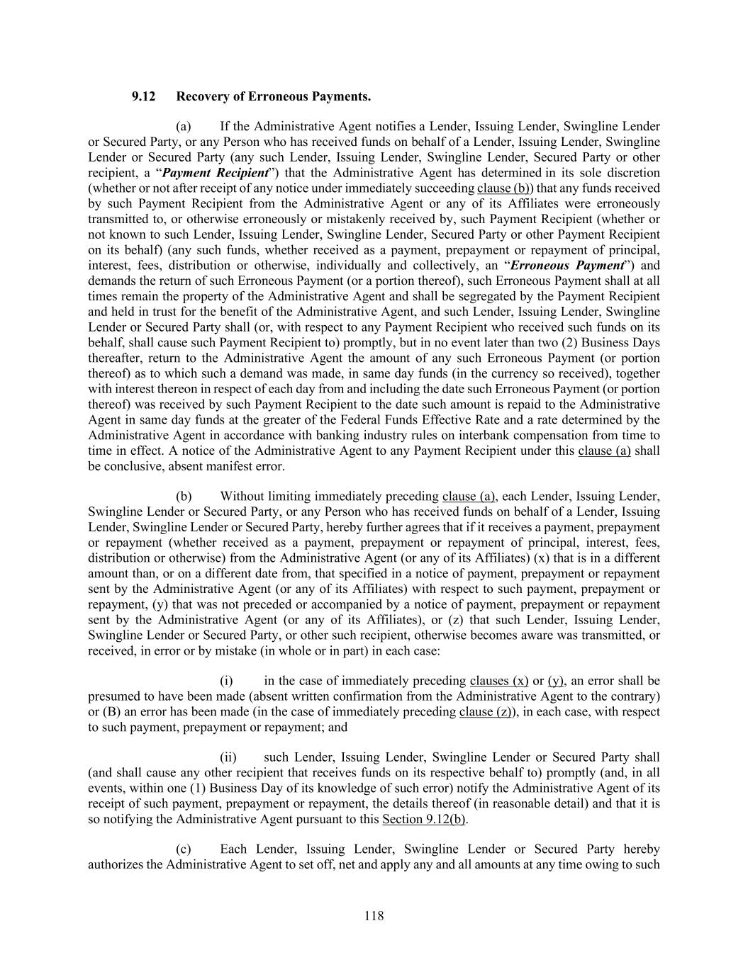 118 Recovery of Erroneous Payments. (a) If the Administrative Agent notifies a Lender, Issuing Lender, Swingline Lender or Secured Party, or any Person who has received funds on behalf of a Lender, Issuing Lender, Swingline Lender or Secured Party (any such Lender, Issuing Lender, Swingline Lender, Secured Party or other recipient, a “Payment Recipient”) that the Administrative Agent has determined in its sole discretion (whether or not after receipt of any notice under immediately succeeding clause (b)) that any funds received by such Payment Recipient from the Administrative Agent or any of its Affiliates were erroneously transmitted to, or otherwise erroneously or mistakenly received by, such Payment Recipient (whether or not known to such Lender, Issuing Lender, Swingline Lender, Secured Party or other Payment Recipient on its behalf) (any such funds, whether received as a payment, prepayment or repayment of principal, interest, fees, distribution or otherwise, individually and collectively, an “Erroneous Payment”) and demands the return of such Erroneous Payment (or a portion thereof), such Erroneous Payment shall at all times remain the property of the Administrative Agent and shall be segregated by the Payment Recipient and held in trust for the benefit of the Administrative Agent, and such Lender, Issuing Lender, Swingline Lender or Secured Party shall (or, with respect to any Payment Recipient who received such funds on its behalf, shall cause such Payment Recipient to) promptly, but in no event later than two (2) Business Days thereafter, return to the Administrative Agent the amount of any such Erroneous Payment (or portion thereof) as to which such a demand was made, in same day funds (in the currency so received), together with interest thereon in respect of each day from and including the date such Erroneous Payment (or portion thereof) was received by such Payment Recipient to the date such amount is repaid to the Administrative Agent in same day funds at the greater of the Federal Funds Effective Rate and a rate determined by the Administrative Agent in accordance with banking industry rules on interbank compensation from time to time in effect. A notice of the Administrative Agent to any Payment Recipient under this clause (a) shall be conclusive, absent manifest error. (b) Without limiting immediately preceding clause (a), each Lender, Issuing Lender, Swingline Lender or Secured Party, or any Person who has received funds on behalf of a Lender, Issuing Lender, Swingline Lender or Secured Party, hereby further agrees that if it receives a payment, prepayment or repayment (whether received as a payment, prepayment or repayment of principal, interest, fees, distribution or otherwise) from the Administrative Agent (or any of its Affiliates) (x) that is in a different amount than, or on a different date from, that specified in a notice of payment, prepayment or repayment sent by the Administrative Agent (or any of its Affiliates) with respect to such payment, prepayment or repayment, (y) that was not preceded or accompanied by a notice of payment, prepayment or repayment sent by the Administrative Agent (or any of its Affiliates), or (z) that such Lender, Issuing Lender, Swingline Lender or Secured Party, or other such recipient, otherwise becomes aware was transmitted, or received, in error or by mistake (in whole or in part) in each case: (i) in the case of immediately preceding clauses (x) or (y), an error shall be presumed to have been made (absent written confirmation from the Administrative Agent to the contrary) or (B) an error has been made (in the case of immediately preceding clause (z)), in each case, with respect to such payment, prepayment or repayment; and (ii) such Lender, Issuing Lender, Swingline Lender or Secured Party shall (and shall cause any other recipient that receives funds on its respective behalf to) promptly (and, in all events, within one (1) Business Day of its knowledge of such error) notify the Administrative Agent of its receipt of such payment, prepayment or repayment, the details thereof (in reasonable detail) and that it is so notifying the Administrative Agent pursuant to this Section 9.12(b). (c) Each Lender, Issuing Lender, Swingline Lender or Secured Party hereby authorizes the Administrative Agent to set off, net and apply any and all amounts at any time owing to such