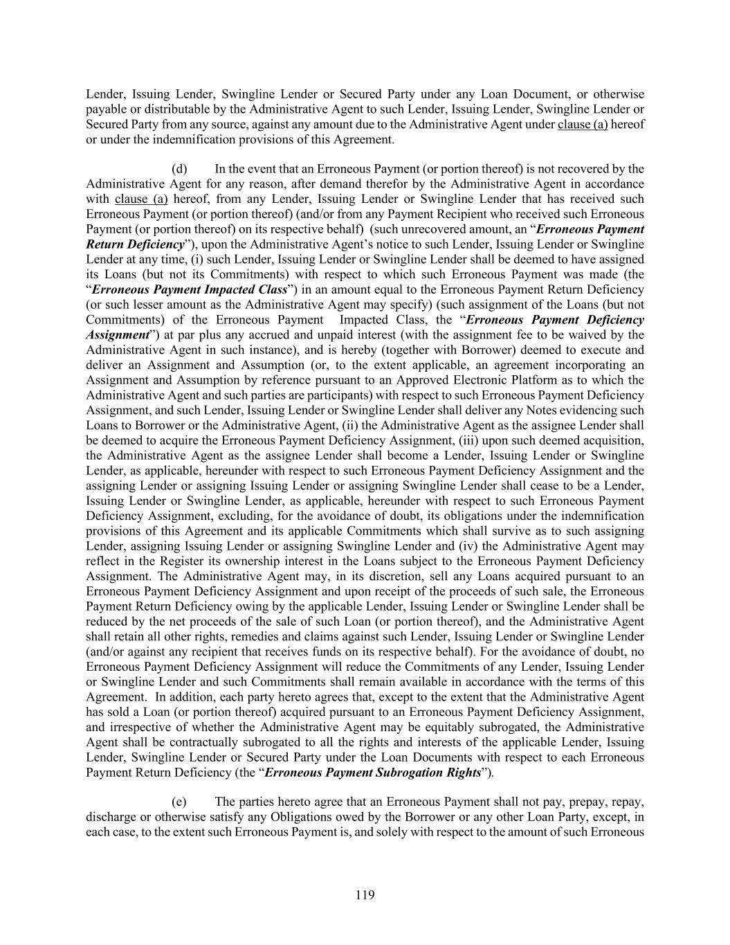119 Lender, Issuing Lender, Swingline Lender or Secured Party under any Loan Document, or otherwise payable or distributable by the Administrative Agent to such Lender, Issuing Lender, Swingline Lender or Secured Party from any source, against any amount due to the Administrative Agent under clause (a) hereof or under the indemnification provisions of this Agreement. (d) In the event that an Erroneous Payment (or portion thereof) is not recovered by the Administrative Agent for any reason, after demand therefor by the Administrative Agent in accordance with clause (a) hereof, from any Lender, Issuing Lender or Swingline Lender that has received such Erroneous Payment (or portion thereof) (and/or from any Payment Recipient who received such Erroneous Payment (or portion thereof) on its respective behalf) (such unrecovered amount, an “Erroneous Payment Return Deficiency”), upon the Administrative Agent’s notice to such Lender, Issuing Lender or Swingline Lender at any time, (i) such Lender, Issuing Lender or Swingline Lender shall be deemed to have assigned its Loans (but not its Commitments) with respect to which such Erroneous Payment was made (the “Erroneous Payment Impacted Class”) in an amount equal to the Erroneous Payment Return Deficiency (or such lesser amount as the Administrative Agent may specify) (such assignment of the Loans (but not Commitments) of the Erroneous Payment Impacted Class, the “Erroneous Payment Deficiency Assignment”) at par plus any accrued and unpaid interest (with the assignment fee to be waived by the Administrative Agent in such instance), and is hereby (together with Borrower) deemed to execute and deliver an Assignment and Assumption (or, to the extent applicable, an agreement incorporating an Assignment and Assumption by reference pursuant to an Approved Electronic Platform as to which the Administrative Agent and such parties are participants) with respect to such Erroneous Payment Deficiency Assignment, and such Lender, Issuing Lender or Swingline Lender shall deliver any Notes evidencing such Loans to Borrower or the Administrative Agent, (ii) the Administrative Agent as the assignee Lender shall be deemed to acquire the Erroneous Payment Deficiency Assignment, (iii) upon such deemed acquisition, the Administrative Agent as the assignee Lender shall become a Lender, Issuing Lender or Swingline Lender, as applicable, hereunder with respect to such Erroneous Payment Deficiency Assignment and the assigning Lender or assigning Issuing Lender or assigning Swingline Lender shall cease to be a Lender, Issuing Lender or Swingline Lender, as applicable, hereunder with respect to such Erroneous Payment Deficiency Assignment, excluding, for the avoidance of doubt, its obligations under the indemnification provisions of this Agreement and its applicable Commitments which shall survive as to such assigning Lender, assigning Issuing Lender or assigning Swingline Lender and (iv) the Administrative Agent may reflect in the Register its ownership interest in the Loans subject to the Erroneous Payment Deficiency Assignment. The Administrative Agent may, in its discretion, sell any Loans acquired pursuant to an Erroneous Payment Deficiency Assignment and upon receipt of the proceeds of such sale, the Erroneous Payment Return Deficiency owing by the applicable Lender, Issuing Lender or Swingline Lender shall be reduced by the net proceeds of the sale of such Loan (or portion thereof), and the Administrative Agent shall retain all other rights, remedies and claims against such Lender, Issuing Lender or Swingline Lender (and/or against any recipient that receives funds on its respective behalf). For the avoidance of doubt, no Erroneous Payment Deficiency Assignment will reduce the Commitments of any Lender, Issuing Lender or Swingline Lender and such Commitments shall remain available in accordance with the terms of this Agreement. In addition, each party hereto agrees that, except to the extent that the Administrative Agent has sold a Loan (or portion thereof) acquired pursuant to an Erroneous Payment Deficiency Assignment, and irrespective of whether the Administrative Agent may be equitably subrogated, the Administrative Agent shall be contractually subrogated to all the rights and interests of the applicable Lender, Issuing Lender, Swingline Lender or Secured Party under the Loan Documents with respect to each Erroneous Payment Return Deficiency (the “Erroneous Payment Subrogation Rights”). (e) The parties hereto agree that an Erroneous Payment shall not pay, prepay, repay, discharge or otherwise satisfy any Obligations owed by the Borrower or any other Loan Party, except, in each case, to the extent such Erroneous Payment is, and solely with respect to the amount of such Erroneous