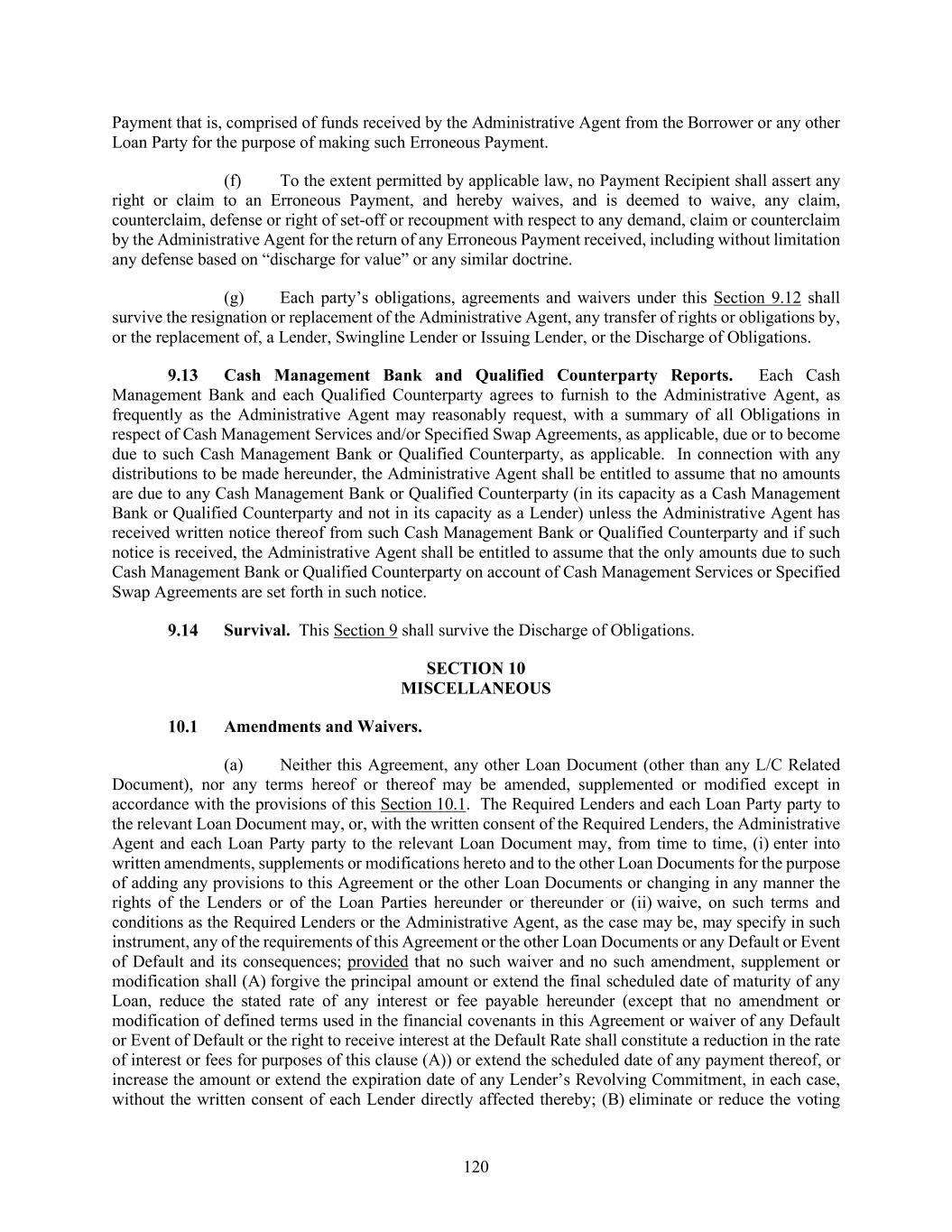 120 Payment that is, comprised of funds received by the Administrative Agent from the Borrower or any other Loan Party for the purpose of making such Erroneous Payment. (f) To the extent permitted by applicable law, no Payment Recipient shall assert any right or claim to an Erroneous Payment, and hereby waives, and is deemed to waive, any claim, counterclaim, defense or right of set-off or recoupment with respect to any demand, claim or counterclaim by the Administrative Agent for the return of any Erroneous Payment received, including without limitation any defense based on “discharge for value” or any similar doctrine. (g) Each party’s obligations, agreements and waivers under this Section 9.12 shall survive the resignation or replacement of the Administrative Agent, any transfer of rights or obligations by, or the replacement of, a Lender, Swingline Lender or Issuing Lender, or the Discharge of Obligations. Cash Management Bank and Qualified Counterparty Reports. Each Cash Management Bank and each Qualified Counterparty agrees to furnish to the Administrative Agent, as frequently as the Administrative Agent may reasonably request, with a summary of all Obligations in respect of Cash Management Services and/or Specified Swap Agreements, as applicable, due or to become due to such Cash Management Bank or Qualified Counterparty, as applicable. In connection with any distributions to be made hereunder, the Administrative Agent shall be entitled to assume that no amounts are due to any Cash Management Bank or Qualified Counterparty (in its capacity as a Cash Management Bank or Qualified Counterparty and not in its capacity as a Lender) unless the Administrative Agent has received written notice thereof from such Cash Management Bank or Qualified Counterparty and if such notice is received, the Administrative Agent shall be entitled to assume that the only amounts due to such Cash Management Bank or Qualified Counterparty on account of Cash Management Services or Specified Swap Agreements are set forth in such notice. Survival. This Section 9 shall survive the Discharge of Obligations. MISCELLANEOUS Amendments and Waivers. (a) Neither this Agreement, any other Loan Document (other than any L/C Related Document), nor any terms hereof or thereof may be amended, supplemented or modified except in accordance with the provisions of this Section 10.1. The Required Lenders and each Loan Party party to the relevant Loan Document may, or, with the written consent of the Required Lenders, the Administrative Agent and each Loan Party party to the relevant Loan Document may, from time to time, (i) enter into written amendments, supplements or modifications hereto and to the other Loan Documents for the purpose of adding any provisions to this Agreement or the other Loan Documents or changing in any manner the rights of the Lenders or of the Loan Parties hereunder or thereunder or (ii) waive, on such terms and conditions as the Required Lenders or the Administrative Agent, as the case may be, may specify in such instrument, any of the requirements of this Agreement or the other Loan Documents or any Default or Event of Default and its consequences; provided that no such waiver and no such amendment, supplement or modification shall (A) forgive the principal amount or extend the final scheduled date of maturity of any Loan, reduce the stated rate of any interest or fee payable hereunder (except that no amendment or modification of defined terms used in the financial covenants in this Agreement or waiver of any Default or Event of Default or the right to receive interest at the Default Rate shall constitute a reduction in the rate of interest or fees for purposes of this clause (A)) or extend the scheduled date of any payment thereof, or increase the amount or extend the expiration date of any Lender’s Revolving Commitment, in each case, without the written consent of each Lender directly affected thereby; (B) eliminate or reduce the voting