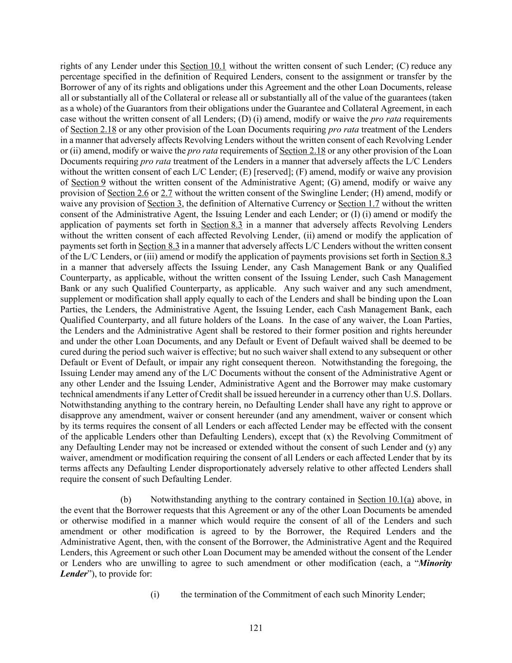 121 rights of any Lender under this Section 10.1 without the written consent of such Lender; (C) reduce any percentage specified in the definition of Required Lenders, consent to the assignment or transfer by the Borrower of any of its rights and obligations under this Agreement and the other Loan Documents, release all or substantially all of the Collateral or release all or substantially all of the value of the guarantees (taken as a whole) of the Guarantors from their obligations under the Guarantee and Collateral Agreement, in each case without the written consent of all Lenders; (D) (i) amend, modify or waive the pro rata requirements of Section 2.18 or any other provision of the Loan Documents requiring pro rata treatment of the Lenders in a manner that adversely affects Revolving Lenders without the written consent of each Revolving Lender or (ii) amend, modify or waive the pro rata requirements of Section 2.18 or any other provision of the Loan Documents requiring pro rata treatment of the Lenders in a manner that adversely affects the L/C Lenders without the written consent of each L/C Lender; (E) [reserved]; (F) amend, modify or waive any provision of Section 9 without the written consent of the Administrative Agent; (G) amend, modify or waive any provision of Section 2.6 or 2.7 without the written consent of the Swingline Lender; (H) amend, modify or waive any provision of Section 3, the definition of Alternative Currency or Section 1.7 without the written consent of the Administrative Agent, the Issuing Lender and each Lender; or (I) (i) amend or modify the application of payments set forth in Section 8.3 in a manner that adversely affects Revolving Lenders without the written consent of each affected Revolving Lender, (ii) amend or modify the application of payments set forth in Section 8.3 in a manner that adversely affects L/C Lenders without the written consent of the L/C Lenders, or (iii) amend or modify the application of payments provisions set forth in Section 8.3 in a manner that adversely affects the Issuing Lender, any Cash Management Bank or any Qualified Counterparty, as applicable, without the written consent of the Issuing Lender, such Cash Management Bank or any such Qualified Counterparty, as applicable. Any such waiver and any such amendment, supplement or modification shall apply equally to each of the Lenders and shall be binding upon the Loan Parties, the Lenders, the Administrative Agent, the Issuing Lender, each Cash Management Bank, each Qualified Counterparty, and all future holders of the Loans. In the case of any waiver, the Loan Parties, the Lenders and the Administrative Agent shall be restored to their former position and rights hereunder and under the other Loan Documents, and any Default or Event of Default waived shall be deemed to be cured during the period such waiver is effective; but no such waiver shall extend to any subsequent or other Default or Event of Default, or impair any right consequent thereon. Notwithstanding the foregoing, the Issuing Lender may amend any of the L/C Documents without the consent of the Administrative Agent or any other Lender and the Issuing Lender, Administrative Agent and the Borrower may make customary technical amendments if any Letter of Credit shall be issued hereunder in a currency other than U.S. Dollars. Notwithstanding anything to the contrary herein, no Defaulting Lender shall have any right to approve or disapprove any amendment, waiver or consent hereunder (and any amendment, waiver or consent which by its terms requires the consent of all Lenders or each affected Lender may be effected with the consent of the applicable Lenders other than Defaulting Lenders), except that (x) the Revolving Commitment of any Defaulting Lender may not be increased or extended without the consent of such Lender and (y) any waiver, amendment or modification requiring the consent of all Lenders or each affected Lender that by its terms affects any Defaulting Lender disproportionately adversely relative to other affected Lenders shall require the consent of such Defaulting Lender. (b) Notwithstanding anything to the contrary contained in Section 10.1(a) above, in the event that the Borrower requests that this Agreement or any of the other Loan Documents be amended or otherwise modified in a manner which would require the consent of all of the Lenders and such amendment or other modification is agreed to by the Borrower, the Required Lenders and the Administrative Agent, then, with the consent of the Borrower, the Administrative Agent and the Required Lenders, this Agreement or such other Loan Document may be amended without the consent of the Lender or Lenders who are unwilling to agree to such amendment or other modification (each, a “Minority Lender”), to provide for: (i) the termination of the Commitment of each such Minority Lender;