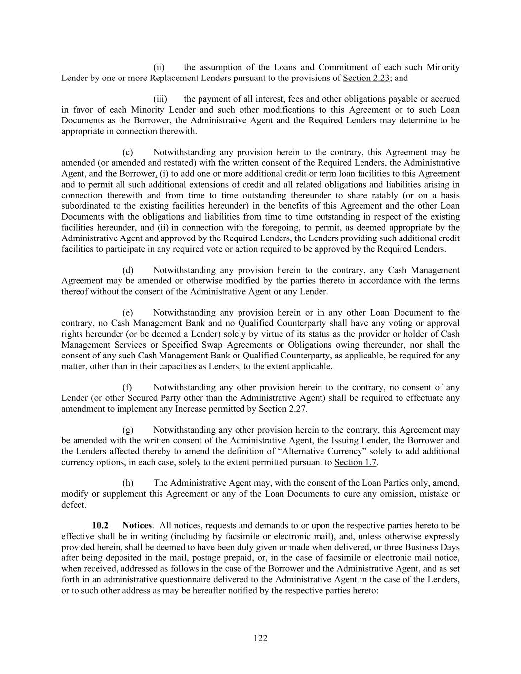122 (ii) the assumption of the Loans and Commitment of each such Minority Lender by one or more Replacement Lenders pursuant to the provisions of Section 2.23; and (iii) the payment of all interest, fees and other obligations payable or accrued in favor of each Minority Lender and such other modifications to this Agreement or to such Loan Documents as the Borrower, the Administrative Agent and the Required Lenders may determine to be appropriate in connection therewith. (c) Notwithstanding any provision herein to the contrary, this Agreement may be amended (or amended and restated) with the written consent of the Required Lenders, the Administrative Agent, and the Borrower, (i) to add one or more additional credit or term loan facilities to this Agreement and to permit all such additional extensions of credit and all related obligations and liabilities arising in connection therewith and from time to time outstanding thereunder to share ratably (or on a basis subordinated to the existing facilities hereunder) in the benefits of this Agreement and the other Loan Documents with the obligations and liabilities from time to time outstanding in respect of the existing facilities hereunder, and (ii) in connection with the foregoing, to permit, as deemed appropriate by the Administrative Agent and approved by the Required Lenders, the Lenders providing such additional credit facilities to participate in any required vote or action required to be approved by the Required Lenders. (d) Notwithstanding any provision herein to the contrary, any Cash Management Agreement may be amended or otherwise modified by the parties thereto in accordance with the terms thereof without the consent of the Administrative Agent or any Lender. (e) Notwithstanding any provision herein or in any other Loan Document to the contrary, no Cash Management Bank and no Qualified Counterparty shall have any voting or approval rights hereunder (or be deemed a Lender) solely by virtue of its status as the provider or holder of Cash Management Services or Specified Swap Agreements or Obligations owing thereunder, nor shall the consent of any such Cash Management Bank or Qualified Counterparty, as applicable, be required for any matter, other than in their capacities as Lenders, to the extent applicable. (f) Notwithstanding any other provision herein to the contrary, no consent of any Lender (or other Secured Party other than the Administrative Agent) shall be required to effectuate any amendment to implement any Increase permitted by Section 2.27. (g) Notwithstanding any other provision herein to the contrary, this Agreement may be amended with the written consent of the Administrative Agent, the Issuing Lender, the Borrower and the Lenders affected thereby to amend the definition of “Alternative Currency” solely to add additional currency options, in each case, solely to the extent permitted pursuant to Section 1.7. (h) The Administrative Agent may, with the consent of the Loan Parties only, amend, modify or supplement this Agreement or any of the Loan Documents to cure any omission, mistake or defect. Notices. All notices, requests and demands to or upon the respective parties hereto to be effective shall be in writing (including by facsimile or electronic mail), and, unless otherwise expressly provided herein, shall be deemed to have been duly given or made when delivered, or three Business Days after being deposited in the mail, postage prepaid, or, in the case of facsimile or electronic mail notice, when received, addressed as follows in the case of the Borrower and the Administrative Agent, and as set forth in an administrative questionnaire delivered to the Administrative Agent in the case of the Lenders, or to such other address as may be hereafter notified by the respective parties hereto: