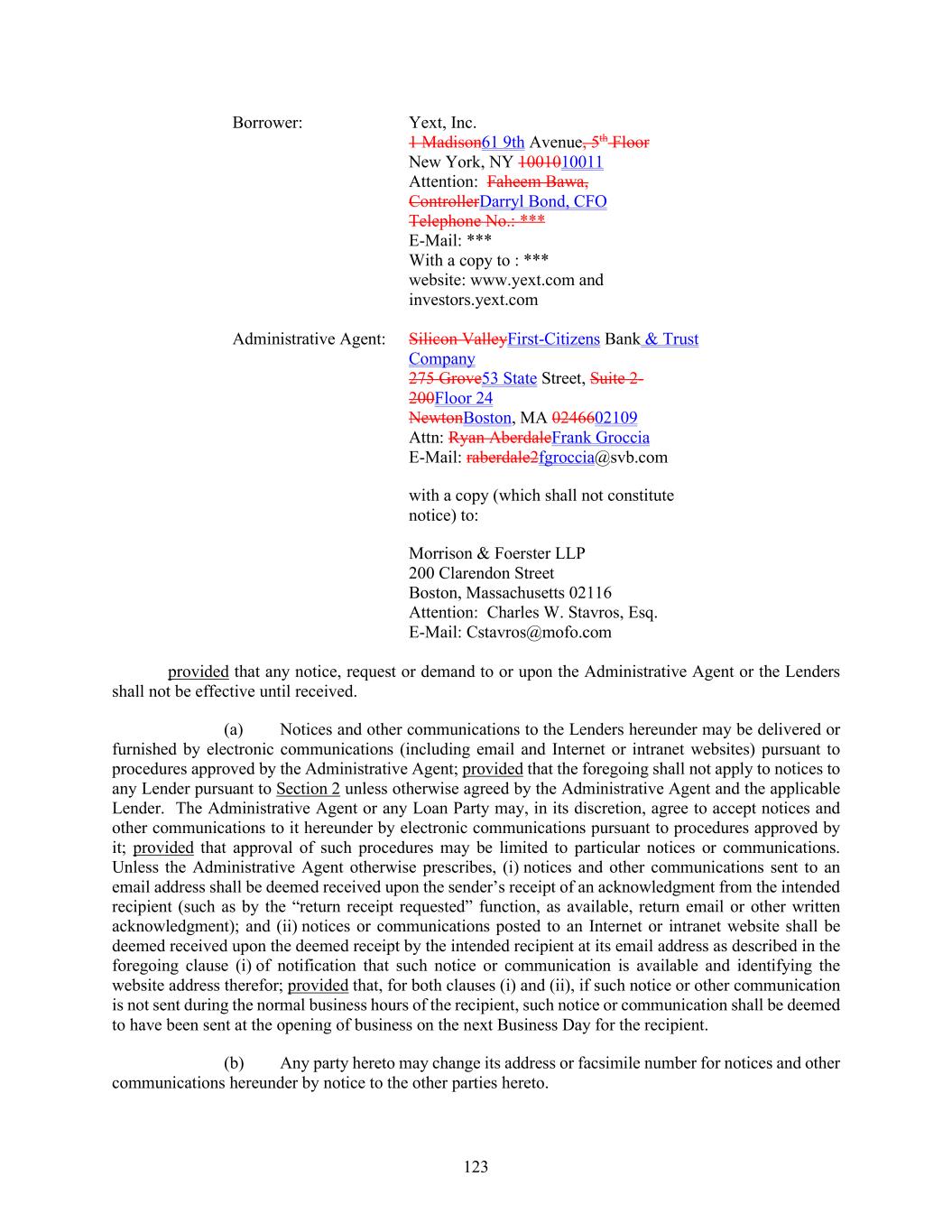 123 Borrower: Yext, Inc. 1 Madison61 9th Avenue, 5th Floor New York, NY 1001010011 Attention: Faheem Bawa, ControllerDarryl Bond, CFO Telephone No.: *** E-Mail: *** With a copy to : *** website: www.yext.com and investors.yext.com Administrative Agent: Silicon ValleyFirst-Citizens Bank & Trust Company 275 Grove53 State Street, Suite 2- 200Floor 24 NewtonBoston, MA 0246602109 Attn: Ryan AberdaleFrank Groccia E-Mail: raberdale2fgroccia@svb.com with a copy (which shall not constitute notice) to: Morrison & Foerster LLP 200 Clarendon Street Boston, Massachusetts 02116 Attention: Charles W. Stavros, Esq. E-Mail: Cstavros@mofo.com provided that any notice, request or demand to or upon the Administrative Agent or the Lenders shall not be effective until received. (a) Notices and other communications to the Lenders hereunder may be delivered or furnished by electronic communications (including email and Internet or intranet websites) pursuant to procedures approved by the Administrative Agent; provided that the foregoing shall not apply to notices to any Lender pursuant to Section 2 unless otherwise agreed by the Administrative Agent and the applicable Lender. The Administrative Agent or any Loan Party may, in its discretion, agree to accept notices and other communications to it hereunder by electronic communications pursuant to procedures approved by it; provided that approval of such procedures may be limited to particular notices or communications. Unless the Administrative Agent otherwise prescribes, (i) notices and other communications sent to an email address shall be deemed received upon the sender’s receipt of an acknowledgment from the intended recipient (such as by the “return receipt requested” function, as available, return email or other written acknowledgment); and (ii) notices or communications posted to an Internet or intranet website shall be deemed received upon the deemed receipt by the intended recipient at its email address as described in the foregoing clause (i) of notification that such notice or communication is available and identifying the website address therefor; provided that, for both clauses (i) and (ii), if such notice or other communication is not sent during the normal business hours of the recipient, such notice or communication shall be deemed to have been sent at the opening of business on the next Business Day for the recipient. (b) Any party hereto may change its address or facsimile number for notices and other communications hereunder by notice to the other parties hereto.