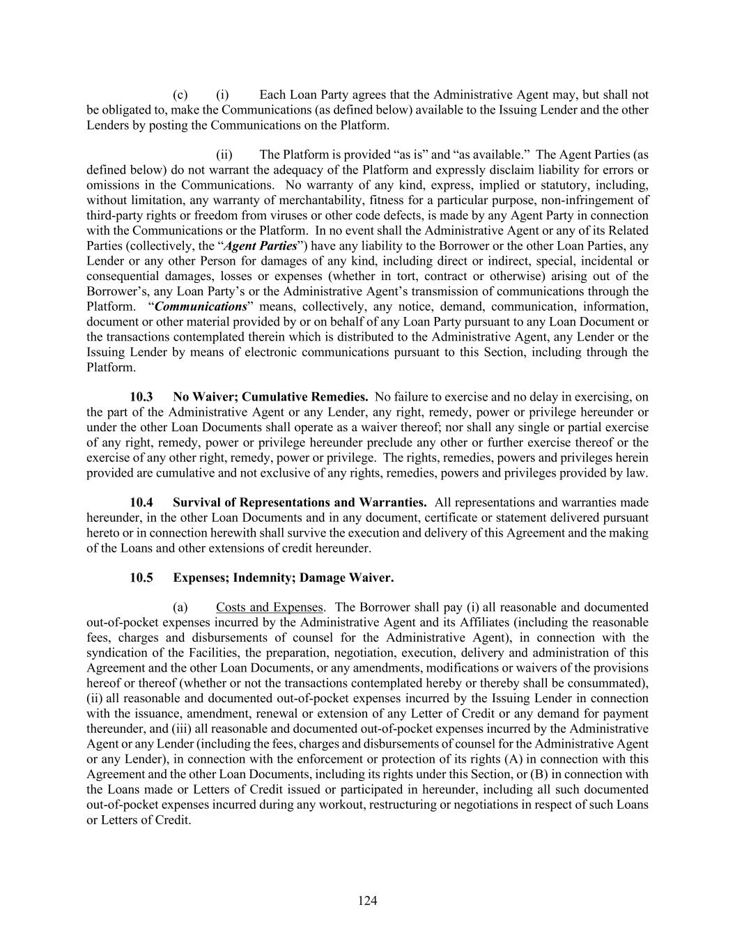 124 (c) (i) Each Loan Party agrees that the Administrative Agent may, but shall not be obligated to, make the Communications (as defined below) available to the Issuing Lender and the other Lenders by posting the Communications on the Platform. (ii) The Platform is provided “as is” and “as available.” The Agent Parties (as defined below) do not warrant the adequacy of the Platform and expressly disclaim liability for errors or omissions in the Communications. No warranty of any kind, express, implied or statutory, including, without limitation, any warranty of merchantability, fitness for a particular purpose, non-infringement of third-party rights or freedom from viruses or other code defects, is made by any Agent Party in connection with the Communications or the Platform. In no event shall the Administrative Agent or any of its Related Parties (collectively, the “Agent Parties”) have any liability to the Borrower or the other Loan Parties, any Lender or any other Person for damages of any kind, including direct or indirect, special, incidental or consequential damages, losses or expenses (whether in tort, contract or otherwise) arising out of the Borrower’s, any Loan Party’s or the Administrative Agent’s transmission of communications through the Platform. “Communications” means, collectively, any notice, demand, communication, information, document or other material provided by or on behalf of any Loan Party pursuant to any Loan Document or the transactions contemplated therein which is distributed to the Administrative Agent, any Lender or the Issuing Lender by means of electronic communications pursuant to this Section, including through the Platform. No Waiver; Cumulative Remedies. No failure to exercise and no delay in exercising, on the part of the Administrative Agent or any Lender, any right, remedy, power or privilege hereunder or under the other Loan Documents shall operate as a waiver thereof; nor shall any single or partial exercise of any right, remedy, power or privilege hereunder preclude any other or further exercise thereof or the exercise of any other right, remedy, power or privilege. The rights, remedies, powers and privileges herein provided are cumulative and not exclusive of any rights, remedies, powers and privileges provided by law. Survival of Representations and Warranties. All representations and warranties made hereunder, in the other Loan Documents and in any document, certificate or statement delivered pursuant hereto or in connection herewith shall survive the execution and delivery of this Agreement and the making of the Loans and other extensions of credit hereunder. Expenses; Indemnity; Damage Waiver. (a) Costs and Expenses. The Borrower shall pay (i) all reasonable and documented out-of-pocket expenses incurred by the Administrative Agent and its Affiliates (including the reasonable fees, charges and disbursements of counsel for the Administrative Agent), in connection with the syndication of the Facilities, the preparation, negotiation, execution, delivery and administration of this Agreement and the other Loan Documents, or any amendments, modifications or waivers of the provisions hereof or thereof (whether or not the transactions contemplated hereby or thereby shall be consummated), (ii) all reasonable and documented out-of-pocket expenses incurred by the Issuing Lender in connection with the issuance, amendment, renewal or extension of any Letter of Credit or any demand for payment thereunder, and (iii) all reasonable and documented out-of-pocket expenses incurred by the Administrative Agent or any Lender (including the fees, charges and disbursements of counsel for the Administrative Agent or any Lender), in connection with the enforcement or protection of its rights (A) in connection with this Agreement and the other Loan Documents, including its rights under this Section, or (B) in connection with the Loans made or Letters of Credit issued or participated in hereunder, including all such documented out-of-pocket expenses incurred during any workout, restructuring or negotiations in respect of such Loans or Letters of Credit.