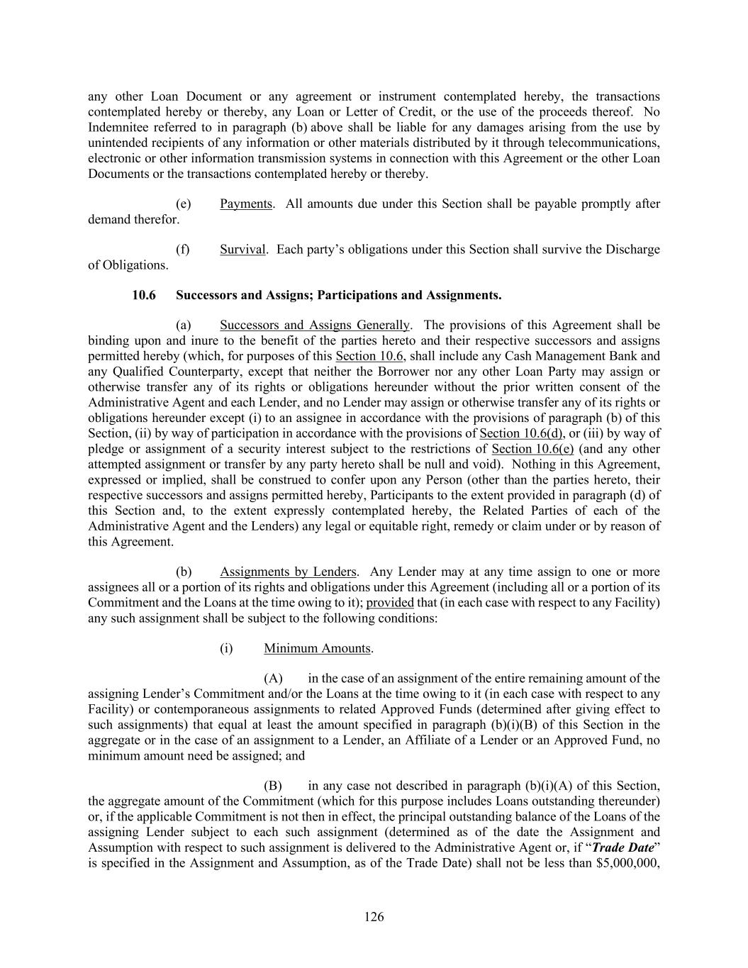 126 any other Loan Document or any agreement or instrument contemplated hereby, the transactions contemplated hereby or thereby, any Loan or Letter of Credit, or the use of the proceeds thereof. No Indemnitee referred to in paragraph (b) above shall be liable for any damages arising from the use by unintended recipients of any information or other materials distributed by it through telecommunications, electronic or other information transmission systems in connection with this Agreement or the other Loan Documents or the transactions contemplated hereby or thereby. (e) Payments. All amounts due under this Section shall be payable promptly after demand therefor. (f) Survival. Each party’s obligations under this Section shall survive the Discharge of Obligations. Successors and Assigns; Participations and Assignments. (a) Successors and Assigns Generally. The provisions of this Agreement shall be binding upon and inure to the benefit of the parties hereto and their respective successors and assigns permitted hereby (which, for purposes of this Section 10.6, shall include any Cash Management Bank and any Qualified Counterparty, except that neither the Borrower nor any other Loan Party may assign or otherwise transfer any of its rights or obligations hereunder without the prior written consent of the Administrative Agent and each Lender, and no Lender may assign or otherwise transfer any of its rights or obligations hereunder except (i) to an assignee in accordance with the provisions of paragraph (b) of this Section, (ii) by way of participation in accordance with the provisions of Section 10.6(d), or (iii) by way of pledge or assignment of a security interest subject to the restrictions of Section 10.6(e) (and any other attempted assignment or transfer by any party hereto shall be null and void). Nothing in this Agreement, expressed or implied, shall be construed to confer upon any Person (other than the parties hereto, their respective successors and assigns permitted hereby, Participants to the extent provided in paragraph (d) of this Section and, to the extent expressly contemplated hereby, the Related Parties of each of the Administrative Agent and the Lenders) any legal or equitable right, remedy or claim under or by reason of this Agreement. (b) Assignments by Lenders. Any Lender may at any time assign to one or more assignees all or a portion of its rights and obligations under this Agreement (including all or a portion of its Commitment and the Loans at the time owing to it); provided that (in each case with respect to any Facility) any such assignment shall be subject to the following conditions: (i) Minimum Amounts. (A) in the case of an assignment of the entire remaining amount of the assigning Lender’s Commitment and/or the Loans at the time owing to it (in each case with respect to any Facility) or contemporaneous assignments to related Approved Funds (determined after giving effect to such assignments) that equal at least the amount specified in paragraph (b)(i)(B) of this Section in the aggregate or in the case of an assignment to a Lender, an Affiliate of a Lender or an Approved Fund, no minimum amount need be assigned; and (B) in any case not described in paragraph (b)(i)(A) of this Section, the aggregate amount of the Commitment (which for this purpose includes Loans outstanding thereunder) or, if the applicable Commitment is not then in effect, the principal outstanding balance of the Loans of the assigning Lender subject to each such assignment (determined as of the date the Assignment and Assumption with respect to such assignment is delivered to the Administrative Agent or, if “Trade Date” is specified in the Assignment and Assumption, as of the Trade Date) shall not be less than $5,000,000,
