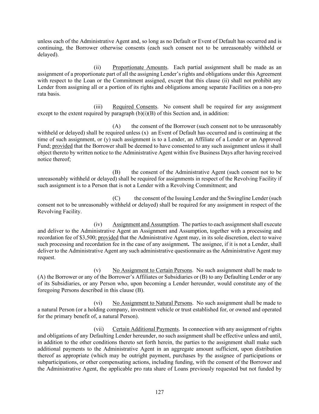 127 unless each of the Administrative Agent and, so long as no Default or Event of Default has occurred and is continuing, the Borrower otherwise consents (each such consent not to be unreasonably withheld or delayed). (ii) Proportionate Amounts. Each partial assignment shall be made as an assignment of a proportionate part of all the assigning Lender’s rights and obligations under this Agreement with respect to the Loan or the Commitment assigned, except that this clause (ii) shall not prohibit any Lender from assigning all or a portion of its rights and obligations among separate Facilities on a non-pro rata basis. (iii) Required Consents. No consent shall be required for any assignment except to the extent required by paragraph (b)(i)(B) of this Section and, in addition: (A) the consent of the Borrower (such consent not to be unreasonably withheld or delayed) shall be required unless (x) an Event of Default has occurred and is continuing at the time of such assignment, or (y) such assignment is to a Lender, an Affiliate of a Lender or an Approved Fund; provided that the Borrower shall be deemed to have consented to any such assignment unless it shall object thereto by written notice to the Administrative Agent within five Business Days after having received notice thereof; (B) the consent of the Administrative Agent (such consent not to be unreasonably withheld or delayed) shall be required for assignments in respect of the Revolving Facility if such assignment is to a Person that is not a Lender with a Revolving Commitment; and (C) the consent of the Issuing Lender and the Swingline Lender (such consent not to be unreasonably withheld or delayed) shall be required for any assignment in respect of the Revolving Facility. (iv) Assignment and Assumption. The parties to each assignment shall execute and deliver to the Administrative Agent an Assignment and Assumption, together with a processing and recordation fee of $3,500; provided that the Administrative Agent may, in its sole discretion, elect to waive such processing and recordation fee in the case of any assignment. The assignee, if it is not a Lender, shall deliver to the Administrative Agent any such administrative questionnaire as the Administrative Agent may request. (v) No Assignment to Certain Persons. No such assignment shall be made to (A) the Borrower or any of the Borrower’s Affiliates or Subsidiaries or (B) to any Defaulting Lender or any of its Subsidiaries, or any Person who, upon becoming a Lender hereunder, would constitute any of the foregoing Persons described in this clause (B). (vi) No Assignment to Natural Persons. No such assignment shall be made to a natural Person (or a holding company, investment vehicle or trust established for, or owned and operated for the primary benefit of, a natural Person). (vii) Certain Additional Payments. In connection with any assignment of rights and obligations of any Defaulting Lender hereunder, no such assignment shall be effective unless and until, in addition to the other conditions thereto set forth herein, the parties to the assignment shall make such additional payments to the Administrative Agent in an aggregate amount sufficient, upon distribution thereof as appropriate (which may be outright payment, purchases by the assignee of participations or subparticipations, or other compensating actions, including funding, with the consent of the Borrower and the Administrative Agent, the applicable pro rata share of Loans previously requested but not funded by