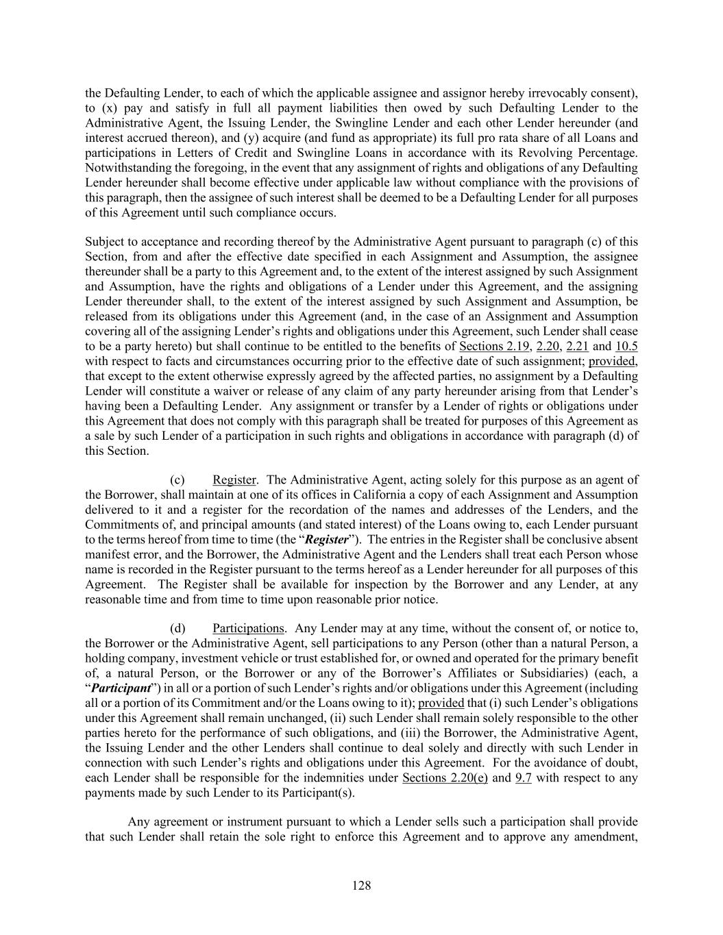 128 the Defaulting Lender, to each of which the applicable assignee and assignor hereby irrevocably consent), to (x) pay and satisfy in full all payment liabilities then owed by such Defaulting Lender to the Administrative Agent, the Issuing Lender, the Swingline Lender and each other Lender hereunder (and interest accrued thereon), and (y) acquire (and fund as appropriate) its full pro rata share of all Loans and participations in Letters of Credit and Swingline Loans in accordance with its Revolving Percentage. Notwithstanding the foregoing, in the event that any assignment of rights and obligations of any Defaulting Lender hereunder shall become effective under applicable law without compliance with the provisions of this paragraph, then the assignee of such interest shall be deemed to be a Defaulting Lender for all purposes of this Agreement until such compliance occurs. Subject to acceptance and recording thereof by the Administrative Agent pursuant to paragraph (c) of this Section, from and after the effective date specified in each Assignment and Assumption, the assignee thereunder shall be a party to this Agreement and, to the extent of the interest assigned by such Assignment and Assumption, have the rights and obligations of a Lender under this Agreement, and the assigning Lender thereunder shall, to the extent of the interest assigned by such Assignment and Assumption, be released from its obligations under this Agreement (and, in the case of an Assignment and Assumption covering all of the assigning Lender’s rights and obligations under this Agreement, such Lender shall cease to be a party hereto) but shall continue to be entitled to the benefits of Sections 2.19, 2.20, 2.21 and 10.5 with respect to facts and circumstances occurring prior to the effective date of such assignment; provided, that except to the extent otherwise expressly agreed by the affected parties, no assignment by a Defaulting Lender will constitute a waiver or release of any claim of any party hereunder arising from that Lender’s having been a Defaulting Lender. Any assignment or transfer by a Lender of rights or obligations under this Agreement that does not comply with this paragraph shall be treated for purposes of this Agreement as a sale by such Lender of a participation in such rights and obligations in accordance with paragraph (d) of this Section. (c) Register. The Administrative Agent, acting solely for this purpose as an agent of the Borrower, shall maintain at one of its offices in California a copy of each Assignment and Assumption delivered to it and a register for the recordation of the names and addresses of the Lenders, and the Commitments of, and principal amounts (and stated interest) of the Loans owing to, each Lender pursuant to the terms hereof from time to time (the “Register”). The entries in the Register shall be conclusive absent manifest error, and the Borrower, the Administrative Agent and the Lenders shall treat each Person whose name is recorded in the Register pursuant to the terms hereof as a Lender hereunder for all purposes of this Agreement. The Register shall be available for inspection by the Borrower and any Lender, at any reasonable time and from time to time upon reasonable prior notice. (d) Participations. Any Lender may at any time, without the consent of, or notice to, the Borrower or the Administrative Agent, sell participations to any Person (other than a natural Person, a holding company, investment vehicle or trust established for, or owned and operated for the primary benefit of, a natural Person, or the Borrower or any of the Borrower’s Affiliates or Subsidiaries) (each, a “Participant”) in all or a portion of such Lender’s rights and/or obligations under this Agreement (including all or a portion of its Commitment and/or the Loans owing to it); provided that (i) such Lender’s obligations under this Agreement shall remain unchanged, (ii) such Lender shall remain solely responsible to the other parties hereto for the performance of such obligations, and (iii) the Borrower, the Administrative Agent, the Issuing Lender and the other Lenders shall continue to deal solely and directly with such Lender in connection with such Lender’s rights and obligations under this Agreement. For the avoidance of doubt, each Lender shall be responsible for the indemnities under Sections 2.20(e) and 9.7 with respect to any payments made by such Lender to its Participant(s). Any agreement or instrument pursuant to which a Lender sells such a participation shall provide that such Lender shall retain the sole right to enforce this Agreement and to approve any amendment,