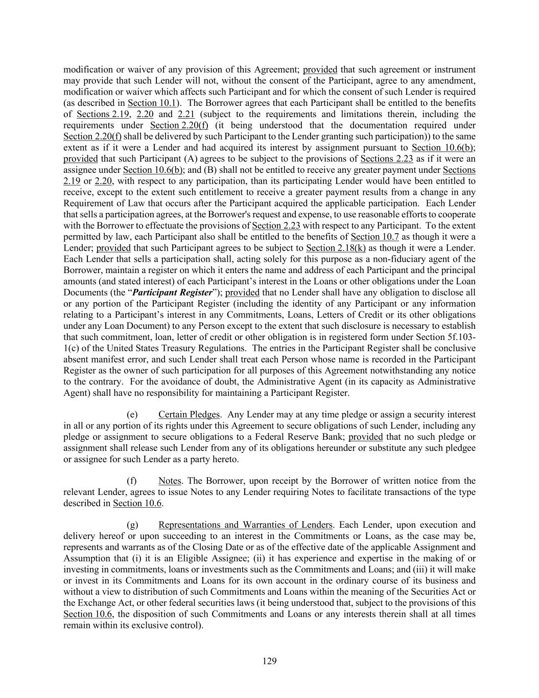 129 modification or waiver of any provision of this Agreement; provided that such agreement or instrument may provide that such Lender will not, without the consent of the Participant, agree to any amendment, modification or waiver which affects such Participant and for which the consent of such Lender is required (as described in Section 10.1). The Borrower agrees that each Participant shall be entitled to the benefits of Sections 2.19, 2.20 and 2.21 (subject to the requirements and limitations therein, including the requirements under Section 2.20(f) (it being understood that the documentation required under Section 2.20(f) shall be delivered by such Participant to the Lender granting such participation)) to the same extent as if it were a Lender and had acquired its interest by assignment pursuant to Section 10.6(b); provided that such Participant (A) agrees to be subject to the provisions of Sections 2.23 as if it were an assignee under Section 10.6(b); and (B) shall not be entitled to receive any greater payment under Sections 2.19 or 2.20, with respect to any participation, than its participating Lender would have been entitled to receive, except to the extent such entitlement to receive a greater payment results from a change in any Requirement of Law that occurs after the Participant acquired the applicable participation. Each Lender that sells a participation agrees, at the Borrower's request and expense, to use reasonable efforts to cooperate with the Borrower to effectuate the provisions of Section 2.23 with respect to any Participant. To the extent permitted by law, each Participant also shall be entitled to the benefits of Section 10.7 as though it were a Lender; provided that such Participant agrees to be subject to Section 2.18(k) as though it were a Lender. Each Lender that sells a participation shall, acting solely for this purpose as a non-fiduciary agent of the Borrower, maintain a register on which it enters the name and address of each Participant and the principal amounts (and stated interest) of each Participant’s interest in the Loans or other obligations under the Loan Documents (the “Participant Register”); provided that no Lender shall have any obligation to disclose all or any portion of the Participant Register (including the identity of any Participant or any information relating to a Participant’s interest in any Commitments, Loans, Letters of Credit or its other obligations under any Loan Document) to any Person except to the extent that such disclosure is necessary to establish that such commitment, loan, letter of credit or other obligation is in registered form under Section 5f.103- 1(c) of the United States Treasury Regulations. The entries in the Participant Register shall be conclusive absent manifest error, and such Lender shall treat each Person whose name is recorded in the Participant Register as the owner of such participation for all purposes of this Agreement notwithstanding any notice to the contrary. For the avoidance of doubt, the Administrative Agent (in its capacity as Administrative Agent) shall have no responsibility for maintaining a Participant Register. (e) Certain Pledges. Any Lender may at any time pledge or assign a security interest in all or any portion of its rights under this Agreement to secure obligations of such Lender, including any pledge or assignment to secure obligations to a Federal Reserve Bank; provided that no such pledge or assignment shall release such Lender from any of its obligations hereunder or substitute any such pledgee or assignee for such Lender as a party hereto. (f) Notes. The Borrower, upon receipt by the Borrower of written notice from the relevant Lender, agrees to issue Notes to any Lender requiring Notes to facilitate transactions of the type described in Section 10.6. (g) Representations and Warranties of Lenders. Each Lender, upon execution and delivery hereof or upon succeeding to an interest in the Commitments or Loans, as the case may be, represents and warrants as of the Closing Date or as of the effective date of the applicable Assignment and Assumption that (i) it is an Eligible Assignee; (ii) it has experience and expertise in the making of or investing in commitments, loans or investments such as the Commitments and Loans; and (iii) it will make or invest in its Commitments and Loans for its own account in the ordinary course of its business and without a view to distribution of such Commitments and Loans within the meaning of the Securities Act or the Exchange Act, or other federal securities laws (it being understood that, subject to the provisions of this Section 10.6, the disposition of such Commitments and Loans or any interests therein shall at all times remain within its exclusive control).